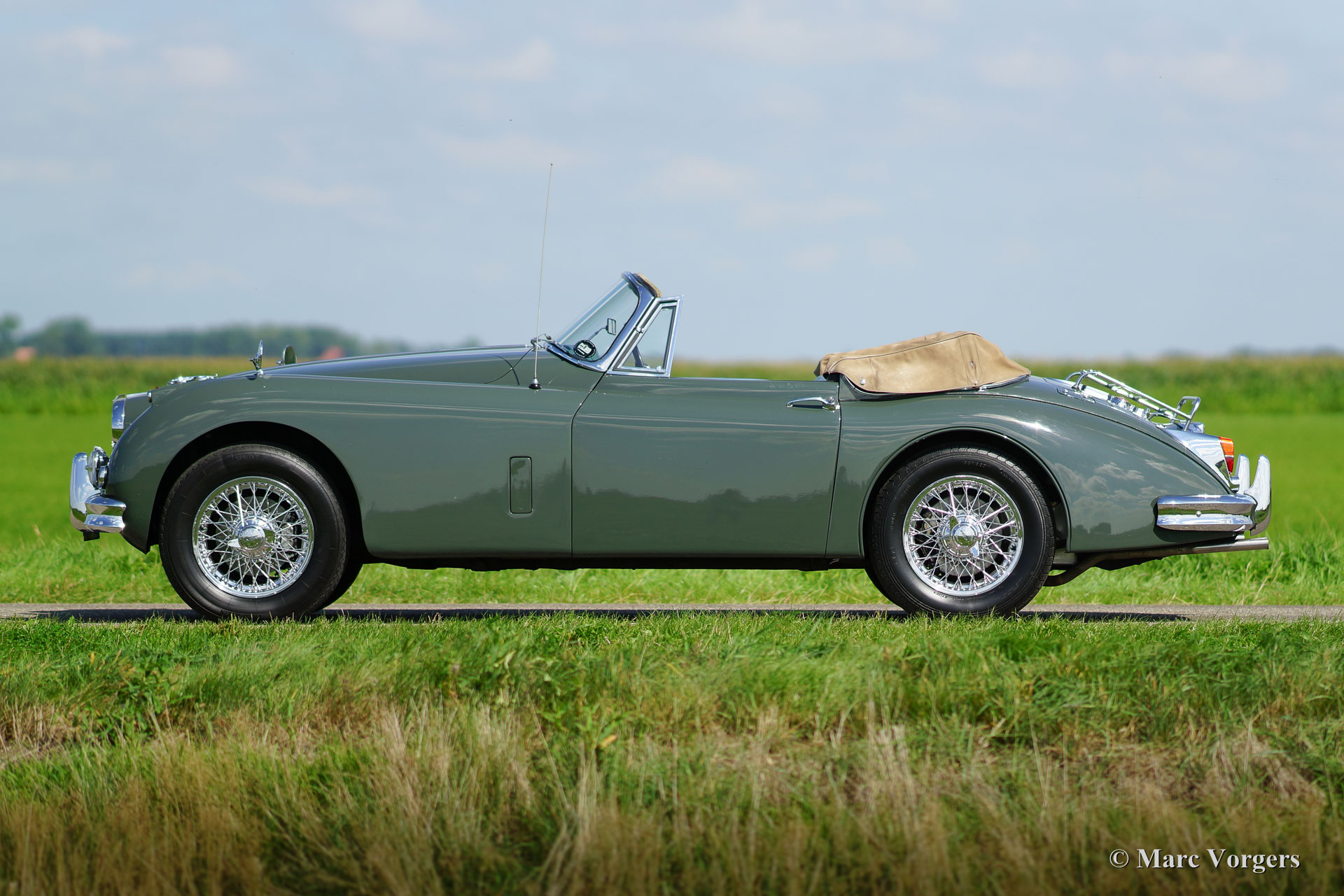 Jaguar XK 150 3.8 Litre Drophead Coupe (DHC), year 1960. Colour ‘Sherwood’ green with a green leather interior and pale green carpet. The car is fitted with a beige mohair hood and hood cover. This tremendous Jaguar XK 150 3.8 Litre DHC is VERY original and the car has ‘matching numbers’. The car has driven only 73.000 miles from new! This XK 150 is in very good to excellent ORIGINAL condition! Very special and rare. The perfect bodywork was given new paint in the past. The interior and all the other parts are original; even the original tool set is present. This XK 150 DHC is a rare 3.8 Litre model. The automobile comes with a lot of history, invoices and photographs which have been cherished like the car itself. The last Dutch owner had the car in his possession for over twenty years. The Jaguar features chrome wire wheels, AVON tyres and, very convenient, EZ electric power steering. This is a rare opportunity to become the owner of a superbly driving, very original and rare Jaguar XK 150 3.8 Litre DHC!