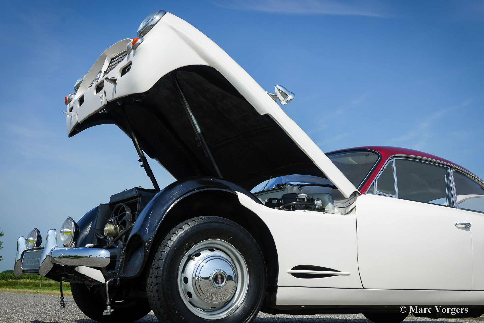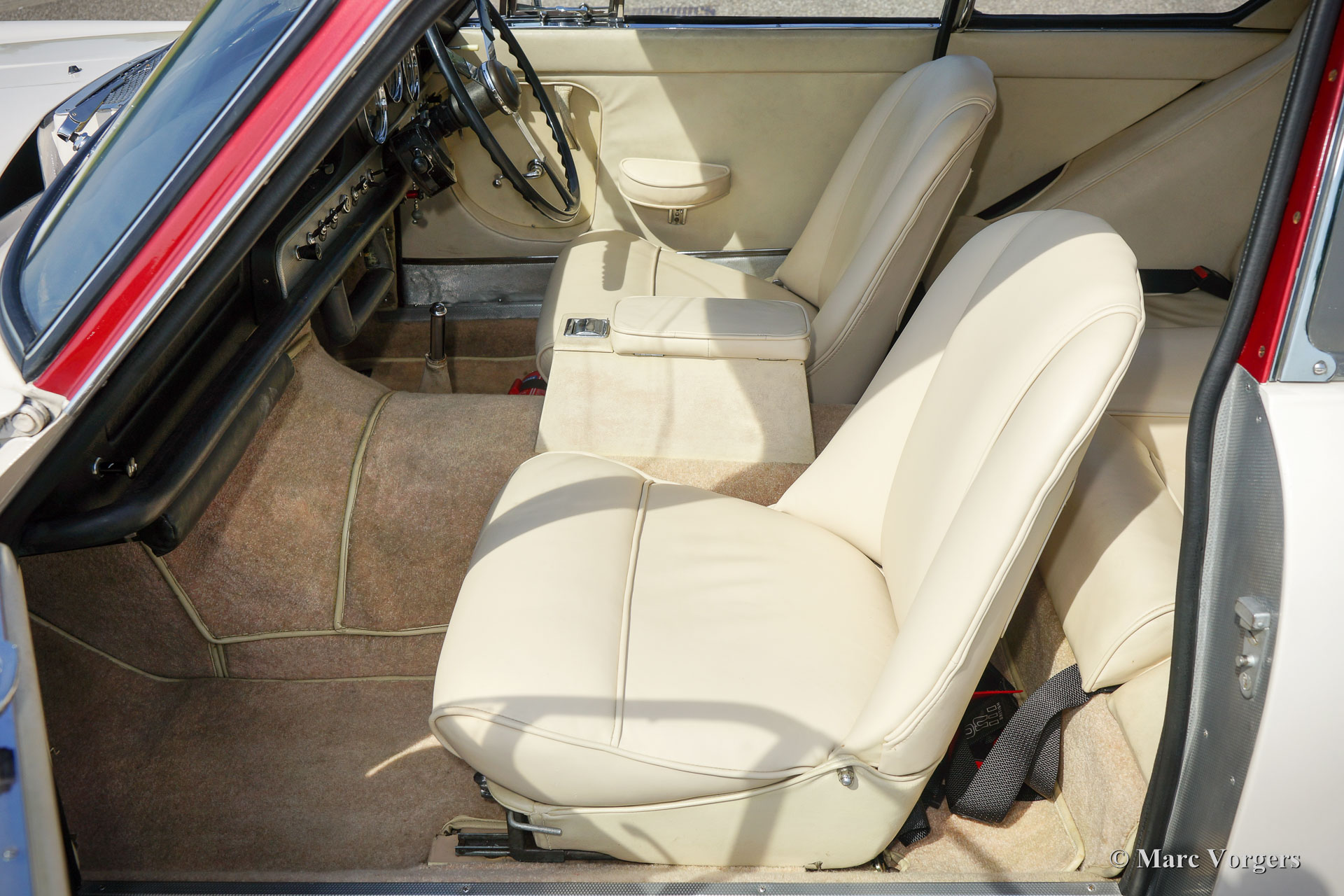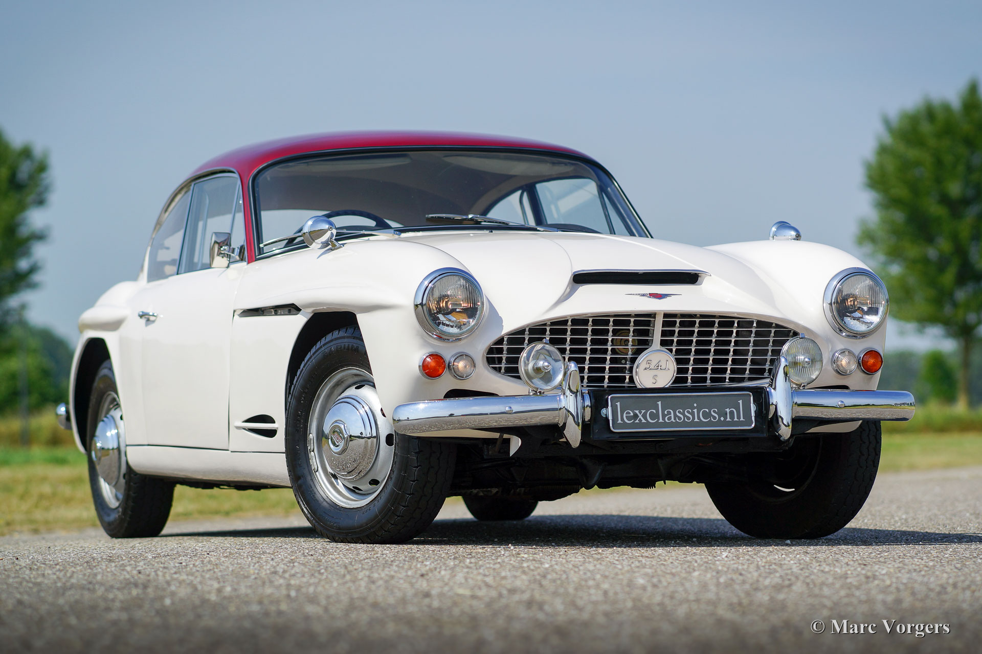 Jensen 541 S, year 1961. Colour white with a red metallic roof-top. Light beige (Magnolia) leather upholstery and beige carpet. This gorgeous and rare Jensen 541 S was restored in Great Britain in the past. Invoices concerning the restoration are present. The automobile is in very good and beautiful condition and the car shows off all the original details. The Jensen 541 S features a big Austin 3993 cc Austin six cylinder in-line engine with a magnificent engine sound. The power is being transmitted to the rear wheels via a Rolls-Royce Hydramatic 4-speed automatic gearbox. The Jensen 541 S is a very rare car as stated above, only 127 cars were built of which 20 were fitted with a manually operated gearbox and 107 cars featured the Rolls Royce Hydramatic. The Jensen 541 S features a steel chassis with a glass fibre reinforced plastic (GRP) bodywork, this in the tradition of many post-war small British sports car manufacturers. With a Jensen 541 S you don’t drive incognito; a real head-turner it is and a special piece of British car history!