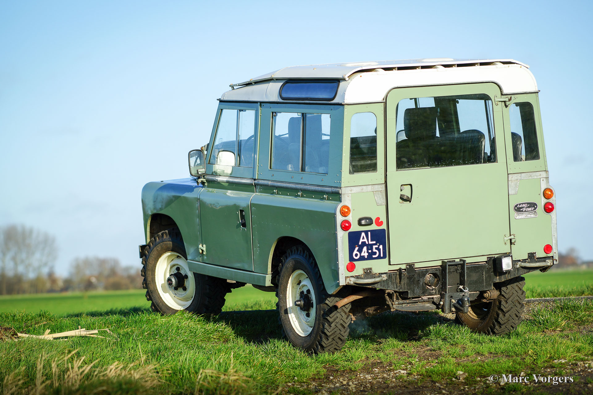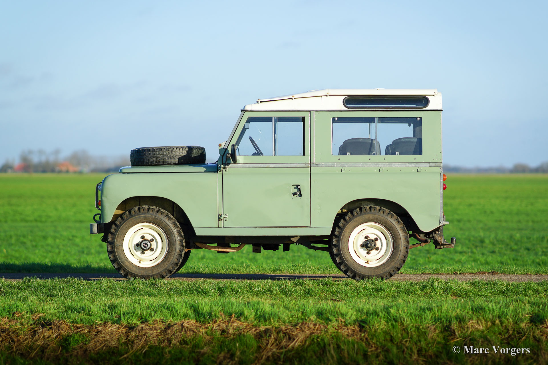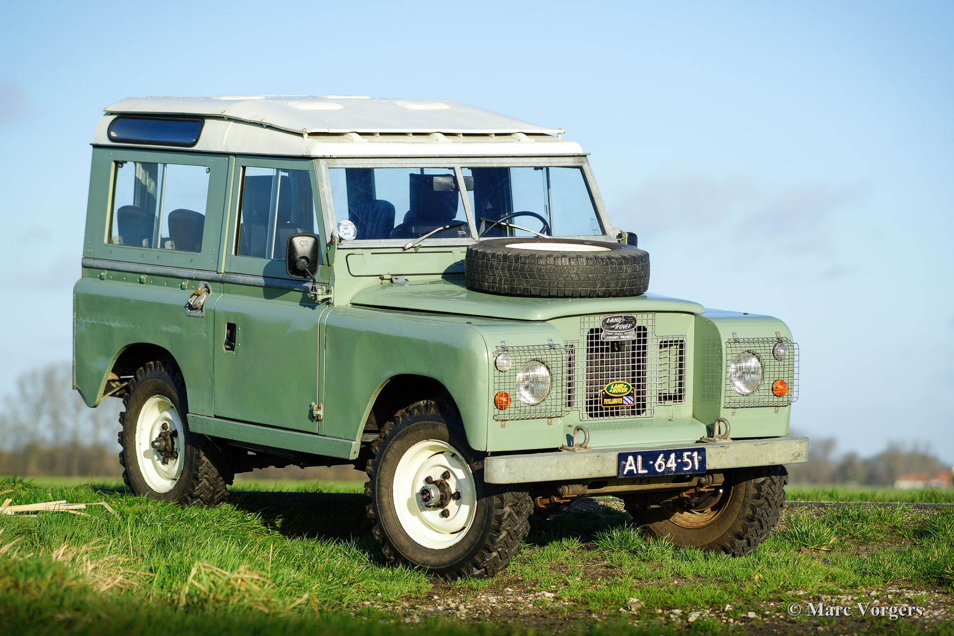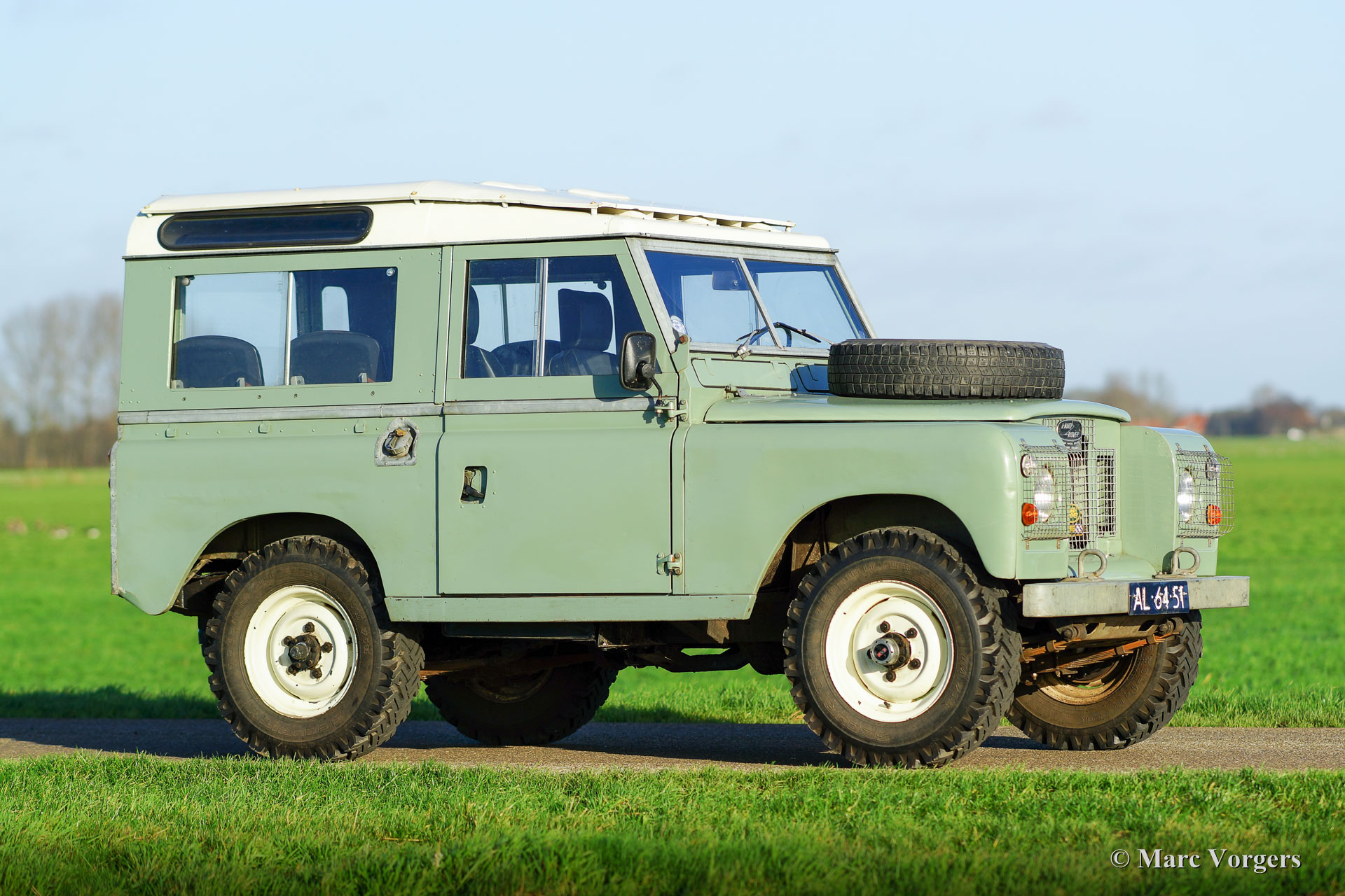 Land Rover type 88a, year 1971. Exterior colour light grey/green, interior with black vinyl upholstery. This tremendous and rugged classic Land Rover drove only 43314 kilometres from new. The car is in very good and super original condition throughout and absolutely rust free! This Land Rover was sold new in Switzerland. The car knew only three owners from new. This is a sought after short wheelbase model with safari roof and seven seats. The car features a sophisticated petrol engine and a tow-bar. The car is sold complete with tool set and maintenance books. Also invoices of recent service are at hand. This is a very original Land Rover, these cars are hard to find in this condition!