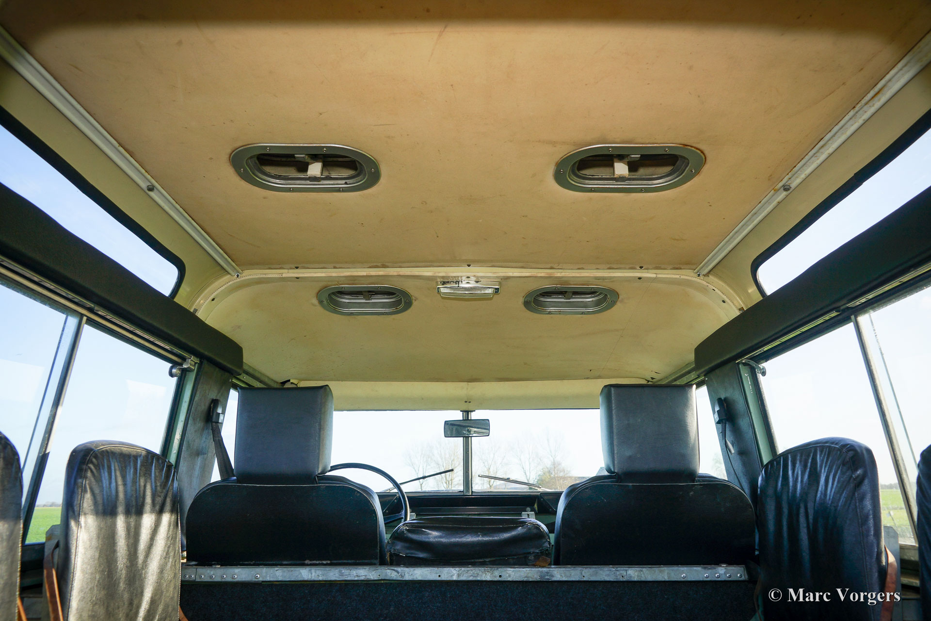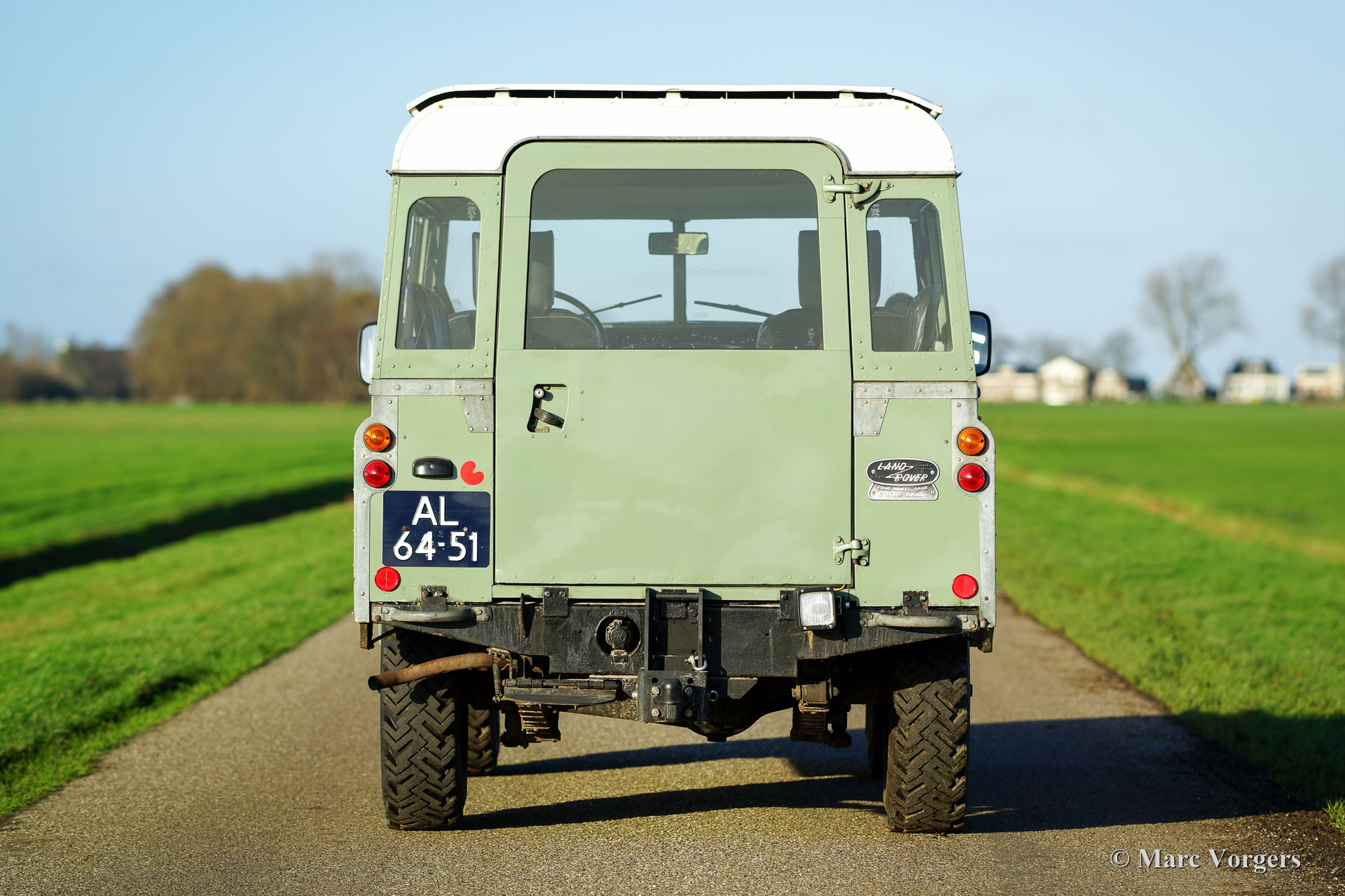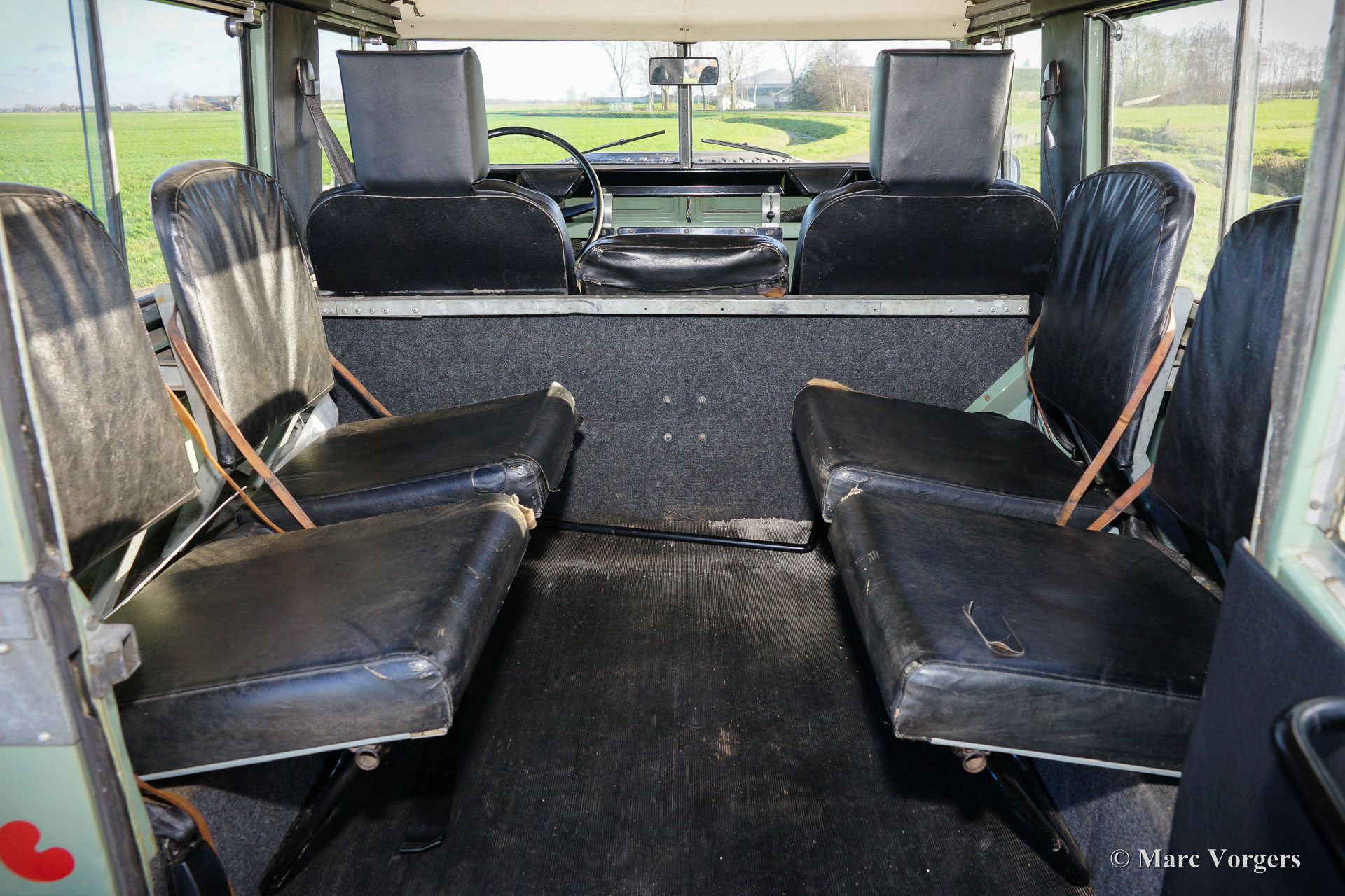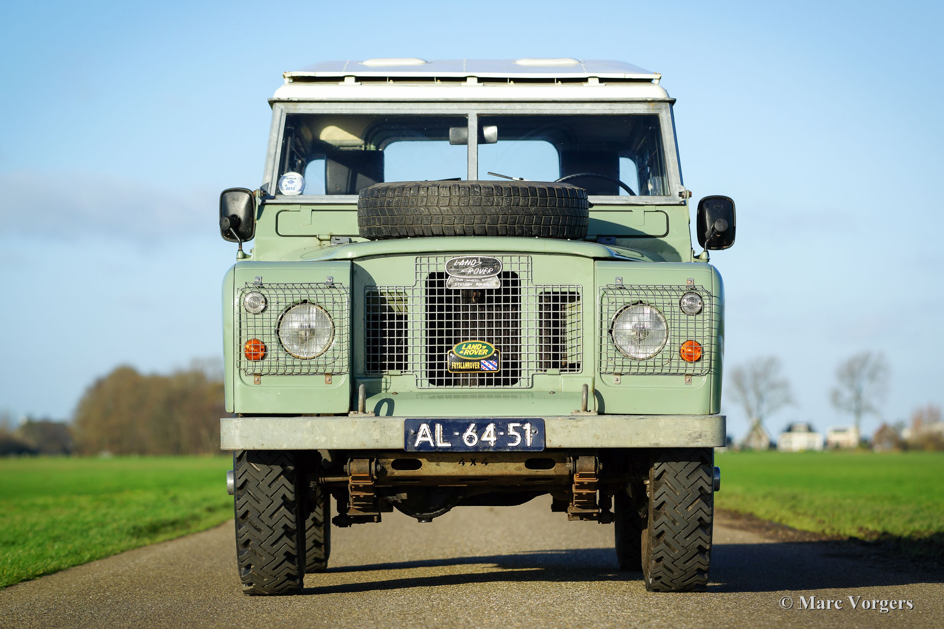 Land Rover type 88a, year 1971. Exterior colour light grey/green, interior with black vinyl upholstery. This tremendous and rugged classic Land Rover drove only 43314 kilometres from new. The car is in very good and super original condition throughout and absolutely rust free! This Land Rover was sold new in Switzerland. The car knew only three owners from new. This is a sought after short wheelbase model with safari roof and seven seats. The car features a sophisticated petrol engine and a tow-bar. The car is sold complete with tool set and maintenance books. Also invoices of recent service are at hand. This is a very original Land Rover, these cars are hard to find in this condition!