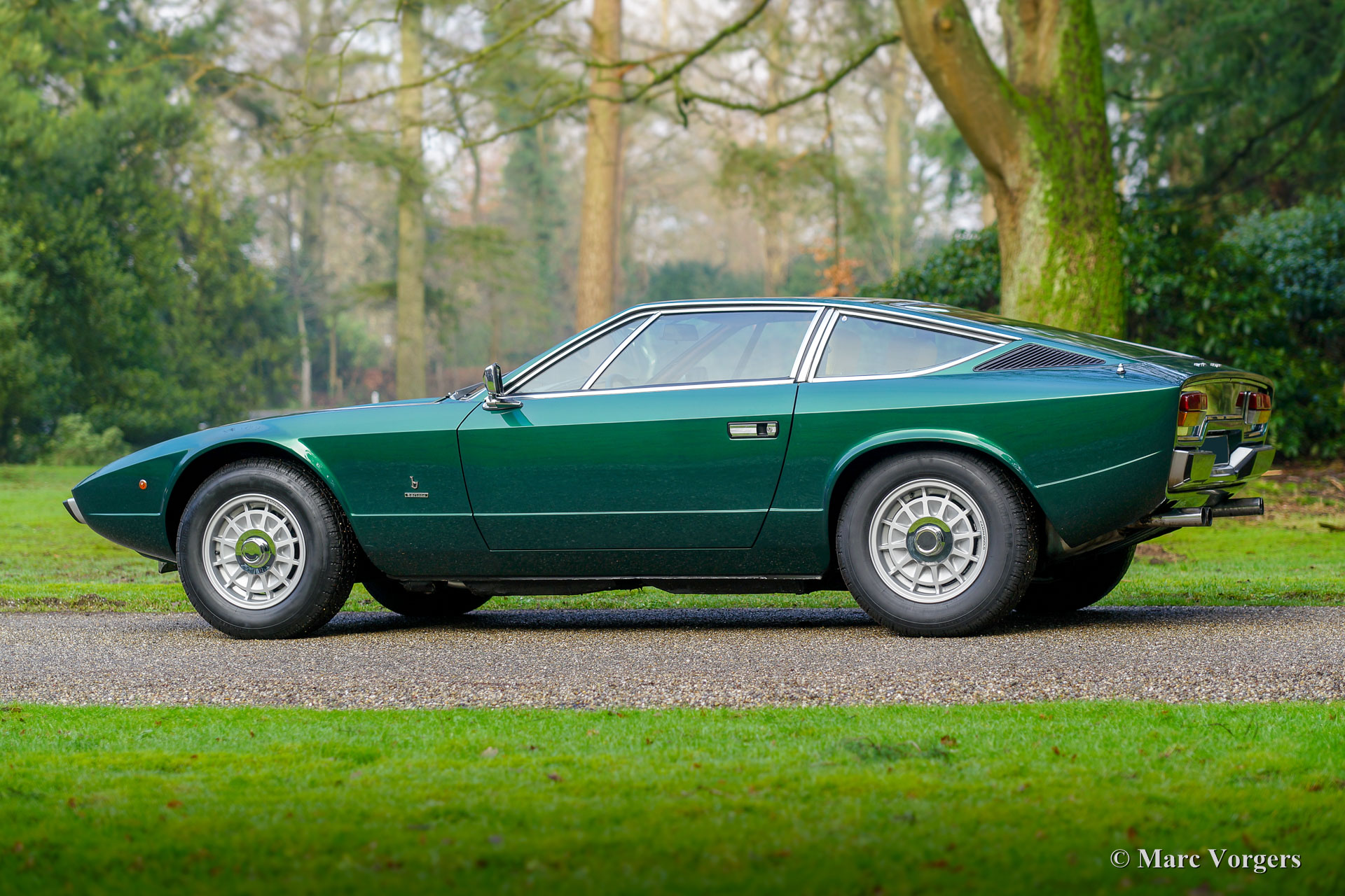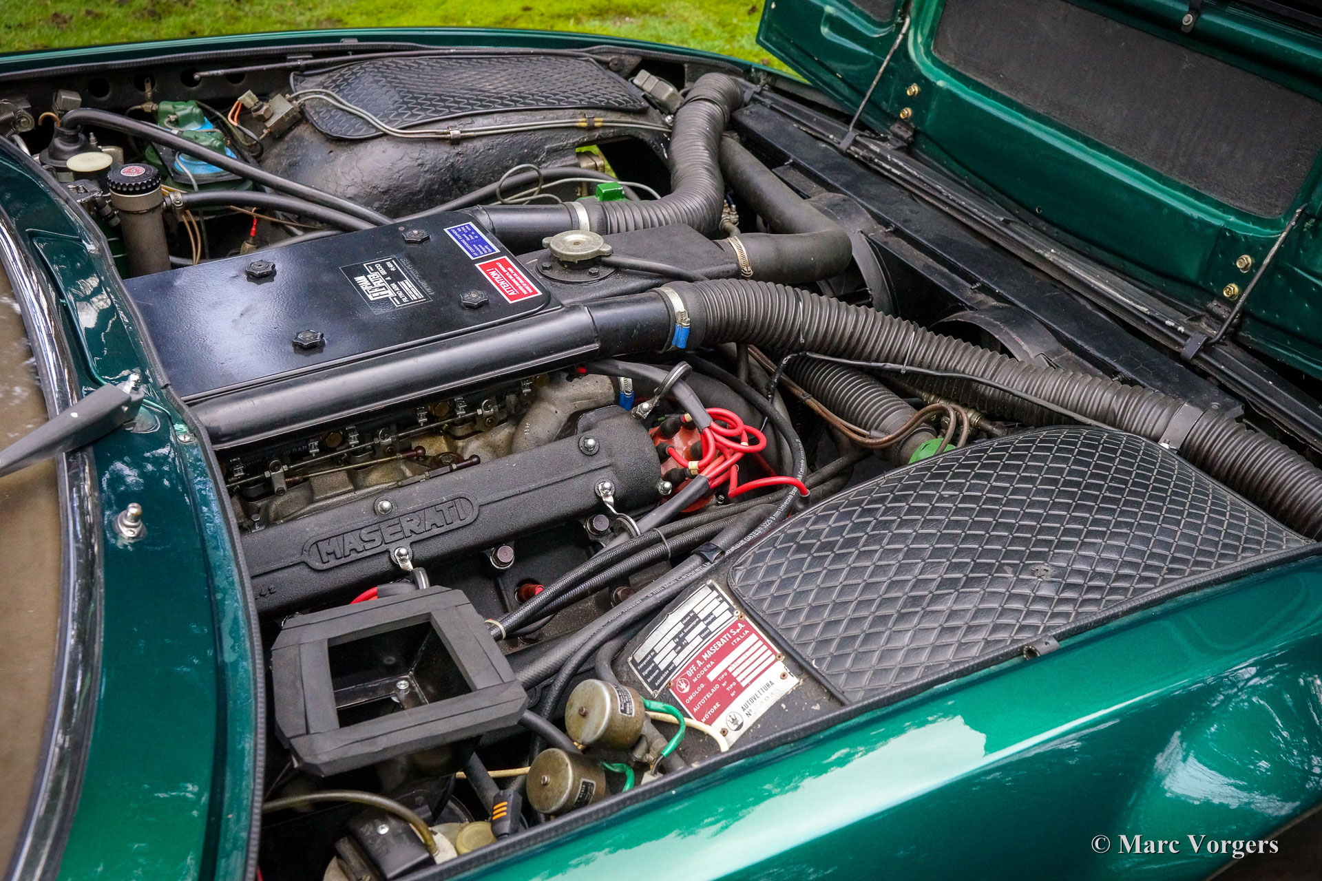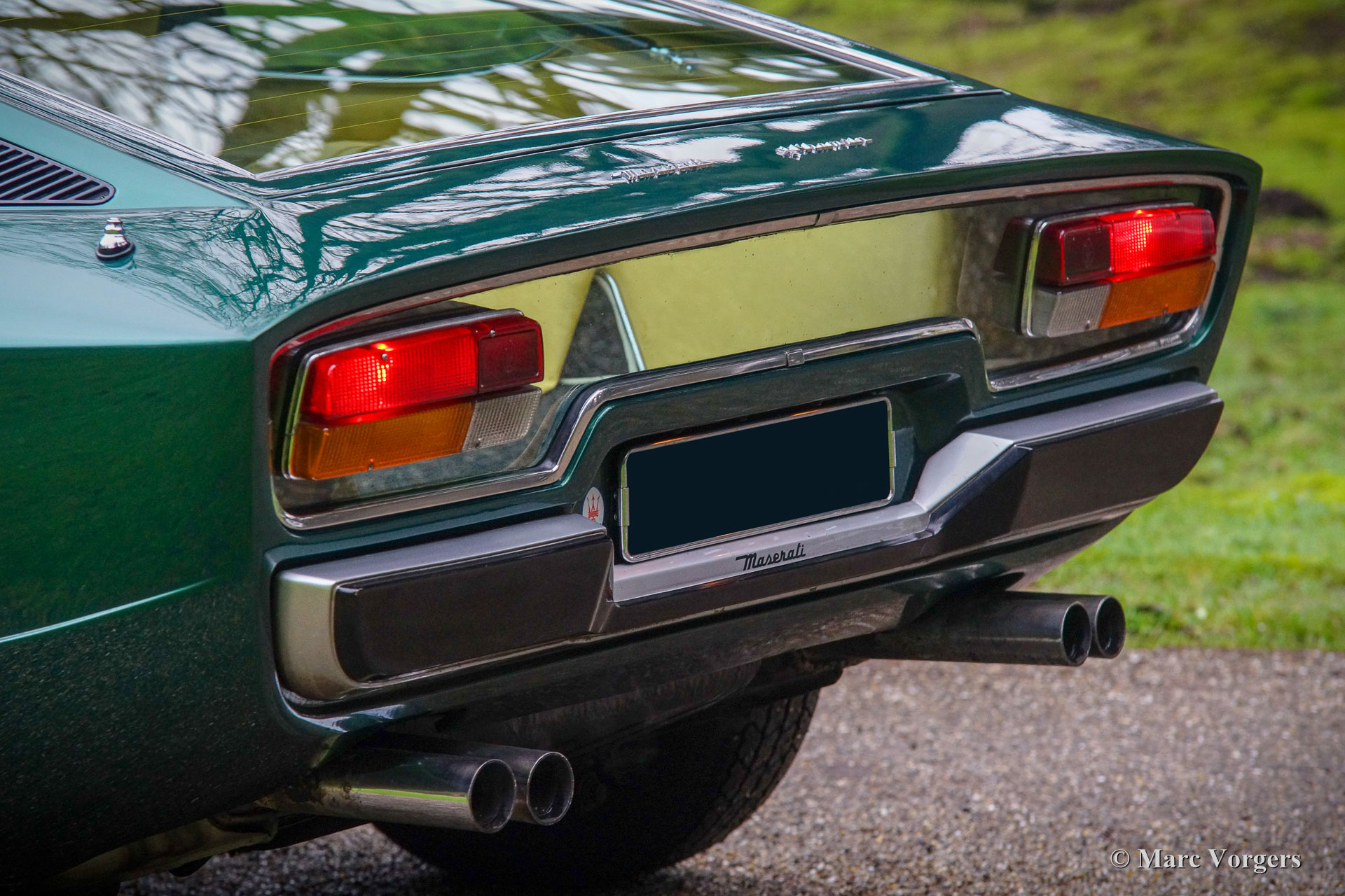 Maserati Khamsin, year 1974. Colour green metallic with a dark beige leather interior, a brown Alcantara dash-top and black carpet with beige edge trimmings. This fabulous Maserati Khamsin is one of the only 430 specimens ever built. A magnificent looking and rare sports car! This Maserati was ordered by an inhabitant of the United Arab Emirates and it was delivered new to the United Kingdom. This Khamsin is a European model from the sought-after first series. The following owner lived in Germany and from 1986 the car was registered in Sweden. In Sweden the car was meticulously restored in the years 2005 – 2007. An extensive restoration file is present. The automobile was purchased by a Dutchman in the year 2014. In 2016 the car participated in the 12th Antwerp Concours d’ Élégance, which was held in the grounds of Castle Belvedère, where the Khamsin was a worthy prize winner! This fine Maserati Khamsin is in superb top condition and the car drives superbly! You probably know that Maserati was owned by Citroën in the 1970ies. The Khamsin was designed and built with advanced hydraulic systems of the legendary Citroën SM like the very effective hydraulic brakes and the power steering system. This Khamsin was factory fitted with the desirable ZF manual gearbox. The automobile comes complete with the original tool-set (in a beautiful tool-roll), the original crick and a splendid period Blaupunkt radio with ‘speech-recording’ functionality. Also, the original owners’ manual is present (in a gorgeous leather folder) and the original boot cover in beige leather. This is a fantastic top-example!
