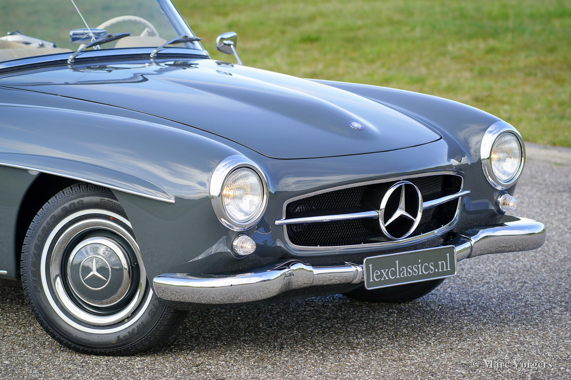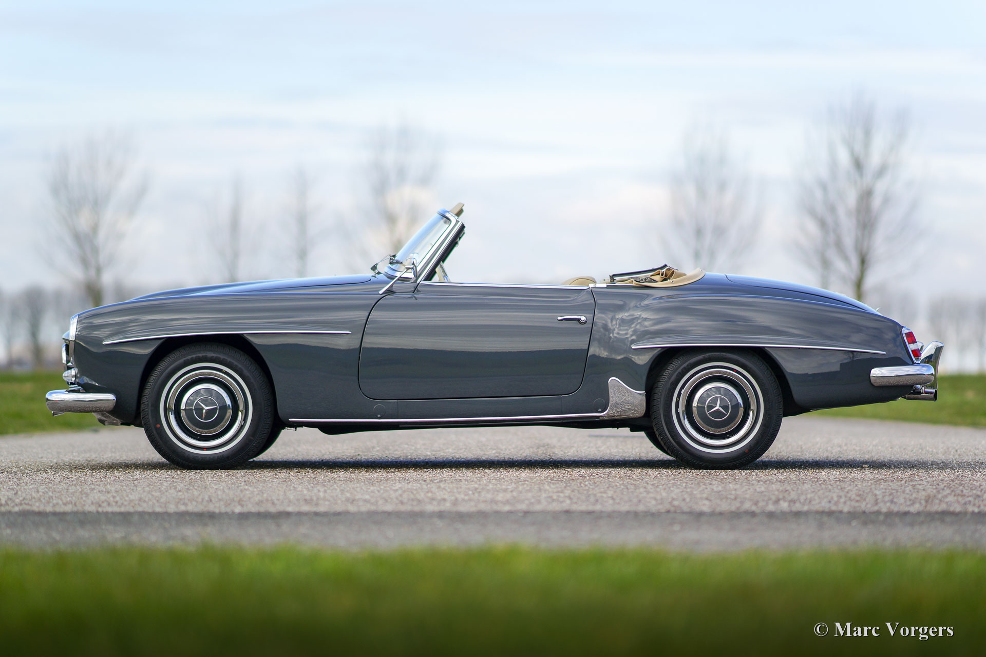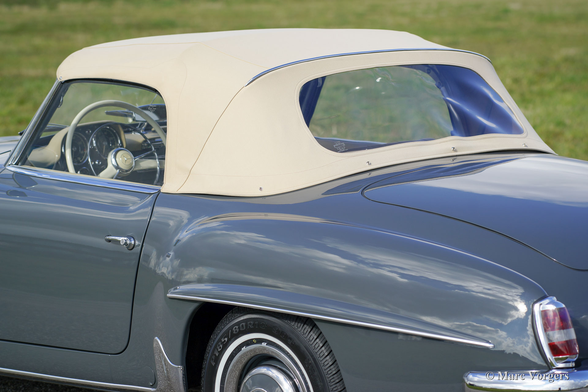 Mercedes 190 SL, year 1958. Colour Graphite grey with a beige leather interior and a beige soft-top. This magnificent Mercedes-Benz 190 SL was imported from the USA to the Netherlands in the year 2013. Then a thorough ‘nut and bolt’ restoration started. The car has been restored with many new parts and the majority of the mechanical parts have been overhauled by a specialist firm. The automobile is in superb top condition, concourse, and the car drives perfectly!
