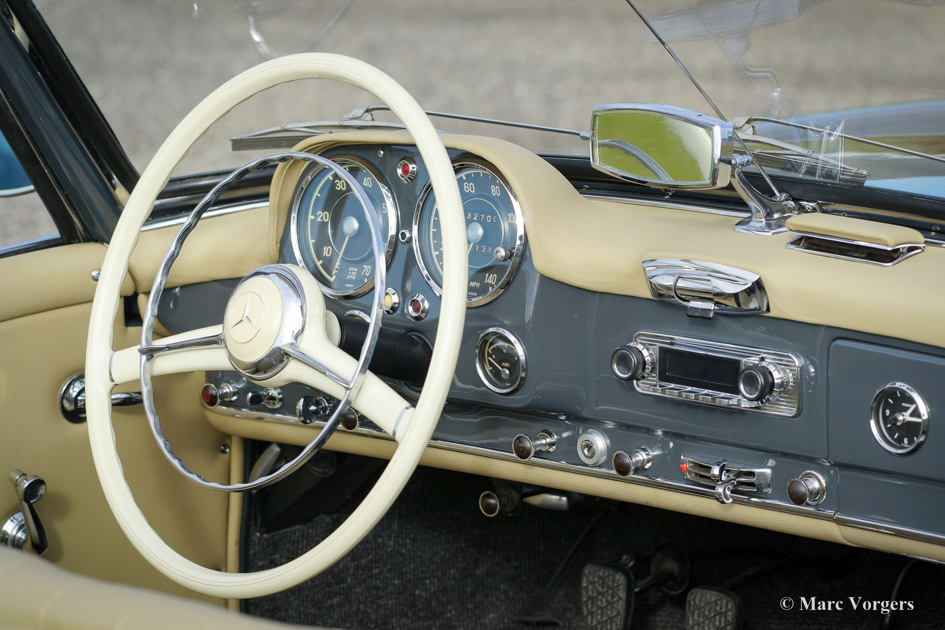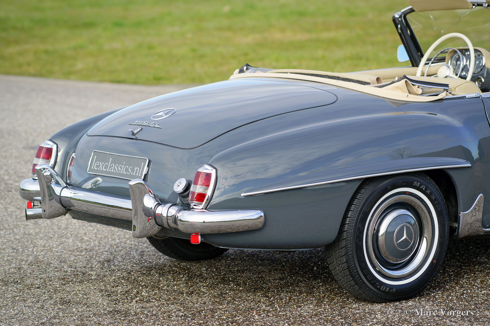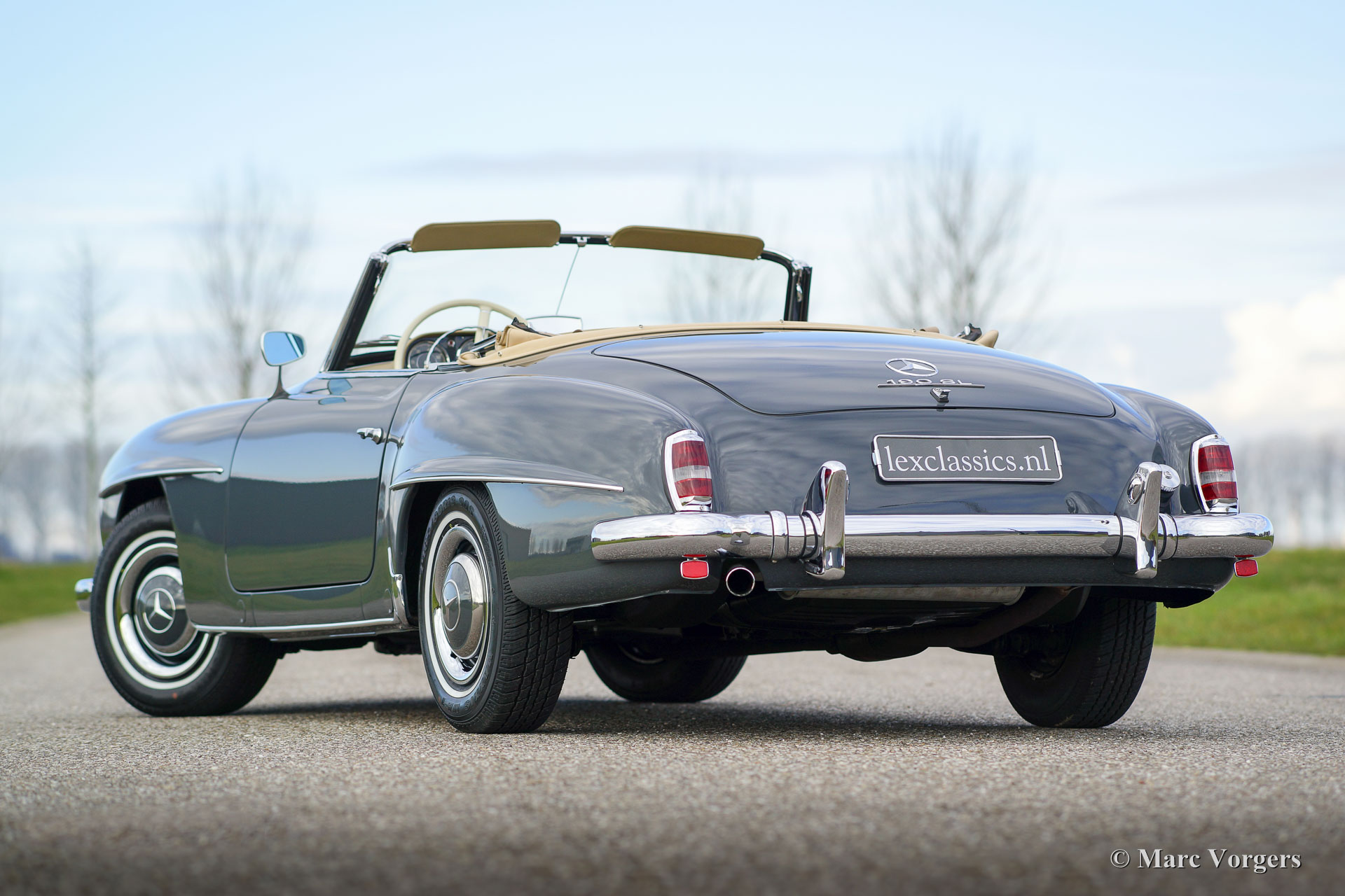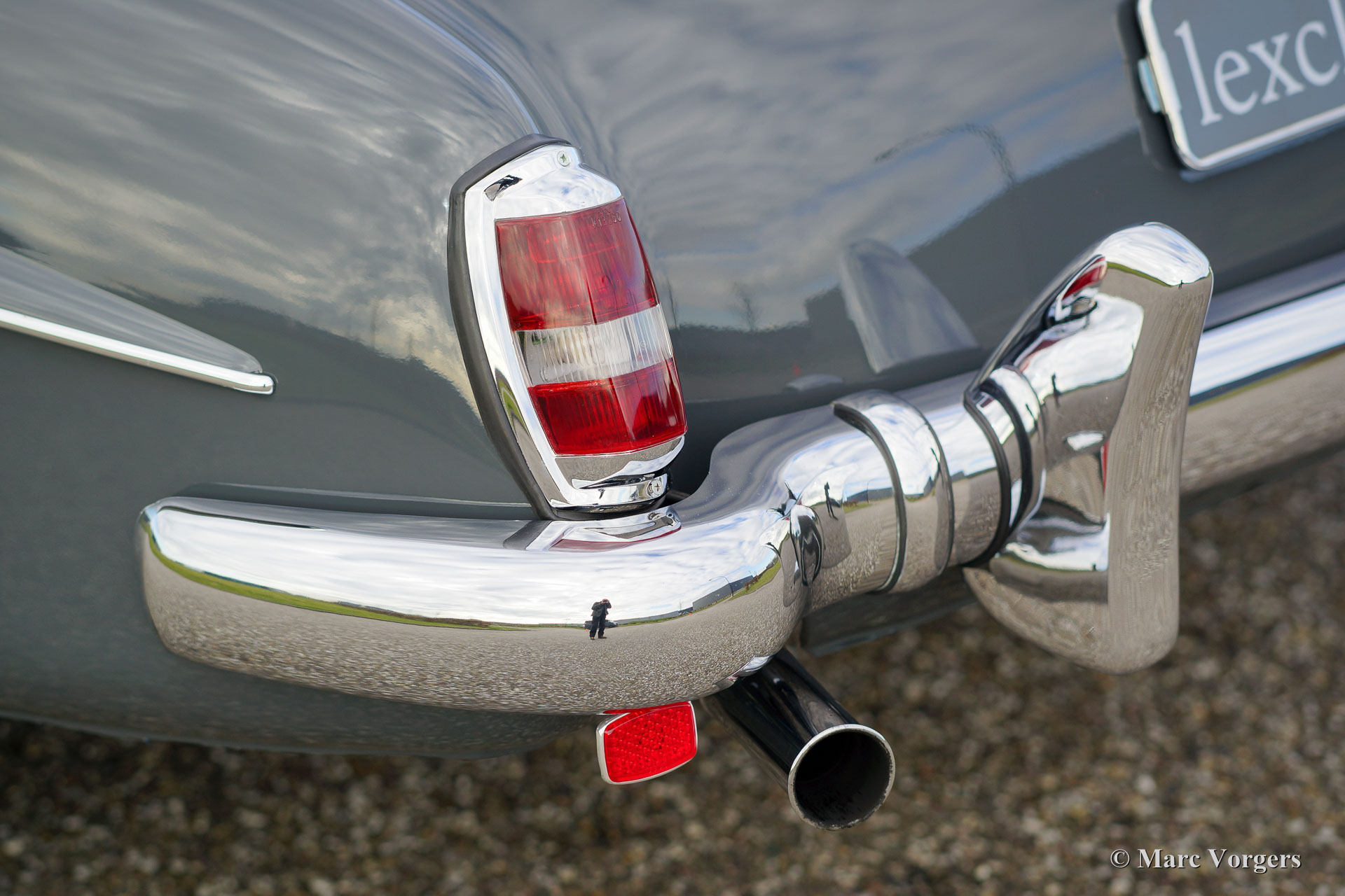 The Mercedes-Benz 190 SL roadster saw the light of day in the year 1955 impersonating a less expensive and less advanced alternative for the 300 SL roadster. Technically the 190 SL roadster shared nothing with big brother 300 SL. But the bodywork design and interior design, which appealed to many people, were strongly inspired by the 300 SL roadster. The Mercedes-Benz 190 SL was a real touring-convertible in opposite to the 300 SL roadster which was a true sports car. But the 190 SL was affordable (to Mercedes-Benz standards) and the car found a great share of enthusiastic owners primarily in the sunny states of the USA. The sales success of the 190 SL was based on the good looks of the car but also because of the excellent comfort, the excellent mechanics and its reliability. The Mercedes-Benz 190 SL was equipped with a four-cylinder engine with a cylinder capacity of 1897 cc. and fitted with two carburettors. The standard four-speed manual gearbox was fully synchronized and featured floor shift. From 1956 on the 190 SL was fitted with standard power brakes. During the entire period of production a very nice hardtop was available. The story goes that many European owner ordered the roadster with the hardtop and hardly ever took it off! In the year 1963 the 190 SL was succeeded by the new Mercedes-Benz 230 SL roadster which was going to be known by the nickname "Pagoda".