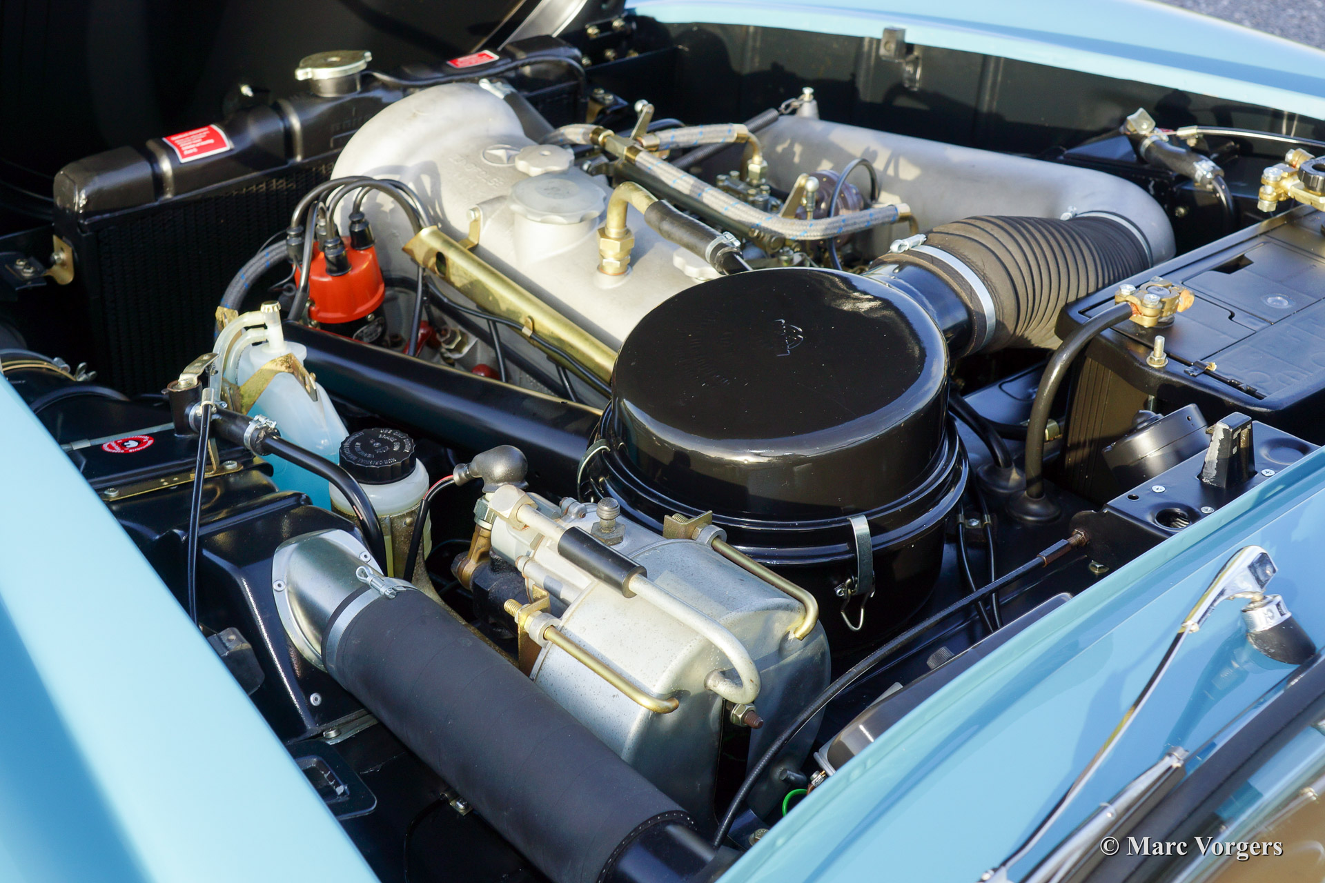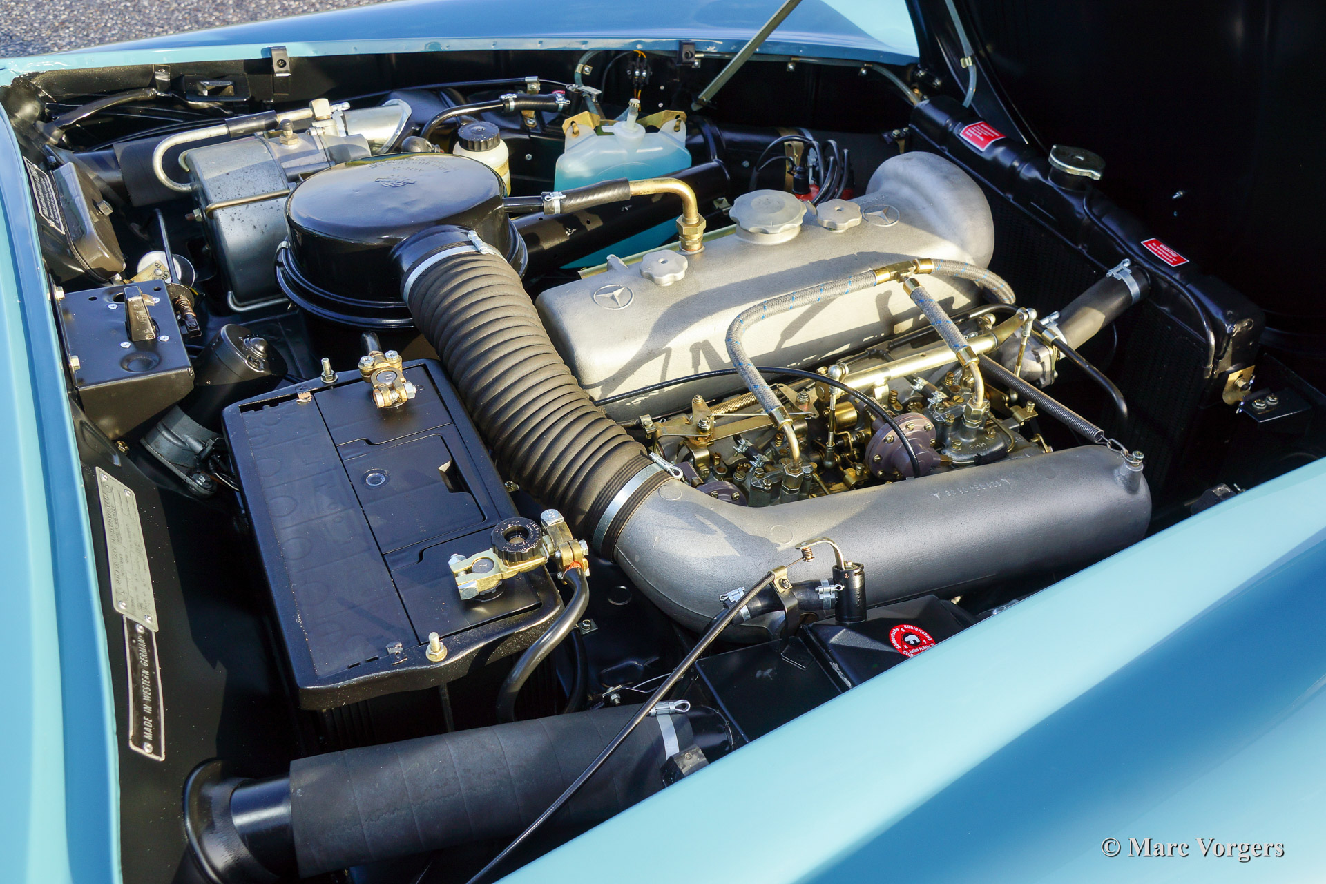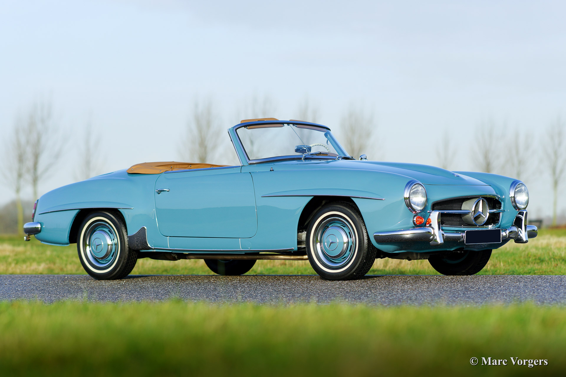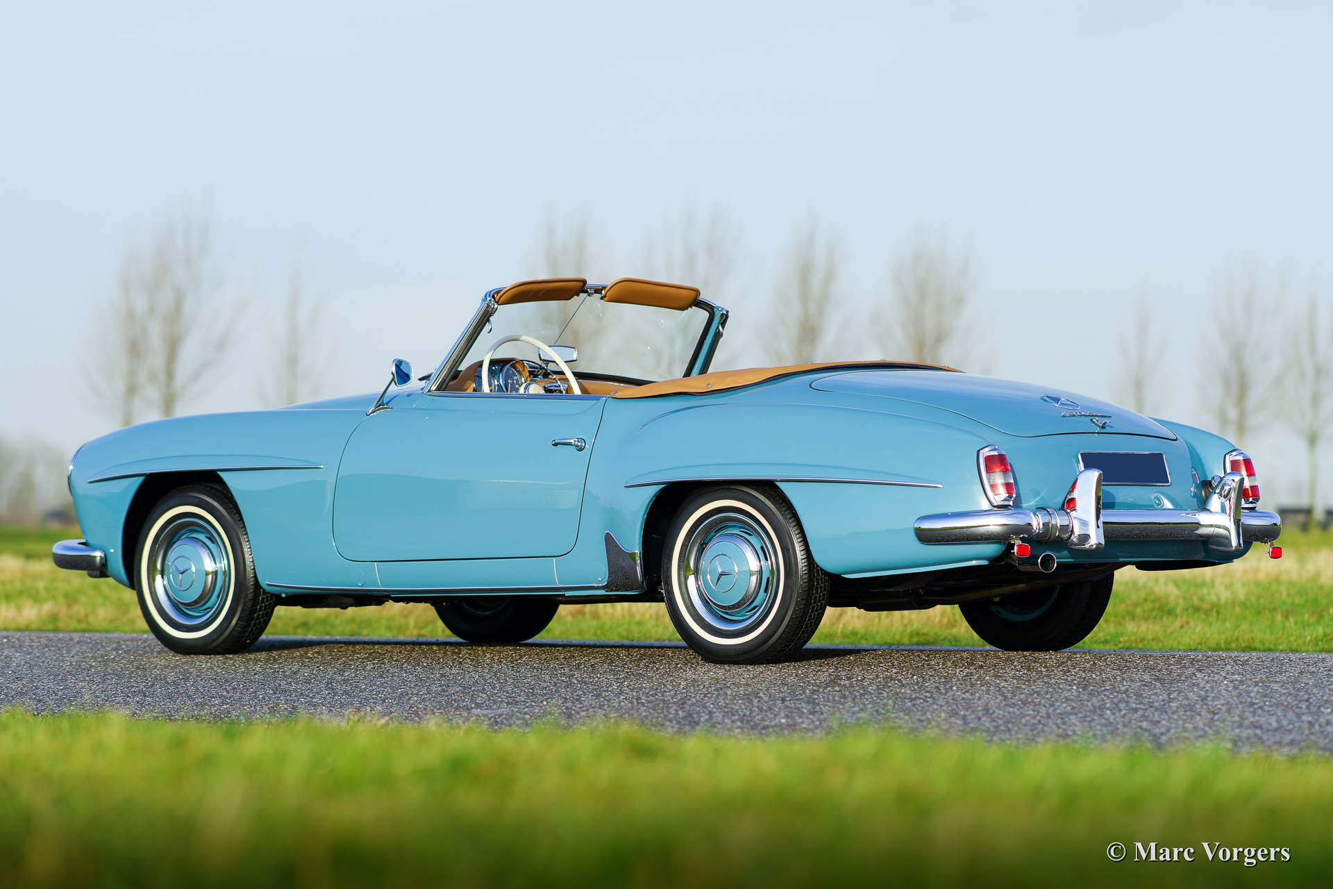 Mercedes-Benz 190 SL, year 1959. Chassis number: 1210429500XXX. Body colour 'Hell Blau' with a beige leather interior, grey rubber carpet and a dark blue mohair soft top. This magnificent 190 SL was sold new in the USA. The automobile was imported to the Netherlands in the year 2004.