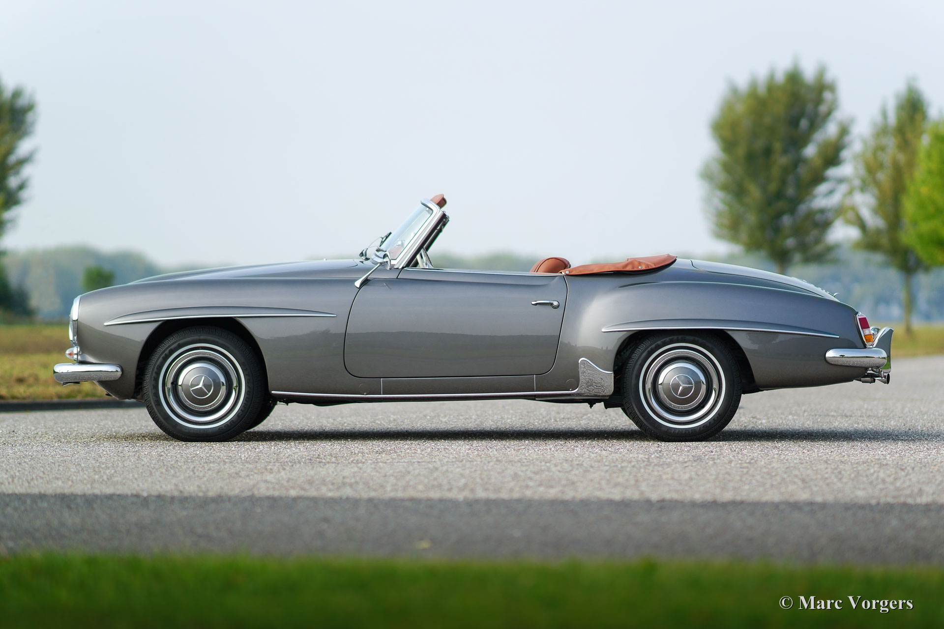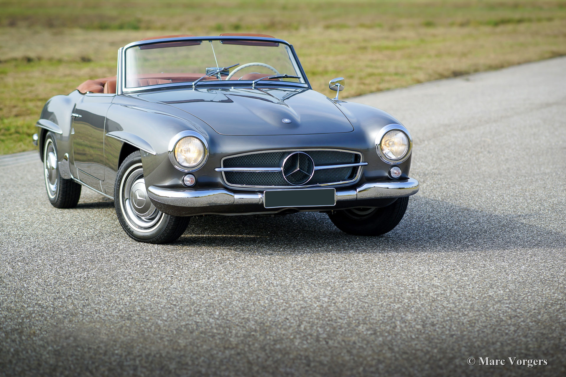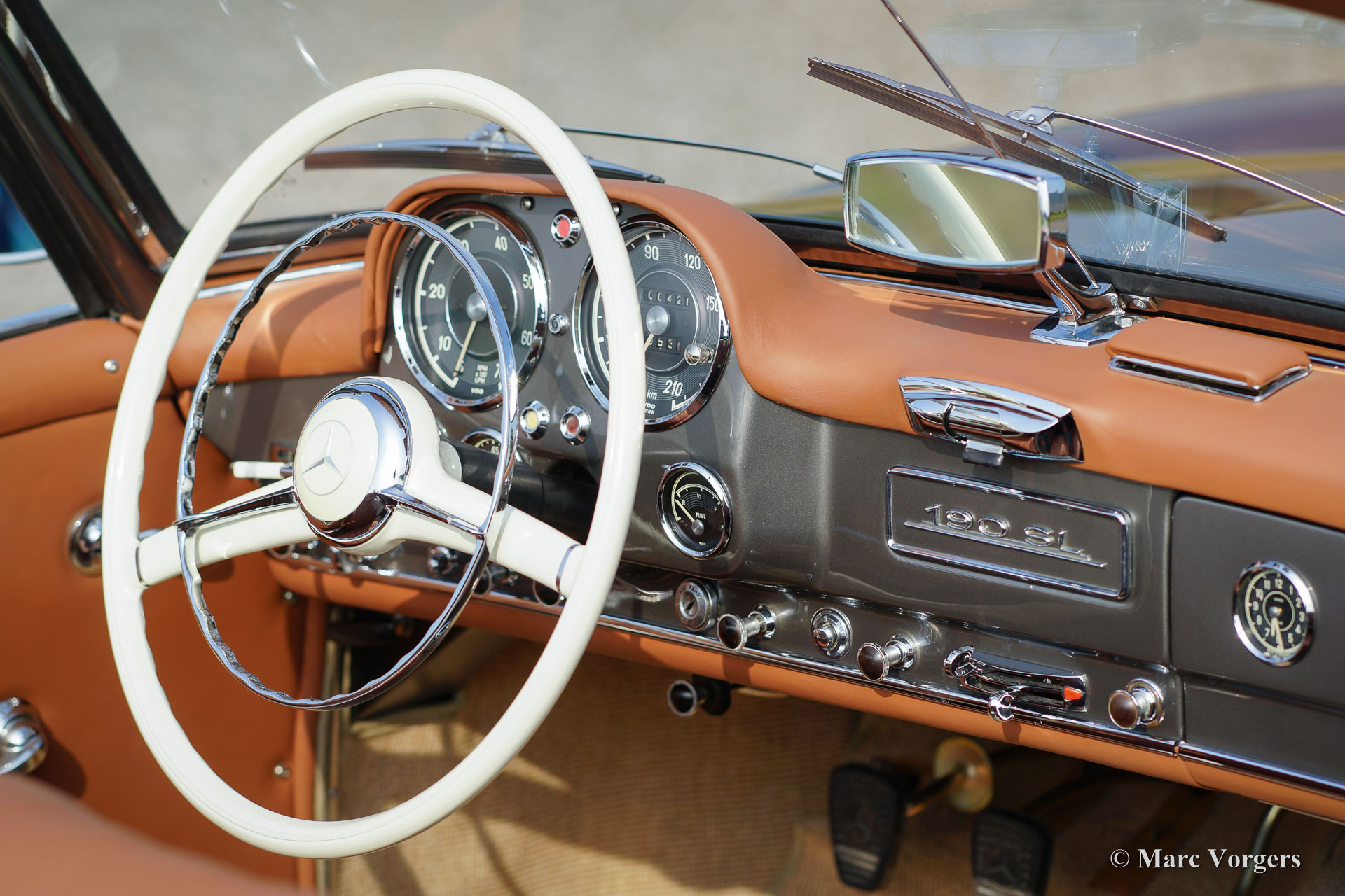 The Mercedes-Benz 190 SL roadster saw the light of day in the year 1955 impersonating a less expensive and less advanced alternative for the 300 SL roadster. Technically the 190 SL roadster shared nothing with big brother 300 SL. But the bodywork design and interior design, which appealed to many people, were strongly inspired by the 300 SL roadster. The Mercedes-Benz 190 SL was a real touring-convertible in opposite to the 300 SL roadster which was a true sports car. But the 190 SL was affordable (to Mercedes-Benz standards) and the car found a great share of enthusiastic owners primarily in the sunny states of the USA. The sales success of the 190 SL was based on the good looks of the car but also because of the excellent comfort, the excellent mechanics and its reliability. The Mercedes-Benz 190 SL was equipped with a four-cylinder engine with a cylinder capacity of 1897 cc. and fitted with two carburettors. The standard four-speed manual gearbox was fully synchronized and featured floor shift. From 1956 on the 190 SL was fitted with standard power brakes. During the entire period of production a very nice hardtop was available. The story goes that many European owner ordered the roadster with the hardtop and hardly ever took it off! In the year 1963 the 190 SL was succeeded by the new Mercedes-Benz 230 SL roadster which was going to be known by the nickname "Pagoda".