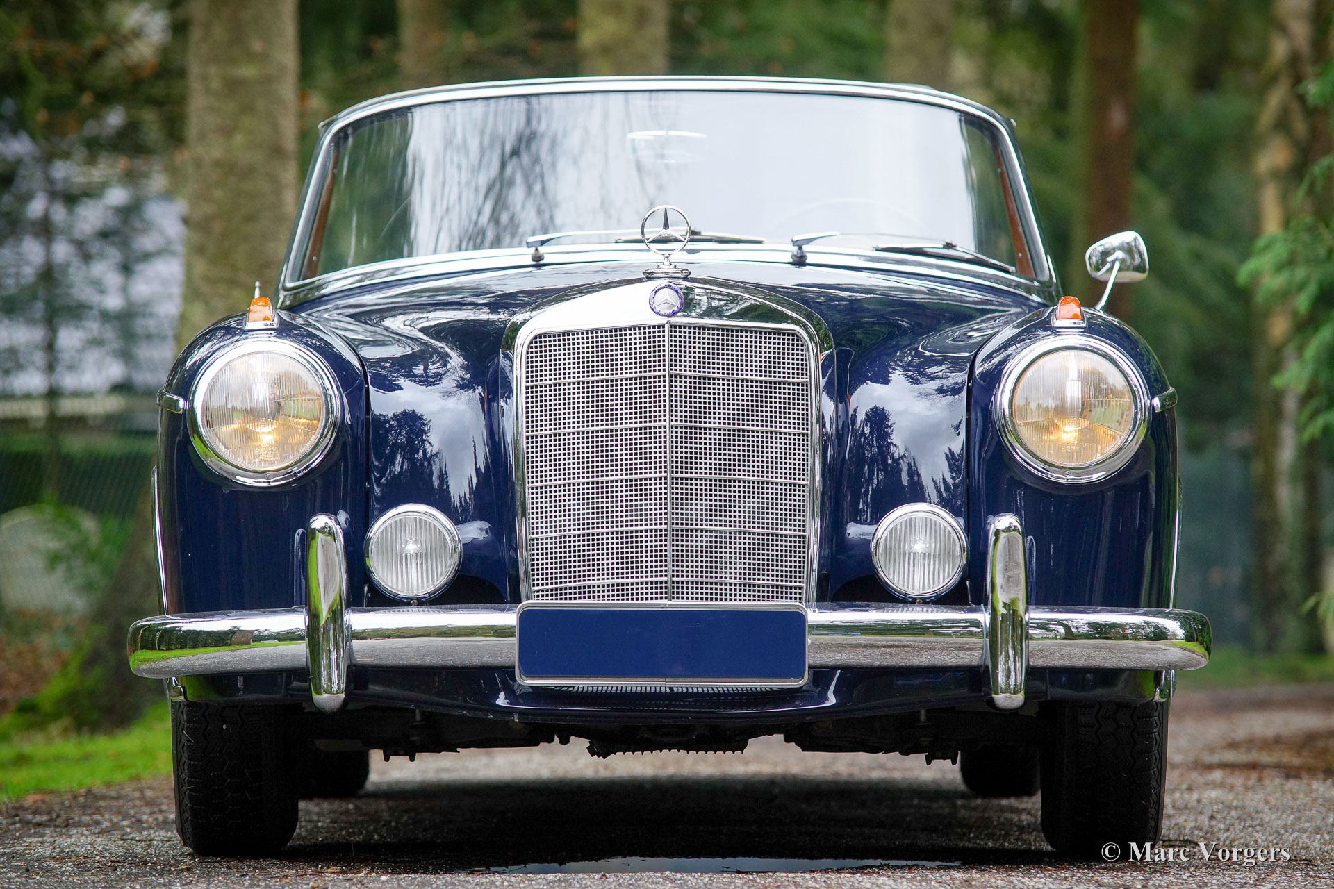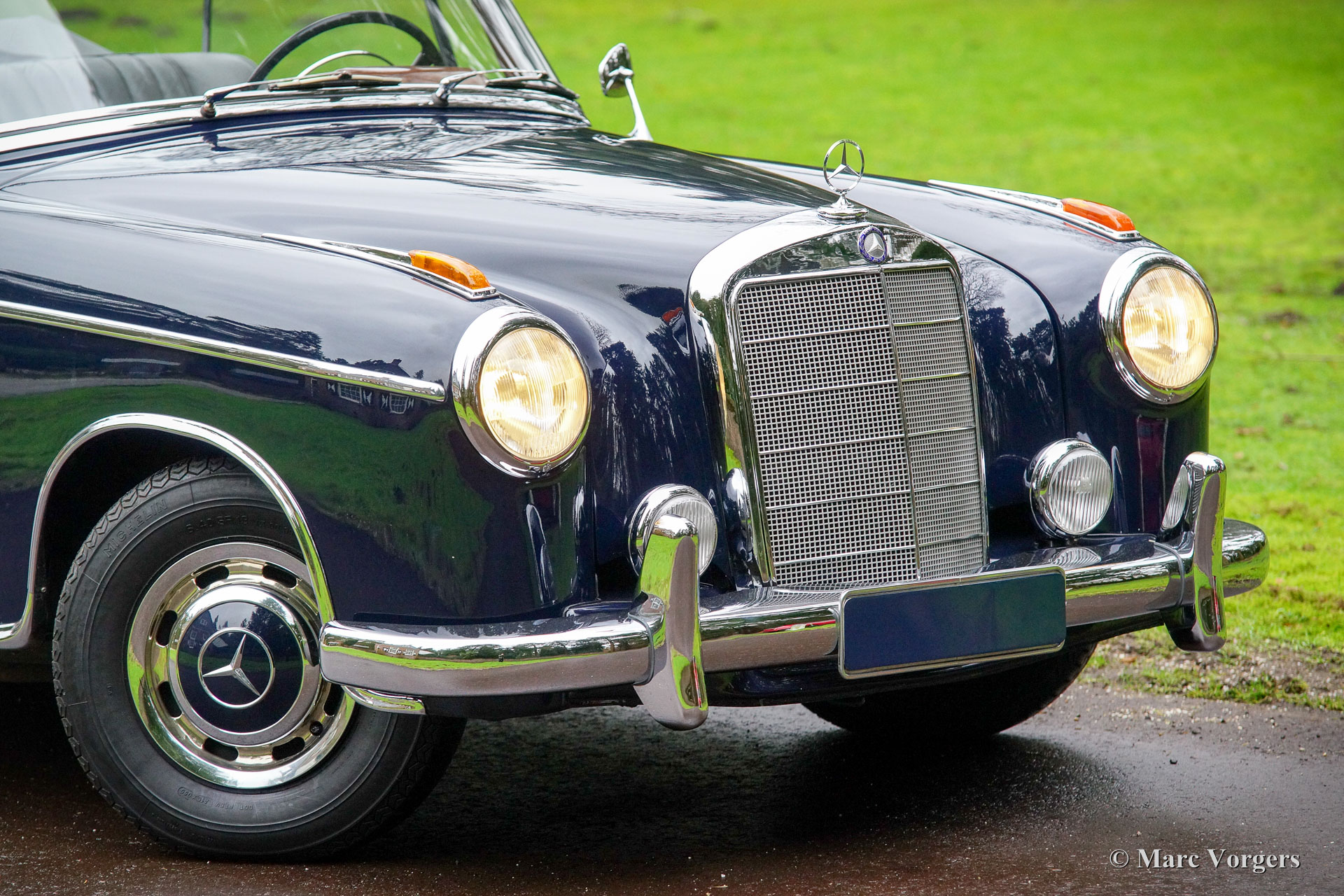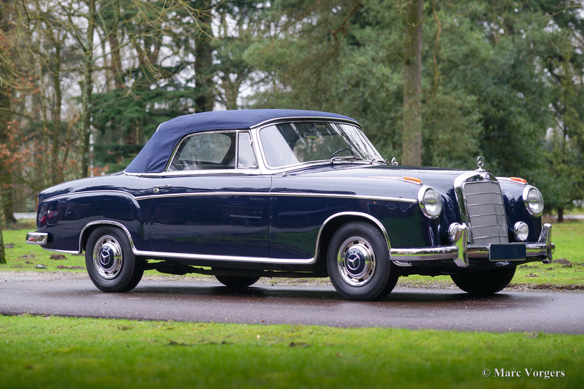 Mercedes-Benz 220 SE cabriolet (W128), year 1961. Colour dark blue with a grey leather interior. Blue carpet and matching trim in the boot. Blue mohair hood and grey leather hood cover. This beautiful Mercedes-Benz was sold new in the Netherlands. In recent years the car has been restored to a very high level of perfection by a German Mercedes-Benz specialist. The automobile is in superb top condition! This is one of the last W128 cabriolet models and factory fitted with fuel injection. This is a top specimen and a solid investment.