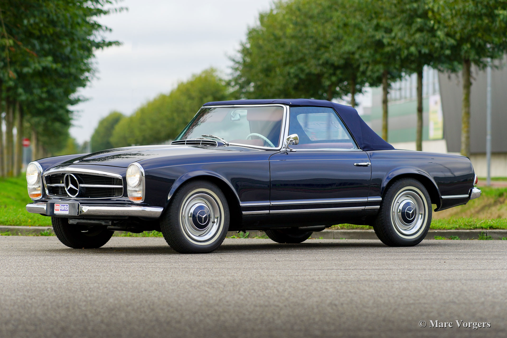 Mercedes-Benz 230 SL ‘Pagode’, year 1966. Colour dark blue metallic combined with a dark red leather interior and red carpet. Dark blue mohair hood. This gorgeous Mercedes-Benz 230 SL was sold new to the USA. The automobile was extensively restored, and recently the engine was overhauled. The invoice of the engine overhaul is present. This Mercedes-Benz 230 SL ‘Pagode’ is in very good to excellent condition and the car drives perfectly. The car shows all the original details like the wonderful white steering wheel and the steel disc wheels with chrome hub caps. Under the bonnet everything looks superb, and all the original spot-welds are still visible like they should. The petrol injected six cylinder in-line engine delivers 170 bhp and the automatic 4-speed gearbox shifts ‘spot-on’. The 230 SL was built from 1963 until 1967, 19.000 cars of this type were built. The car is fitted with a period Blaupunkt radio. This is a beautiful example!