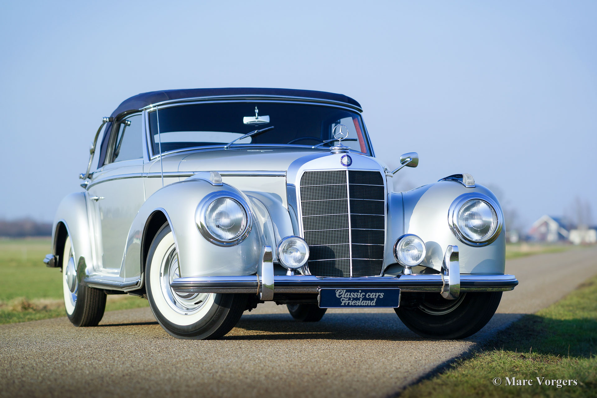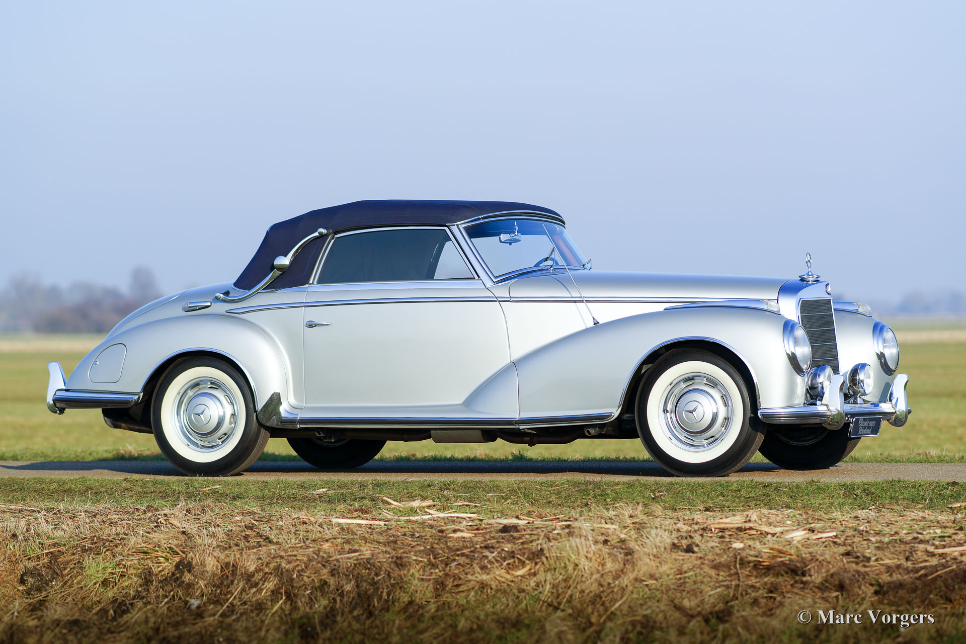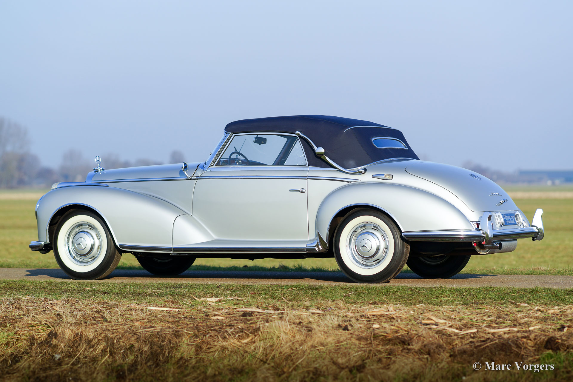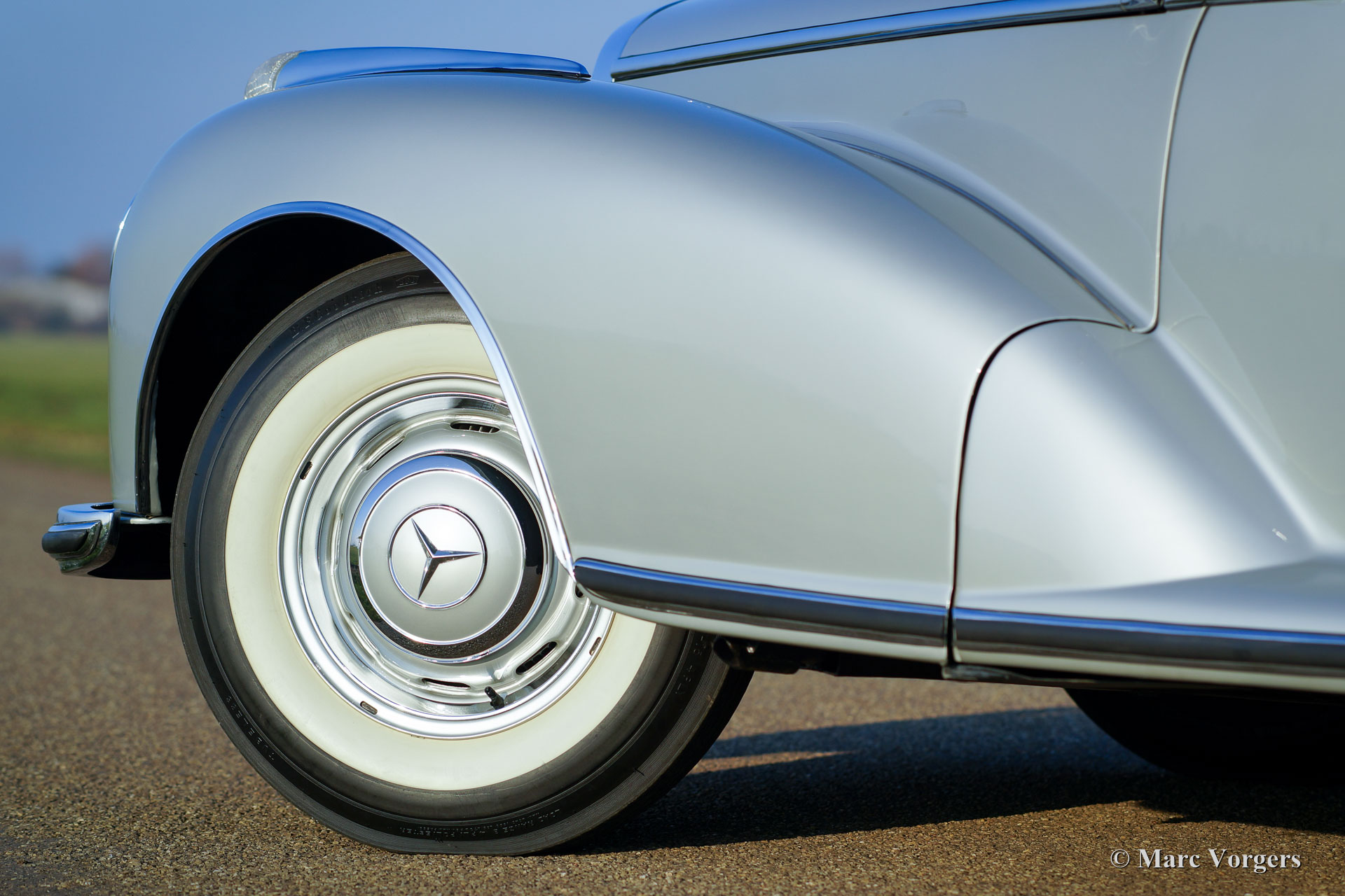 Mercedes-Benz 300 S cabriolet, year 1953. Colour silver metallic with a dark blue leather interior and blue carpet trimmed with dark blue piping. Dark blue mohair hood. This rare and very exclusive Mercedes-Benz has ‘matching numbers’. The original ‘Datenkarte’ is present as is the original owner’s manual. This wonderful Mercedes-Benz is in excellent and very original condition! The automobile shows all the original details and the car is fitted with original fog lamps. This 300 S is registered in the Netherlands. This is a very exclusive historic automobile, a magnificent show-piece in any Mercedes-Benz collection.