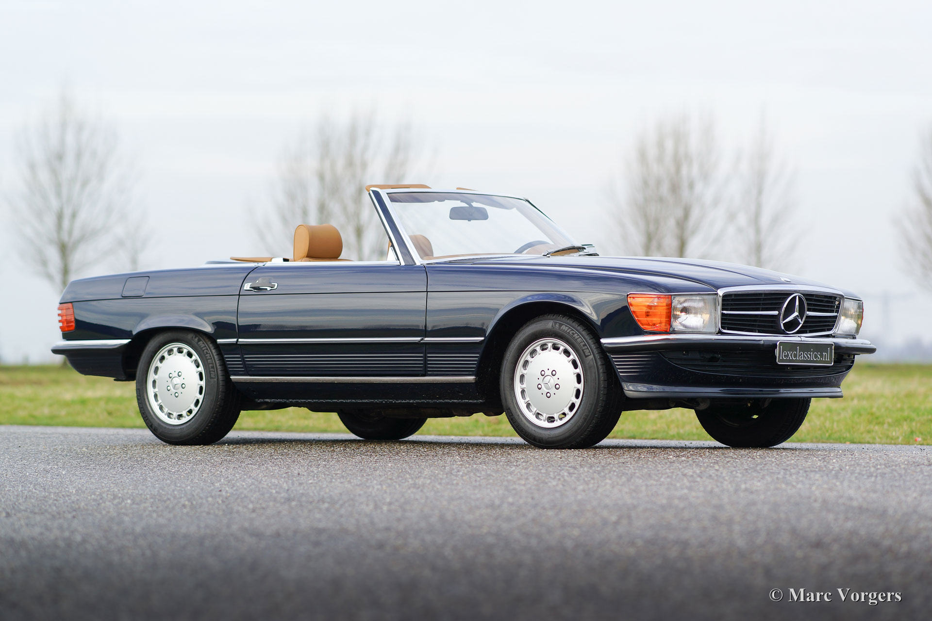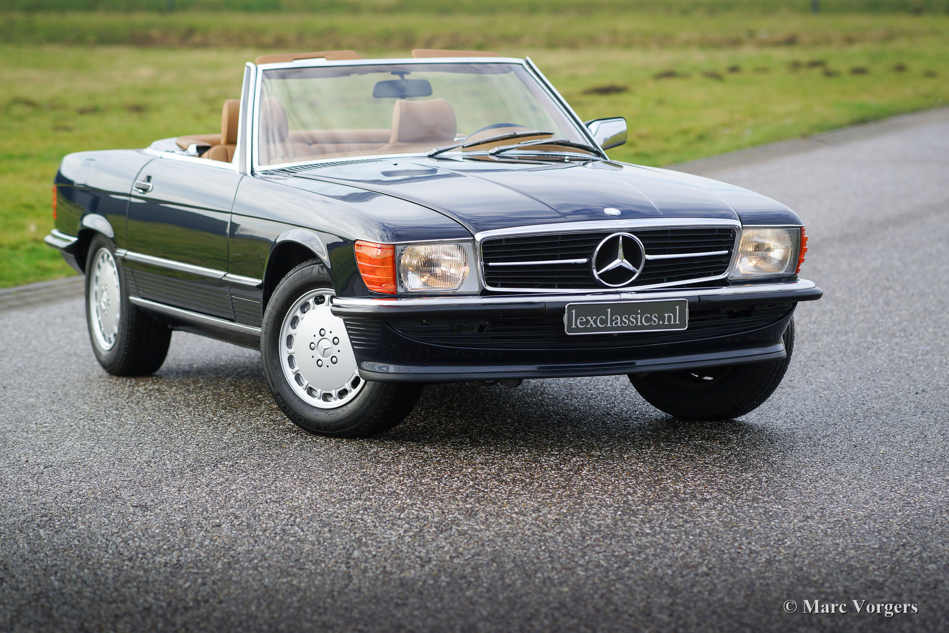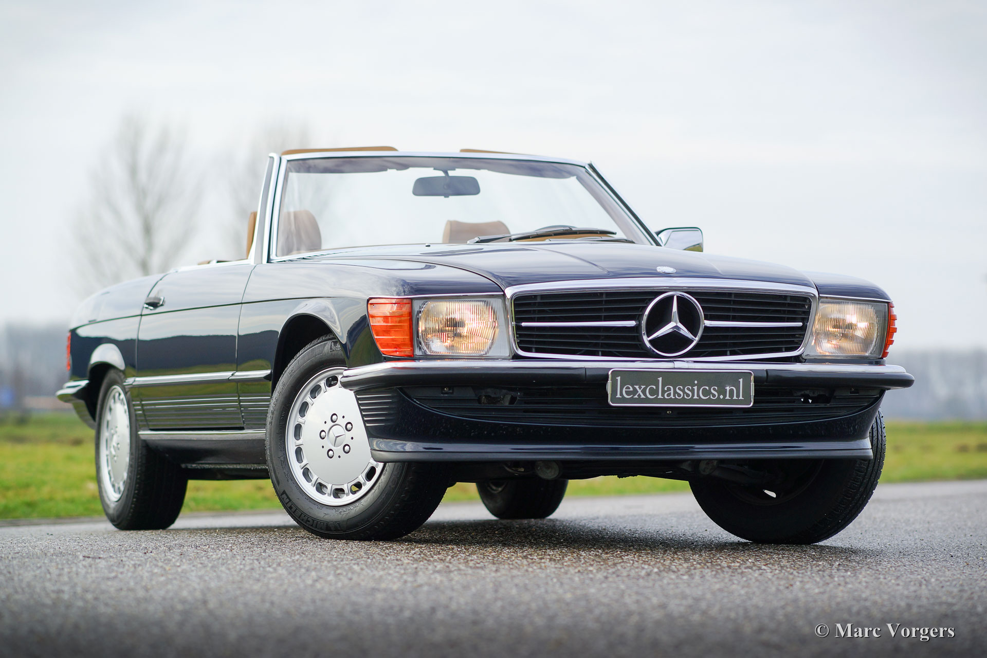 Mercedes-Benz 300 SL (type R107), year 1986. Colour dark blue with a cognac colour leather interior. This fantastic Mercedes 300 SL was extensively up-rated in the year 2014 by a Mercedes specialist. The car was given perfect new paint, a brand-new interior and a new soft-top. Furthermore, the mechanics and electrics were checked and brought up-to-date. The work was carried out beautifully; this 300 SL is in superb condition and the car drives perfectly. Photos of the work which has been carried out are present. This is an original European example in top-condition!
