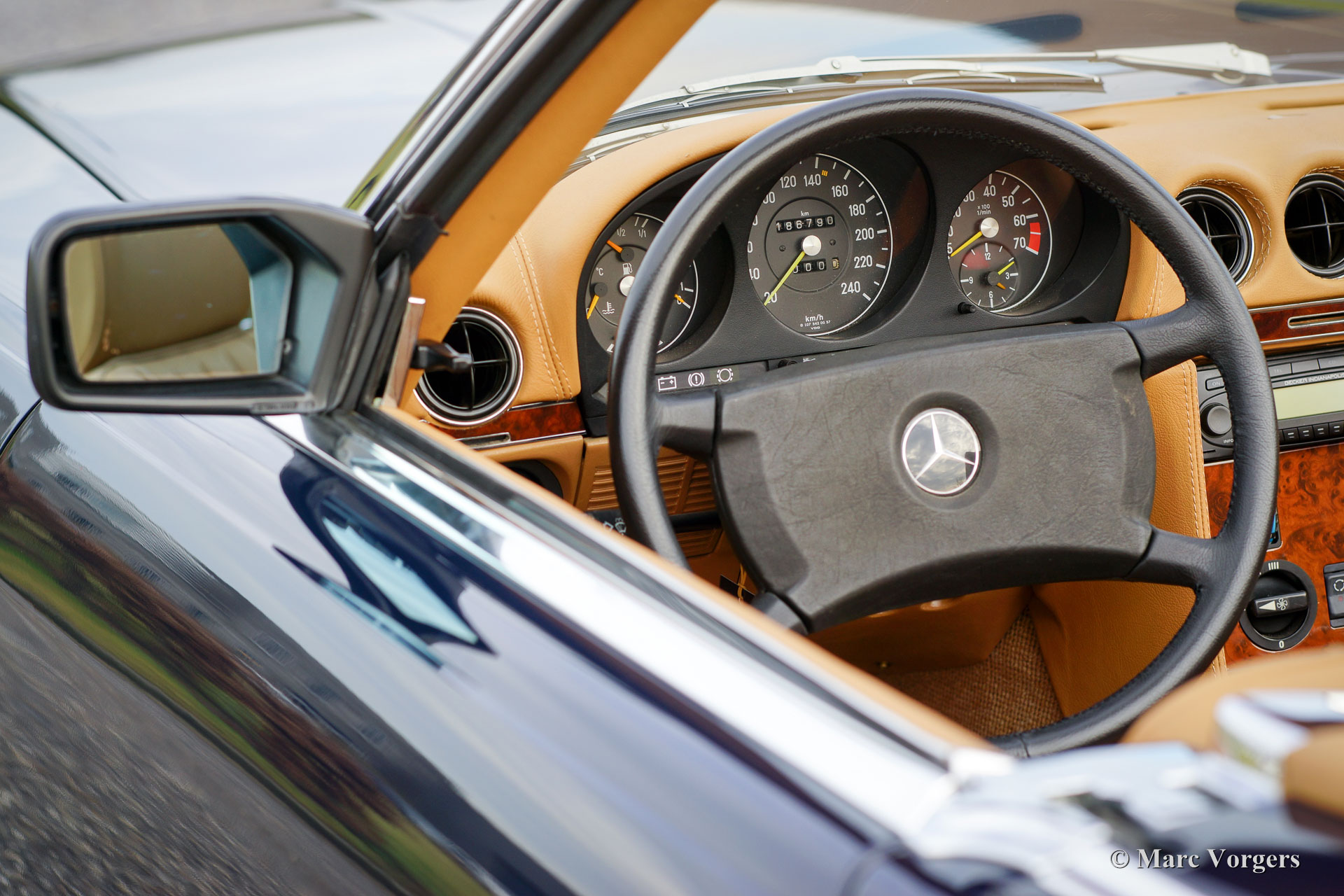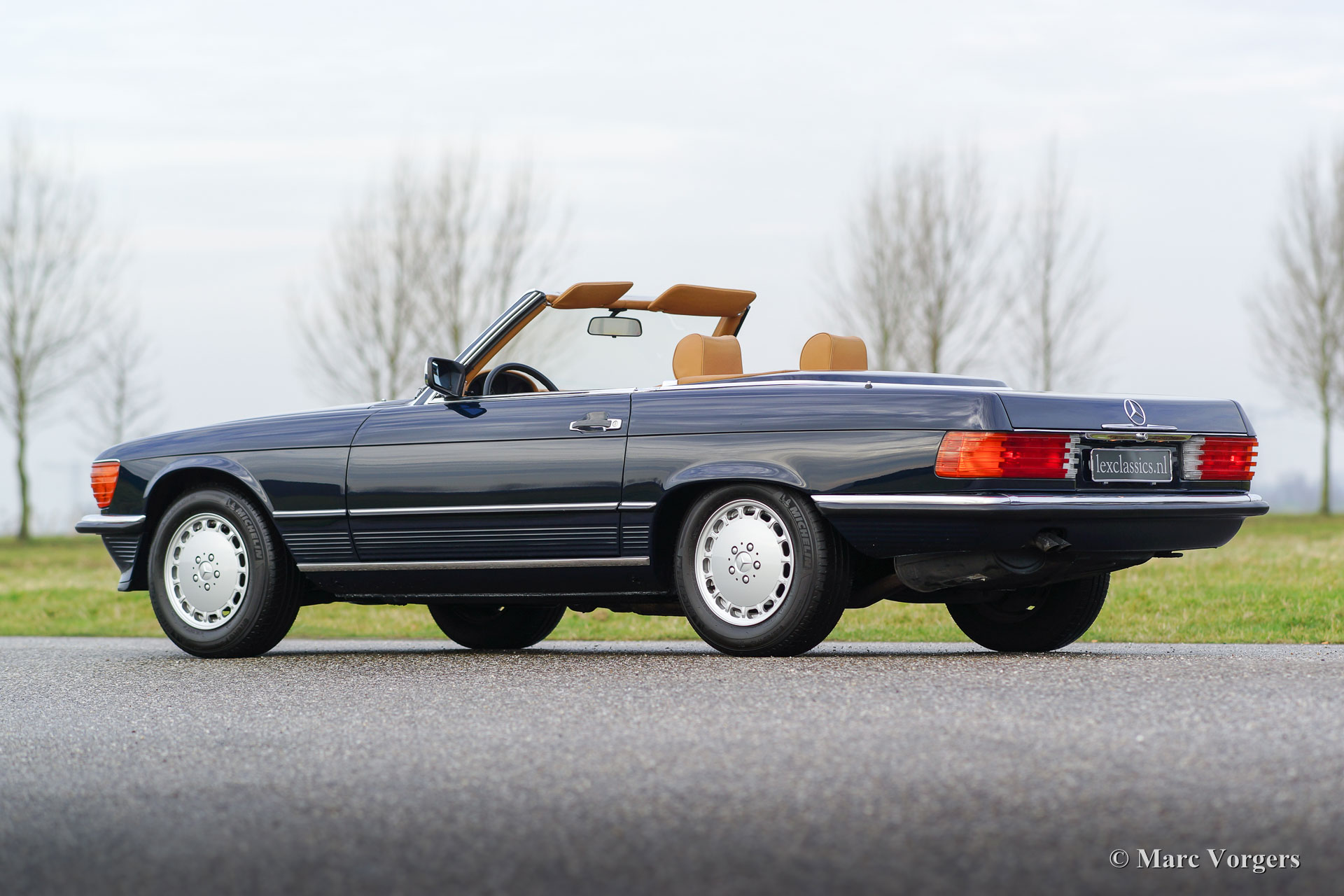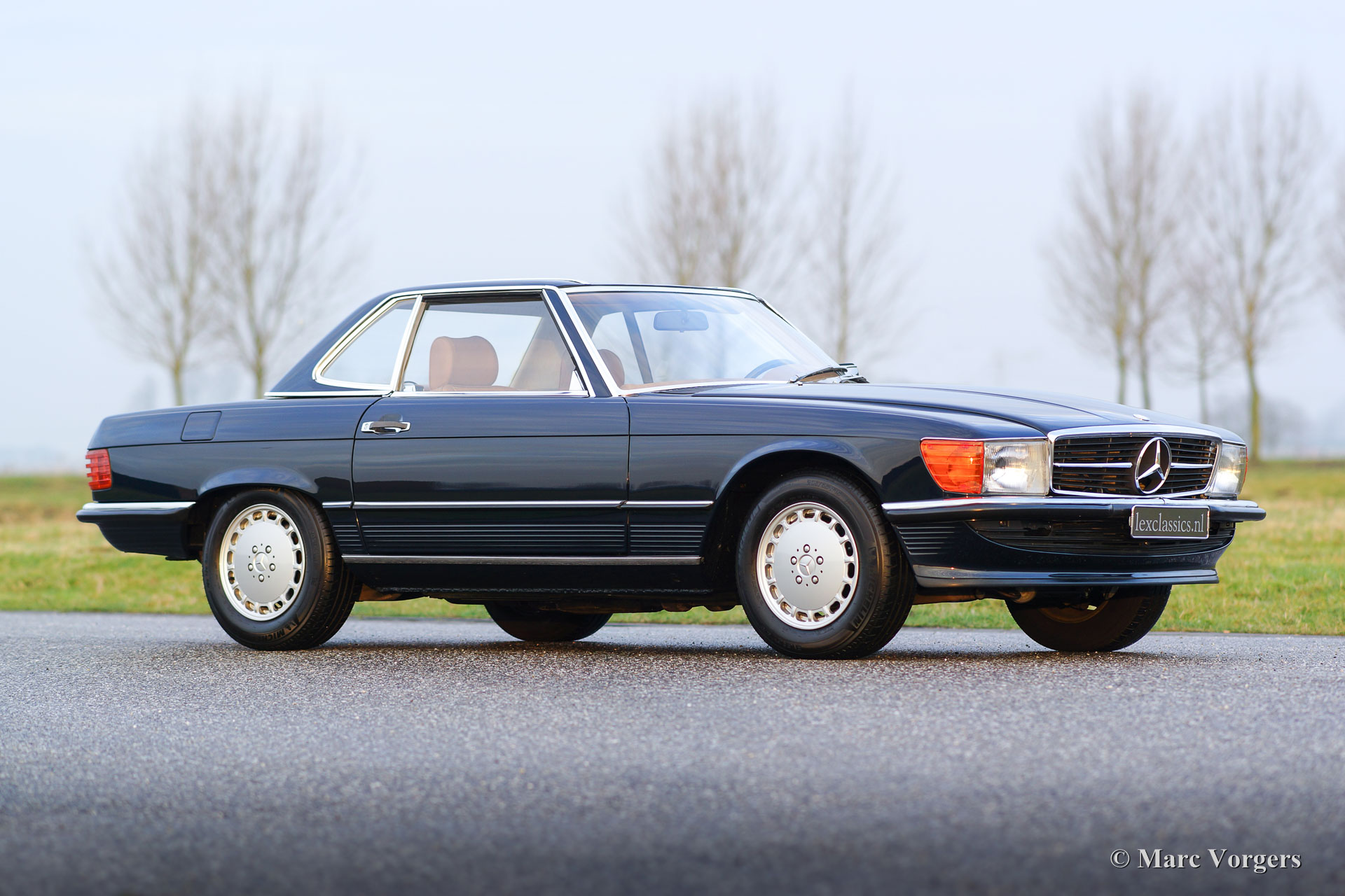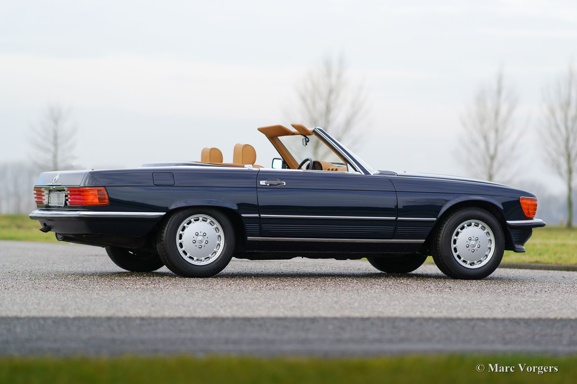 Mercedes-Benz 300 SL (type R107), year 1986. Colour dark blue with a cognac colour leather interior. This fantastic Mercedes 300 SL was extensively up-rated in the year 2014 by a Mercedes specialist. The car was given perfect new paint, a brand-new interior and a new soft-top. Furthermore, the mechanics and electrics were checked and brought up-to-date. The work was carried out beautifully; this 300 SL is in superb condition and the car drives perfectly. Photos of the work which has been carried out are present. This is an original European example in top-condition!