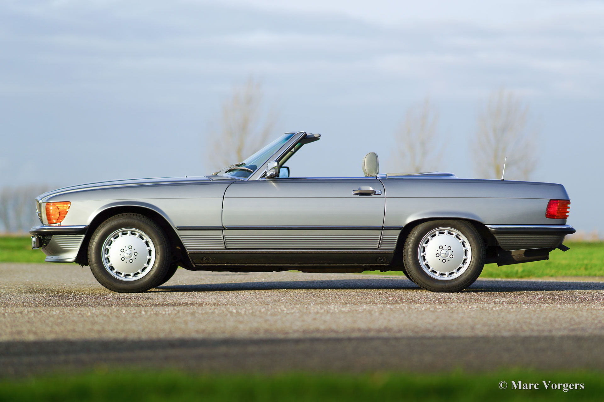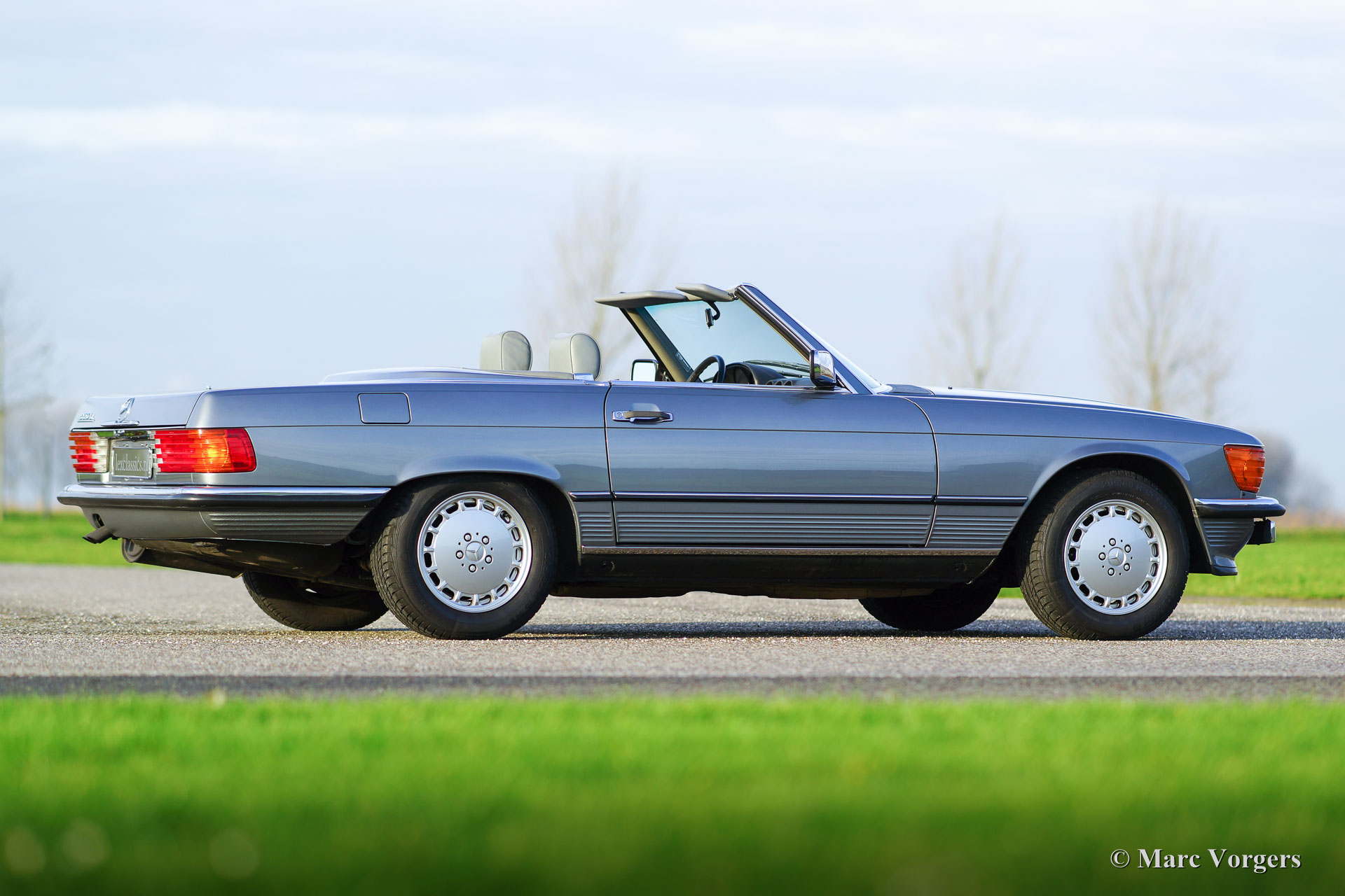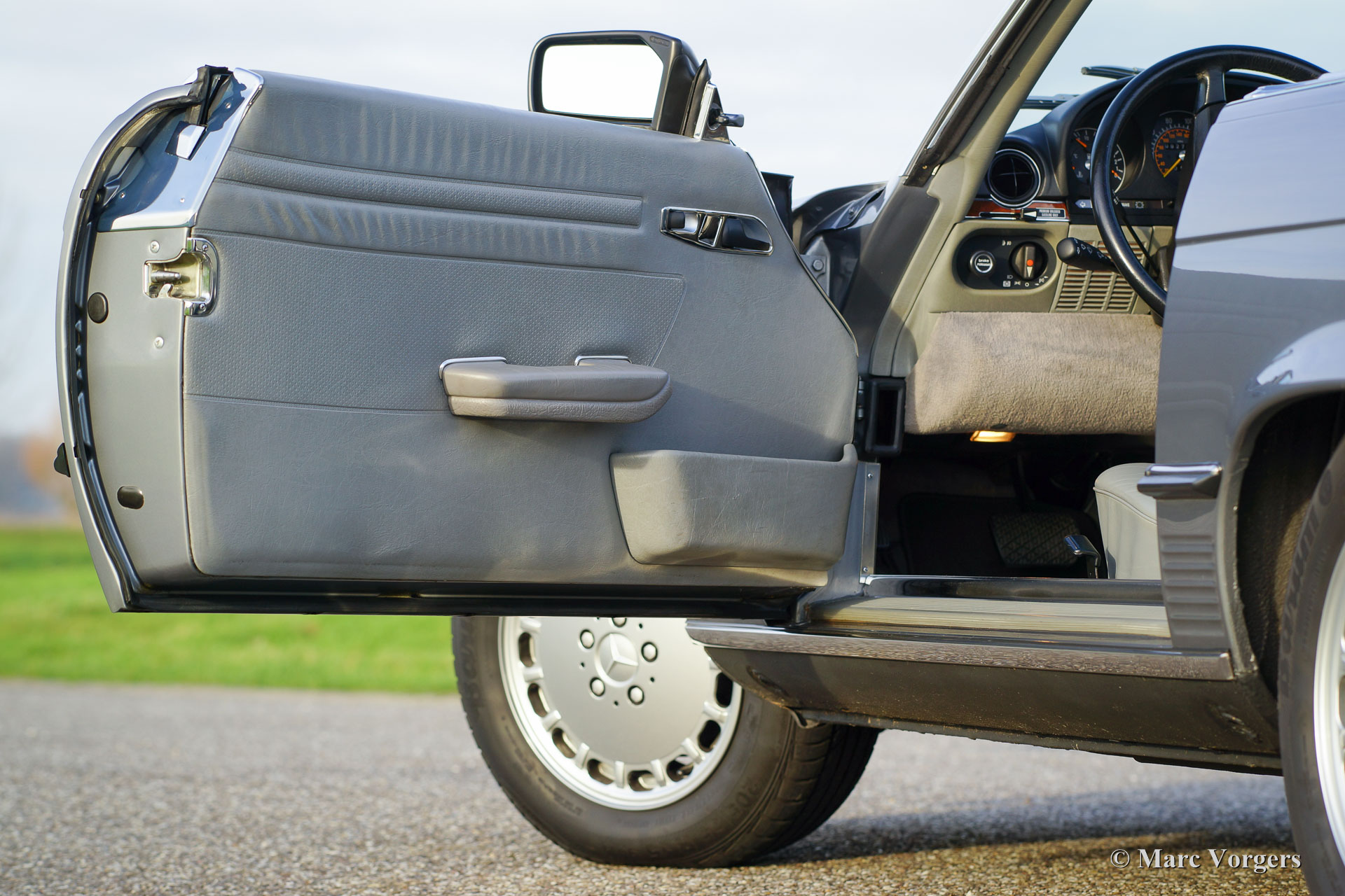 Mercedes-Benz 560 SL (R107), year 1988. Colour dark grey metallic with a pale grey leather interior and carpet. Black mohair convertible top. This magnificent Mercedes-Benz 560 SL was sold new in California (USA). In the year 2014 the car was imported to Belgium. After arriving in Belgium the car was fully serviced and up-rated by a Mercedes-Benz specialist. The car was given a new original gearbox and the automobile was fitted with European style bumpers and head lamps. All the work has been carried out to perfection at a cost of over 30.000 euro. This car is in superb top condition, like new! Invoices describing the work carried out are present. The Mercedes-Benz 560 SL was only available on the American, Australian and the Japanese market. This model is seldom seen in Europe. This unique Eu-spec 560 SL is a perfect car for the Mercedes enthusiast who is looking for a perfect SL fitted with the big 560 engine and all the luxury one can wish for.