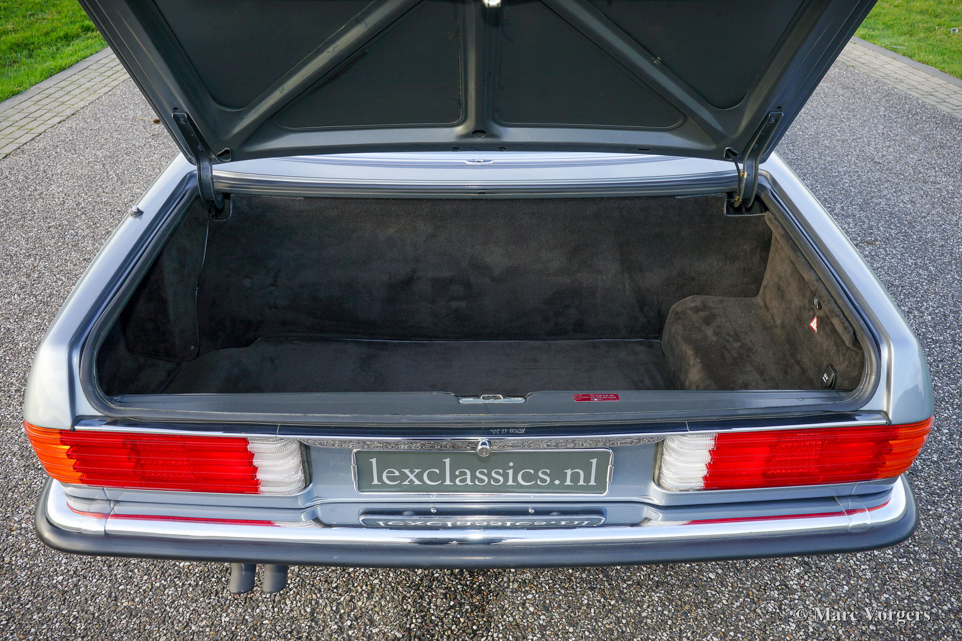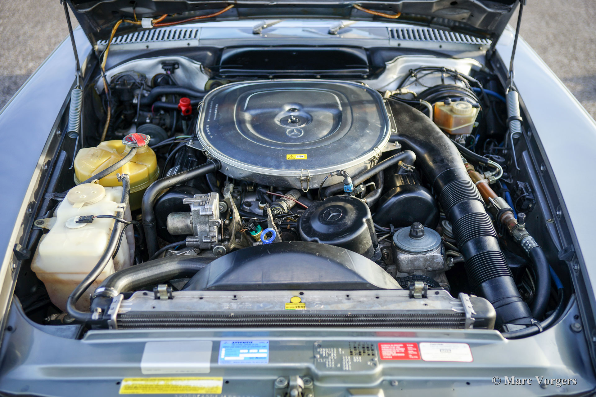 The Mercedes 280 SL, 350 SL, 450 SL and 560 SL (the latter for the US market only) are the successors of the 230 SL, 250 SL and 280 SL as we know under the nickname "Pagoda". The "Pagoda was built from the year 1963 until the year 1971, the year the new SL generation was presented to the market. Again Mercedes-Benz achieved to create a timeless design with slick, proper lines. In this shape the SL was sold for over twenty years. The "new" generation Mercedes SL is bigger, wider and heavier than its predecessor but again it was a perfect car considering construction, road holding and driving-comfort. The Mercedes-Benz SL was built with several engines. the buyer had to choose between a V8 with 3.5 or 4.5 liter cylinder capacity or a six cylinder engine with a cylinder capacity of 2.8 liter. The SL was standard equipped with a soft-top which could neatly be stowed away under a lid fully integrated in the car. Optionally the SL could be fitted with a hard-top. The hardtop can easily be fitted to the car, in a couple of minutes, with the soft-top down in place.