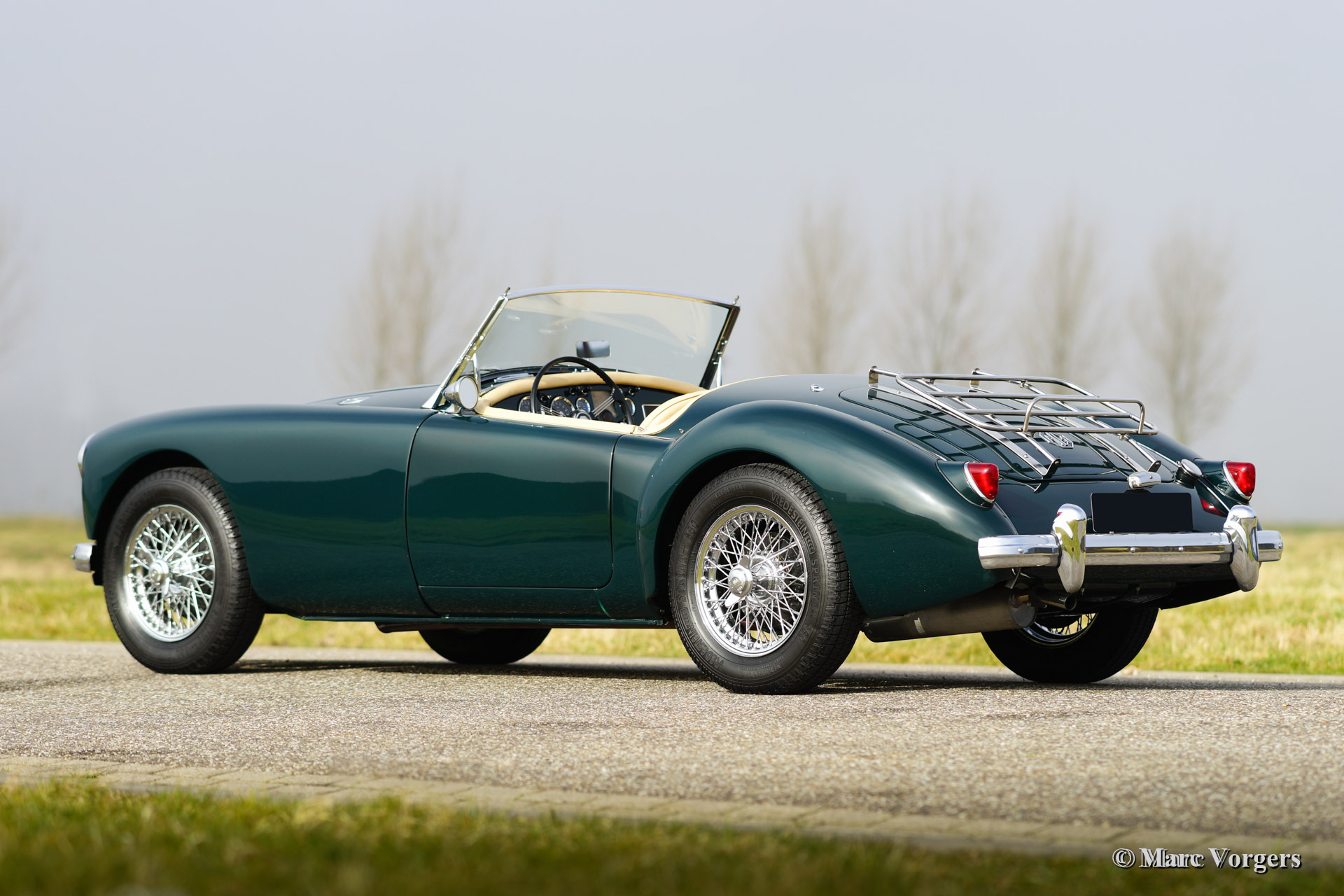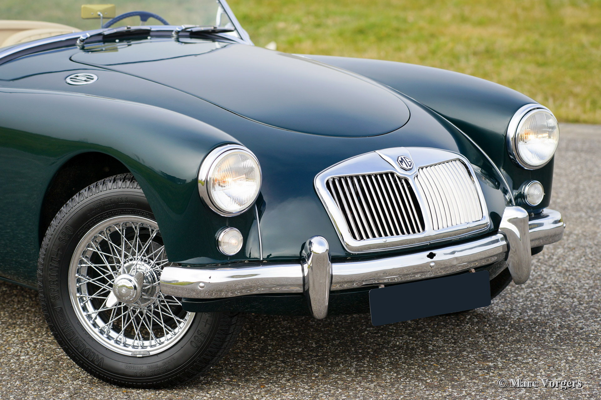 MG MGA 1500 roadster, year 1958. Colour British Racing Green with a beige leather interior and black carpet. This fine MGA roadster is in excellent condition and the car drives perfect! The car features chrome wire wheels.
