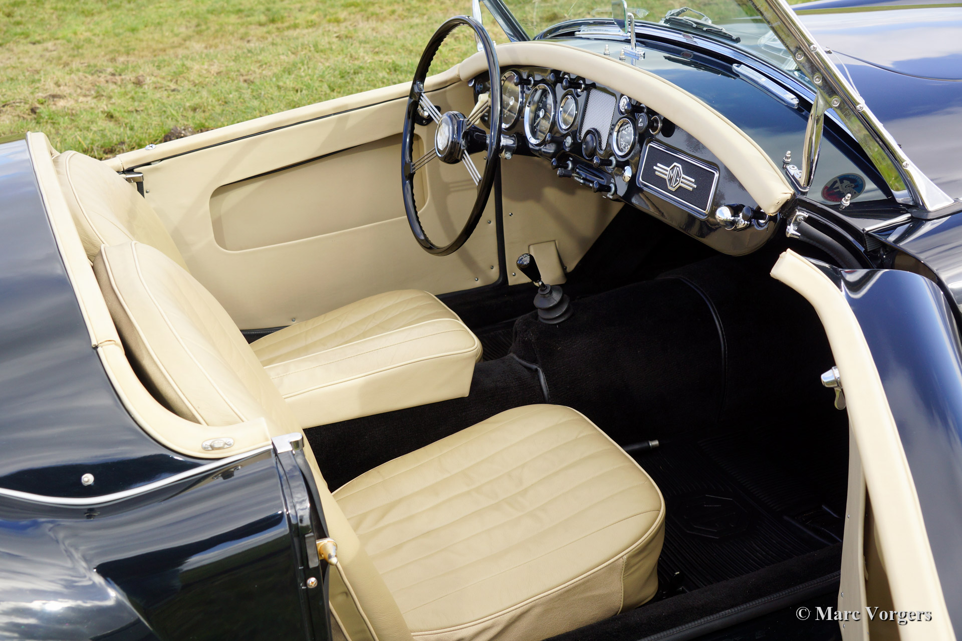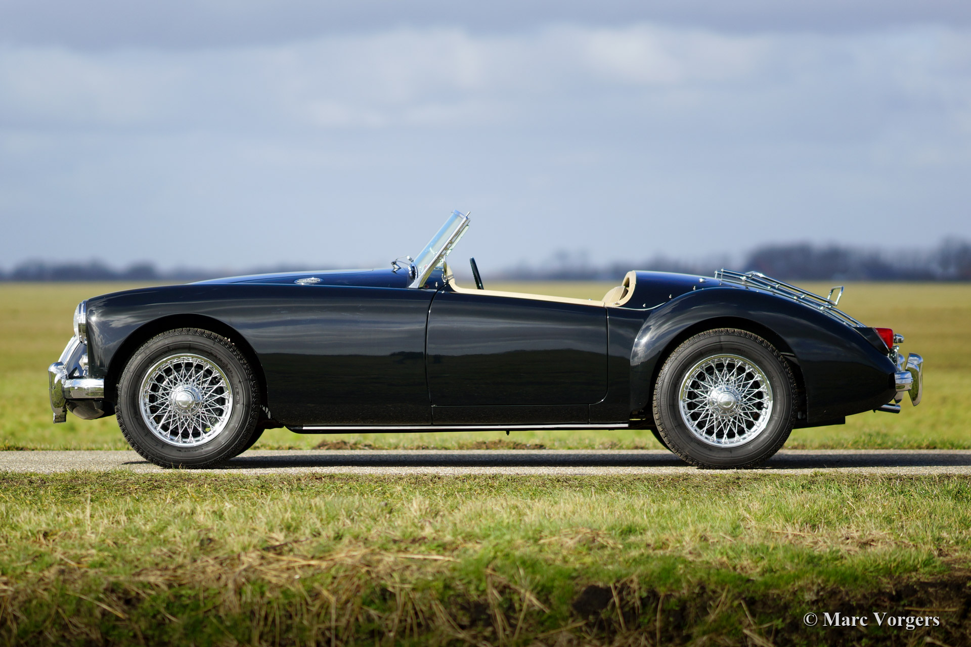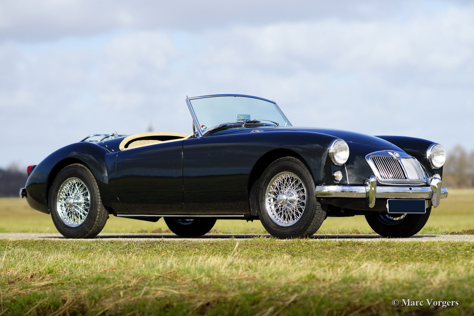 MG MGA 1500 roadster. Year 1959. Colour dark British Racing Green with a beige leather interior. Black soft top, tonneau cover and aluminium side screens. This MGA roadster is in superb (excellent+) condition. The automobile was extensively and ‘body off’ restored a few years ago. The chassis was stove enamelled, the engine and the gearbox were overhauled. The car features a Stainless Steel exhaust, chrome wire wheels, Michelin tyres, a chrome luggage rack and an original steering wheel. This MGA comes complete with a Heritage certificate and a photo reportage of the restoration.