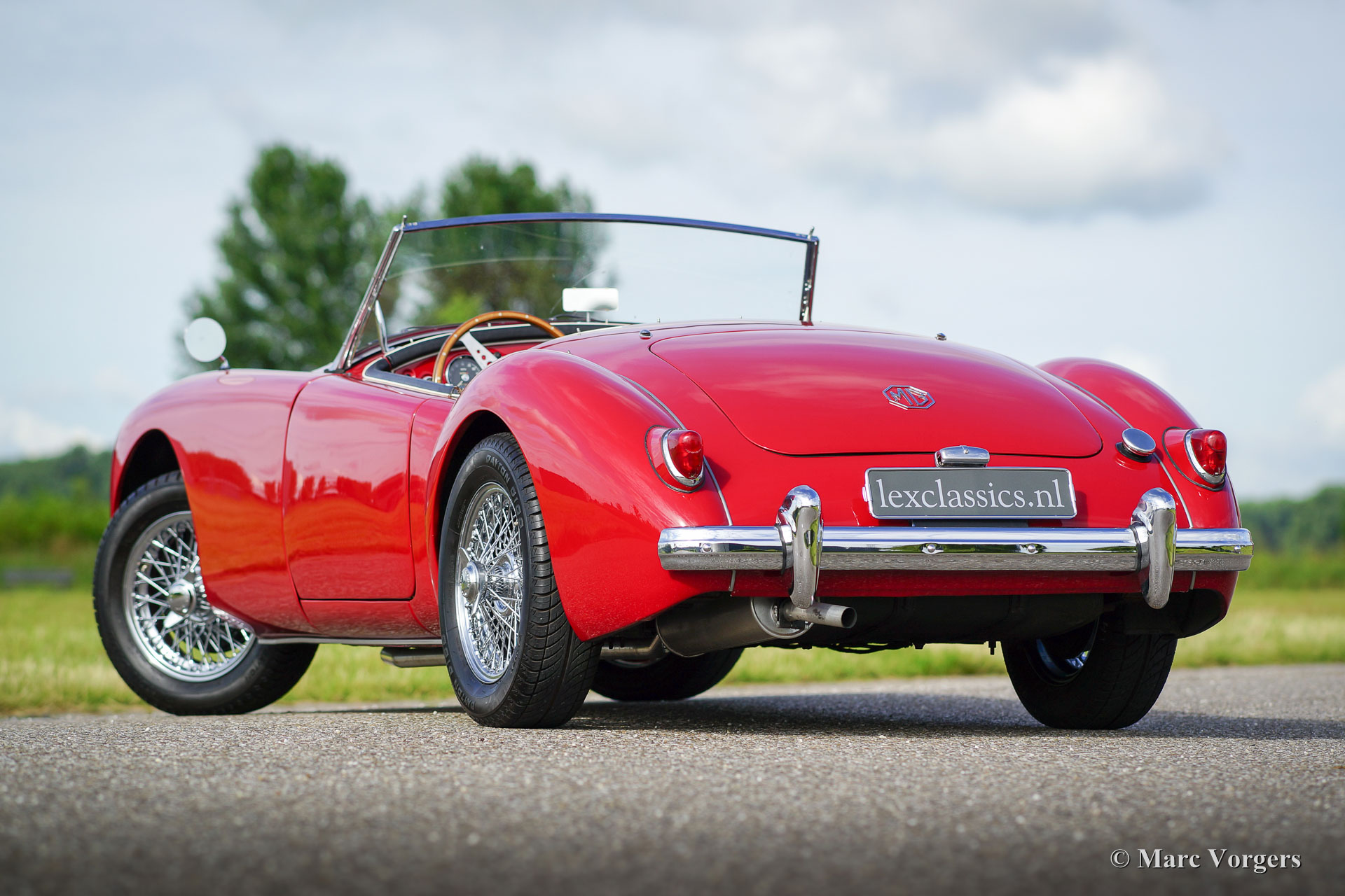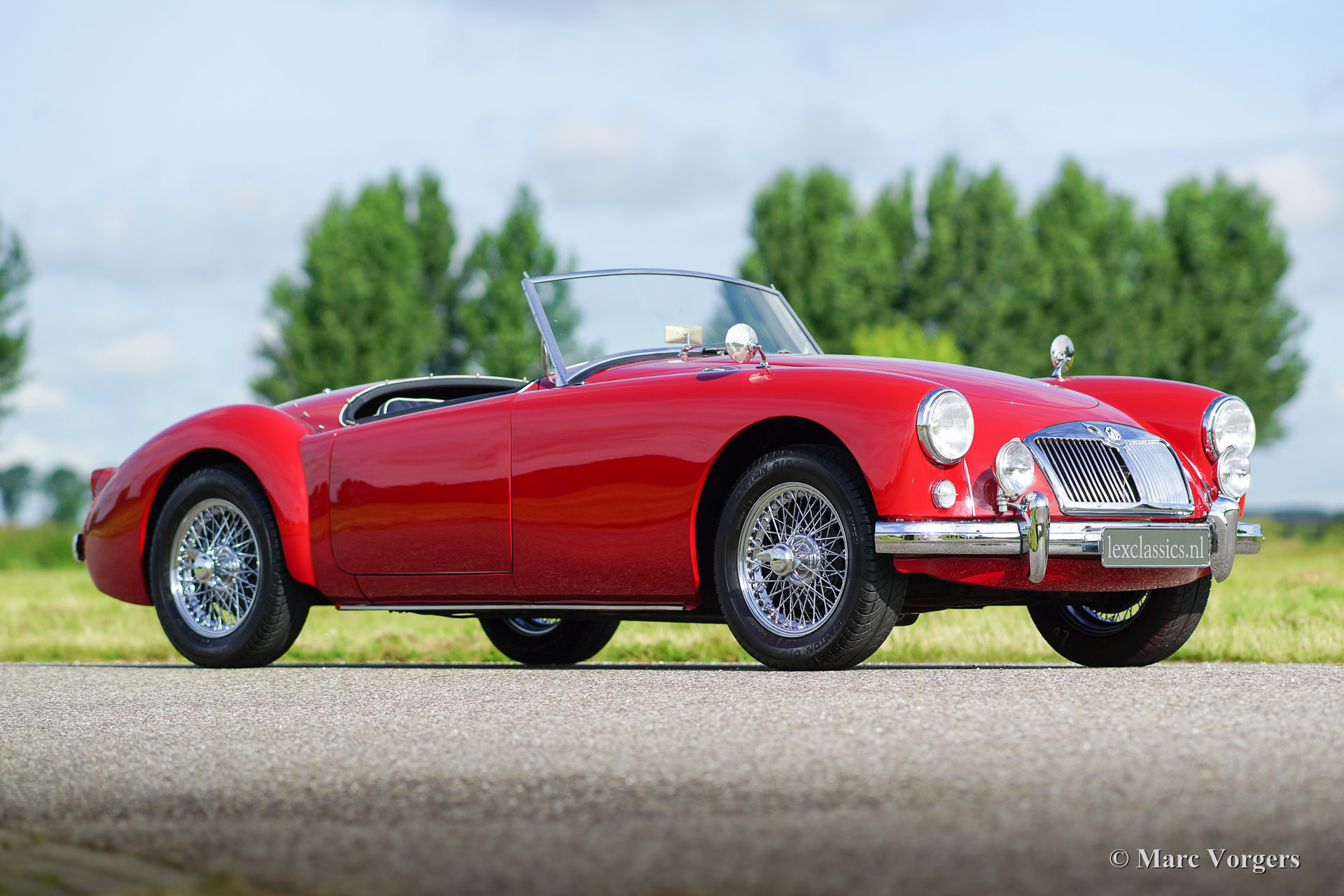 MG MGA 1500 roadster, year 1958. Colour red with a black interior, black carpet and a black soft-top. This wonderful MGA roadster was extensively and ‘body-off’ restored a few years ago, the car is in very good to excellent condition and the car drives delightfully! This MG features chrome wire wheels, chrome ‘knock-off’ wheel nuts, chrome rear view mirrors, additional fog lamps at the front, a tonneau cover and a beautiful MotoLita sports steering wheel with wood rim.