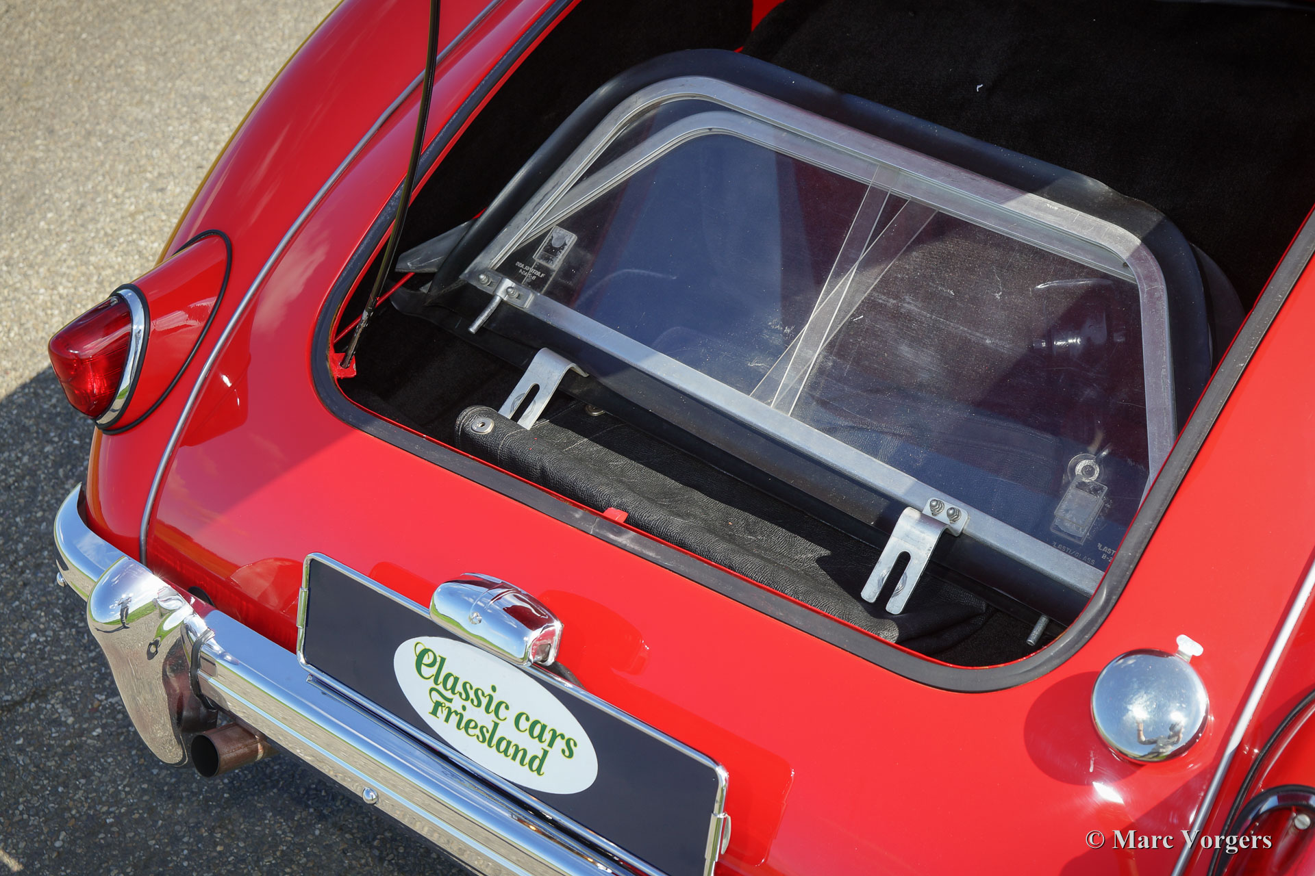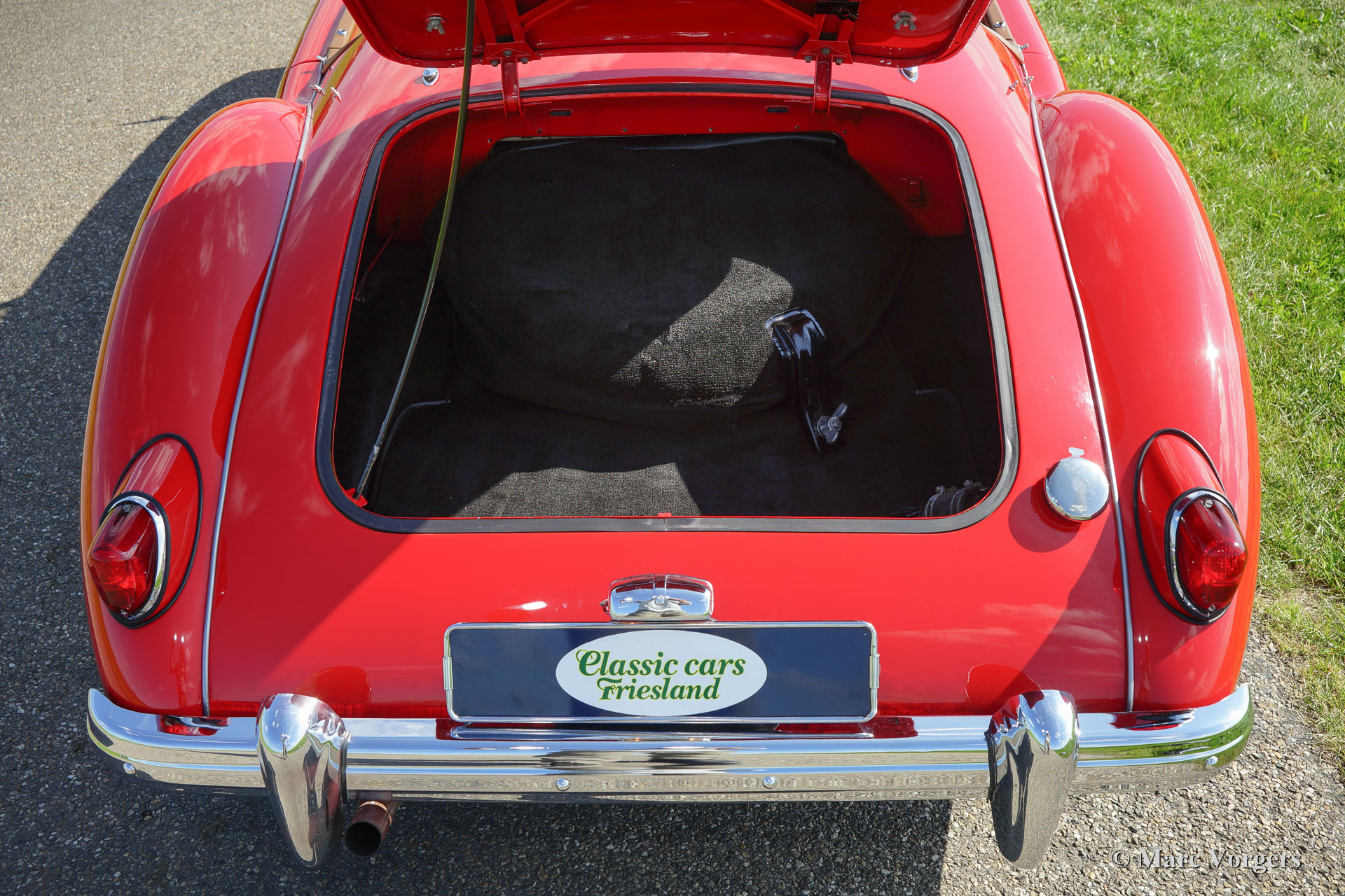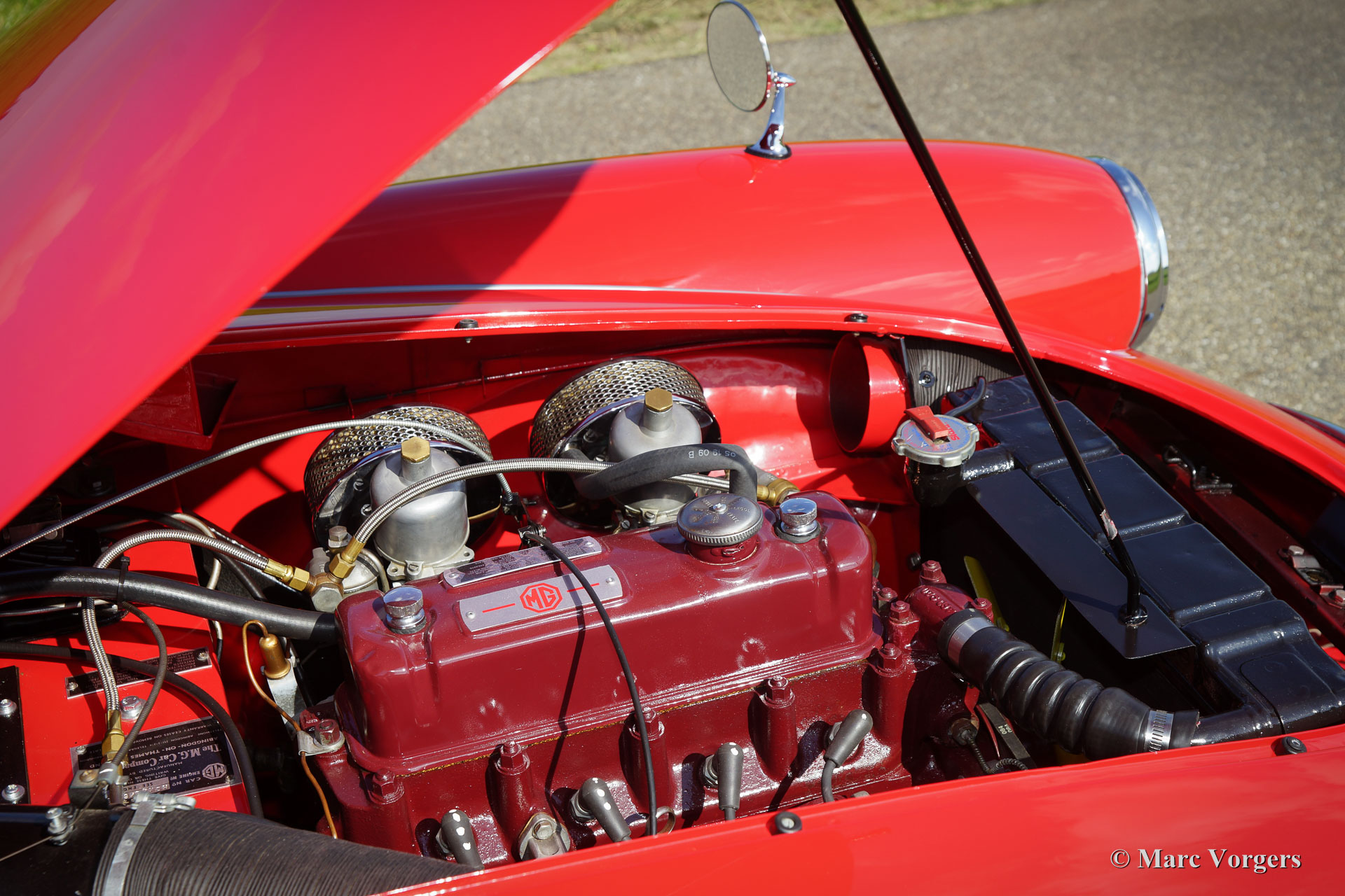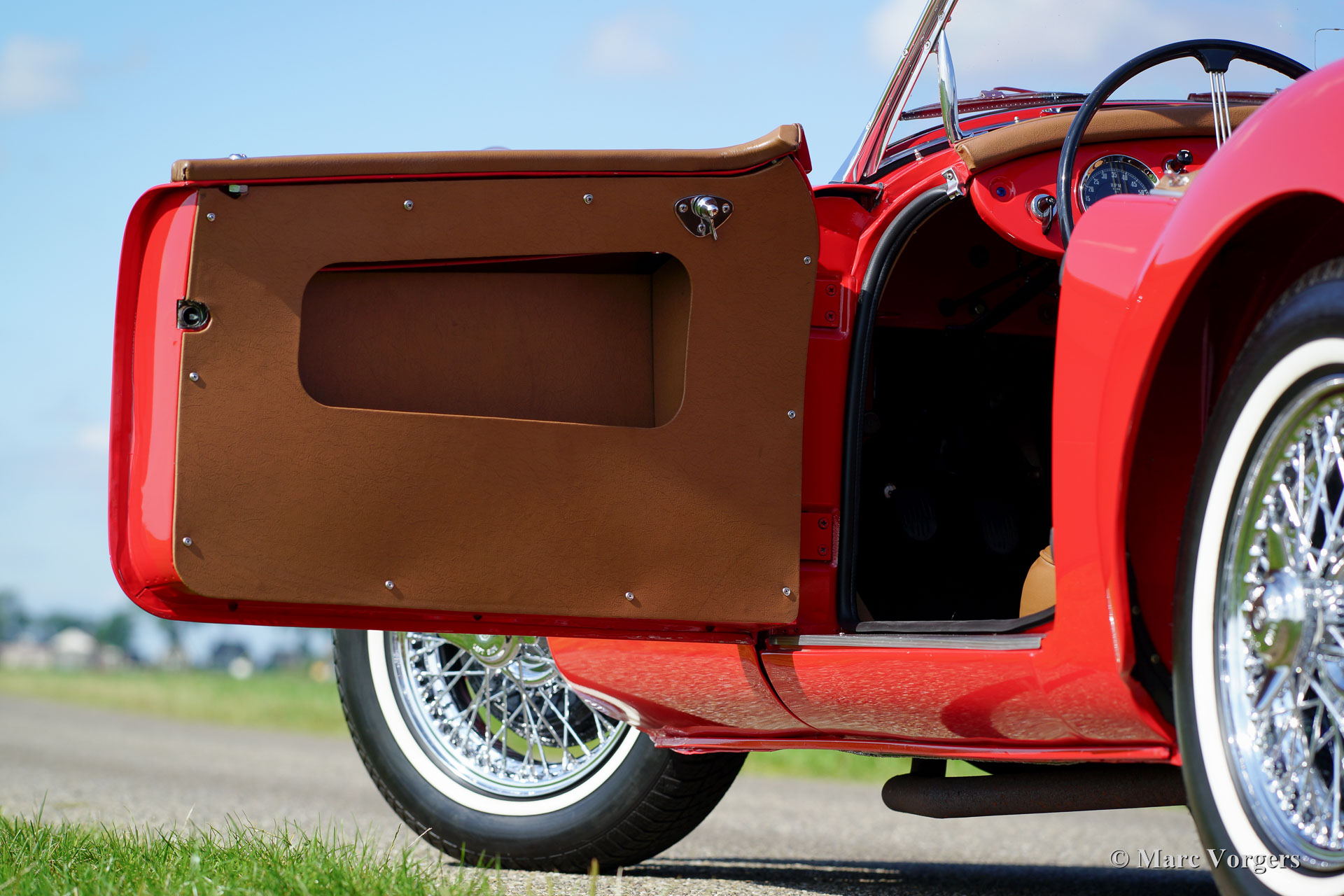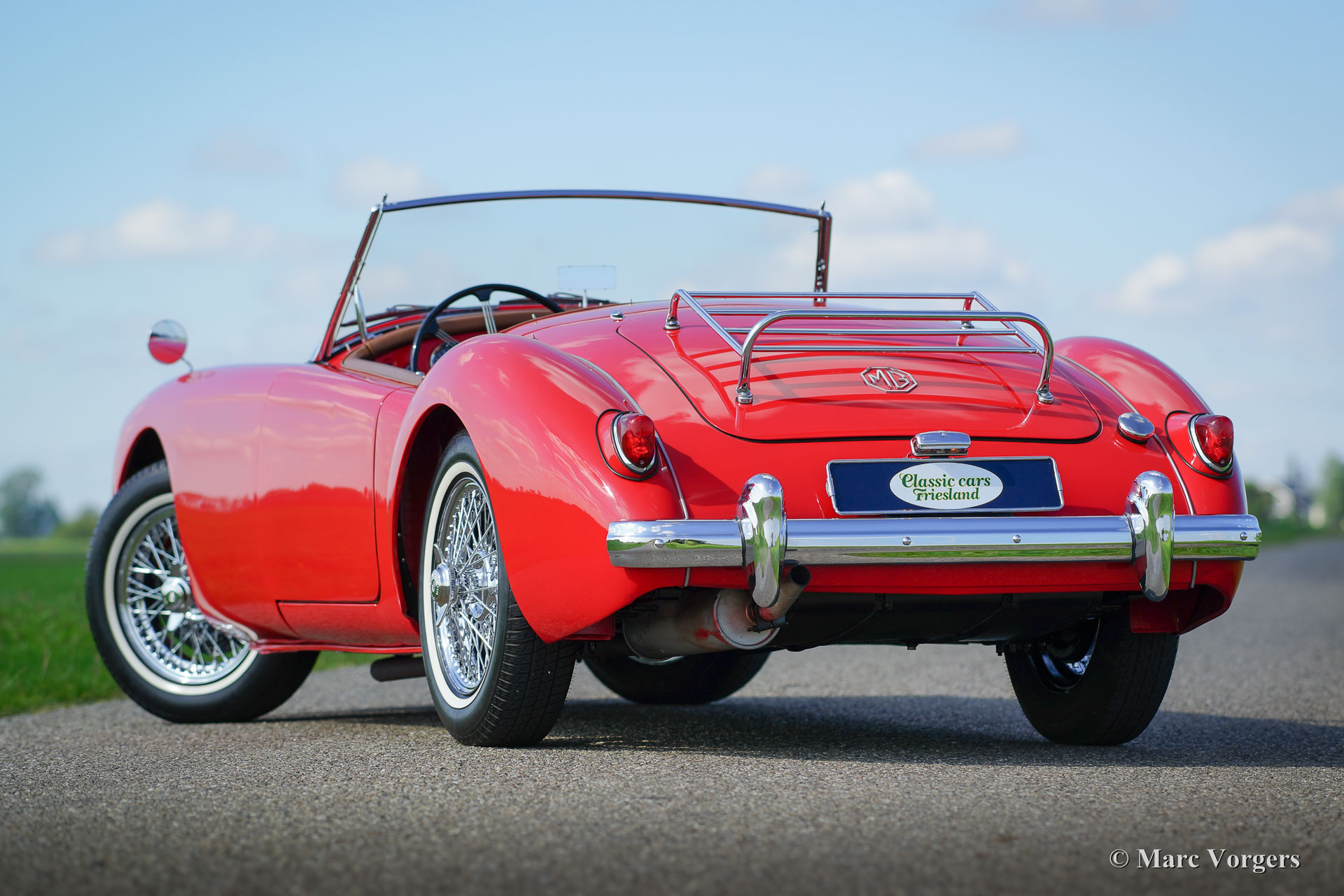 MG MGA 1500 roadster, year 1959. Colour red with a brown leather interior and black carpet. The car is fitted with a black soft-top and tonneau cover. This beautifully lined MGA 1500 roadster was extensively restored to top condition. The engine and the gearbox have been overhauled and a five-speed gearbox was fitted. A photo reportage of the restoration is present. The bodywork shows beautiful panel fit, superb paint and superb chrome bright work; this car is in superb condition! The car features chrome wire wheels, white wall tyres and a chrome luggage rack. This is a gorgeous and perfectly driving MGA roadster.