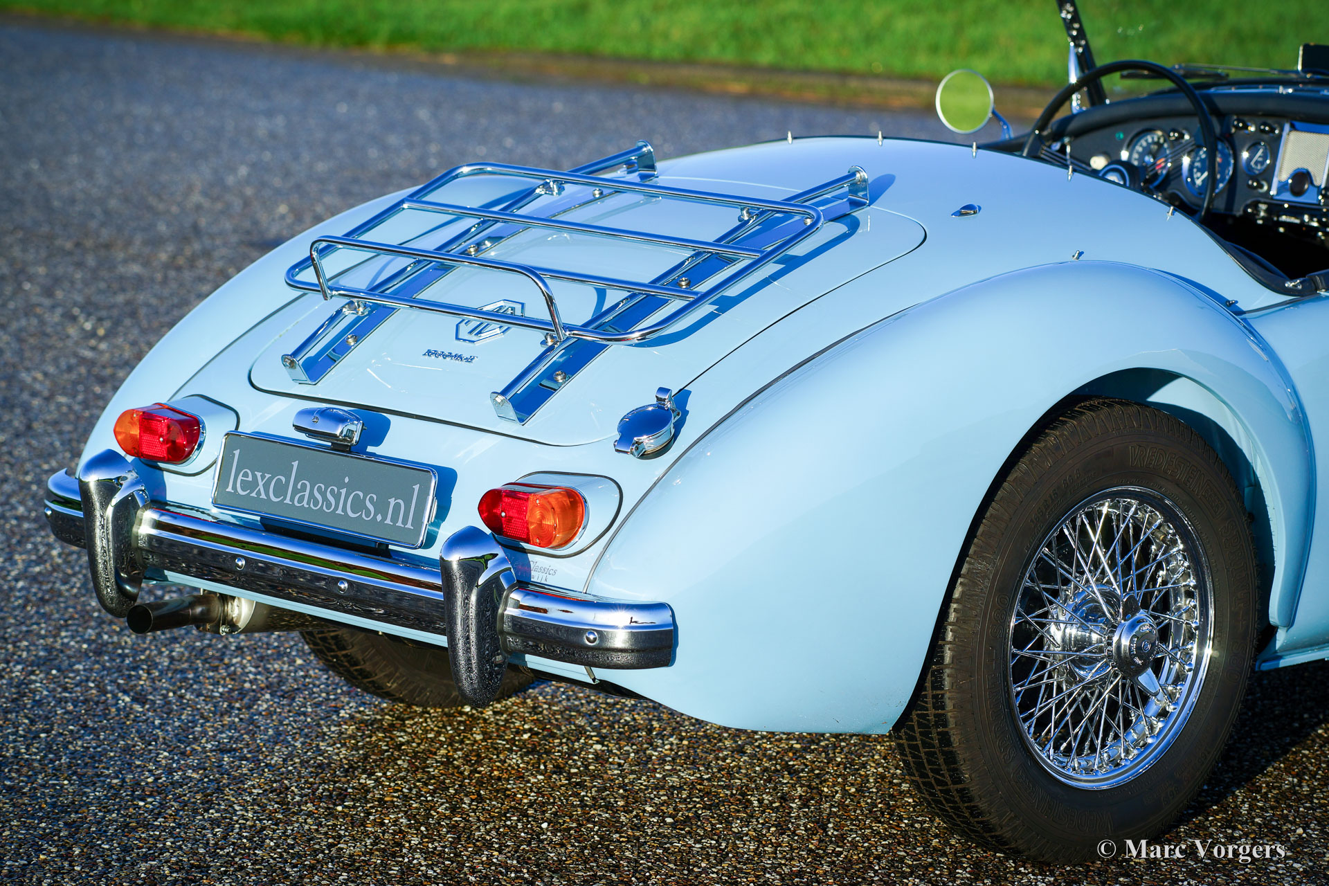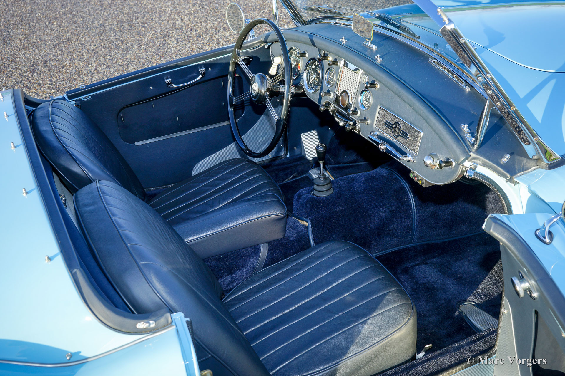 MG MGA 1600 Mk II roadster, year 1961. Colour ‘powder blue’ with a dark blue leather interior. This beautiful MGA 1600 roadster was extensively and ‘body off’ restored a few years ago. The bodywork shows excellent panel fit and the paintwork is pristine. This MGA is in superb top condition! A photo reportage of the restoration is present. This MGA 1600 of the last Mk II series features chrome wire wheels, Lucas fog lamps at the front, electric cooling fan, power brakes, vinyl tonneau cover and a chrome luggage rack.