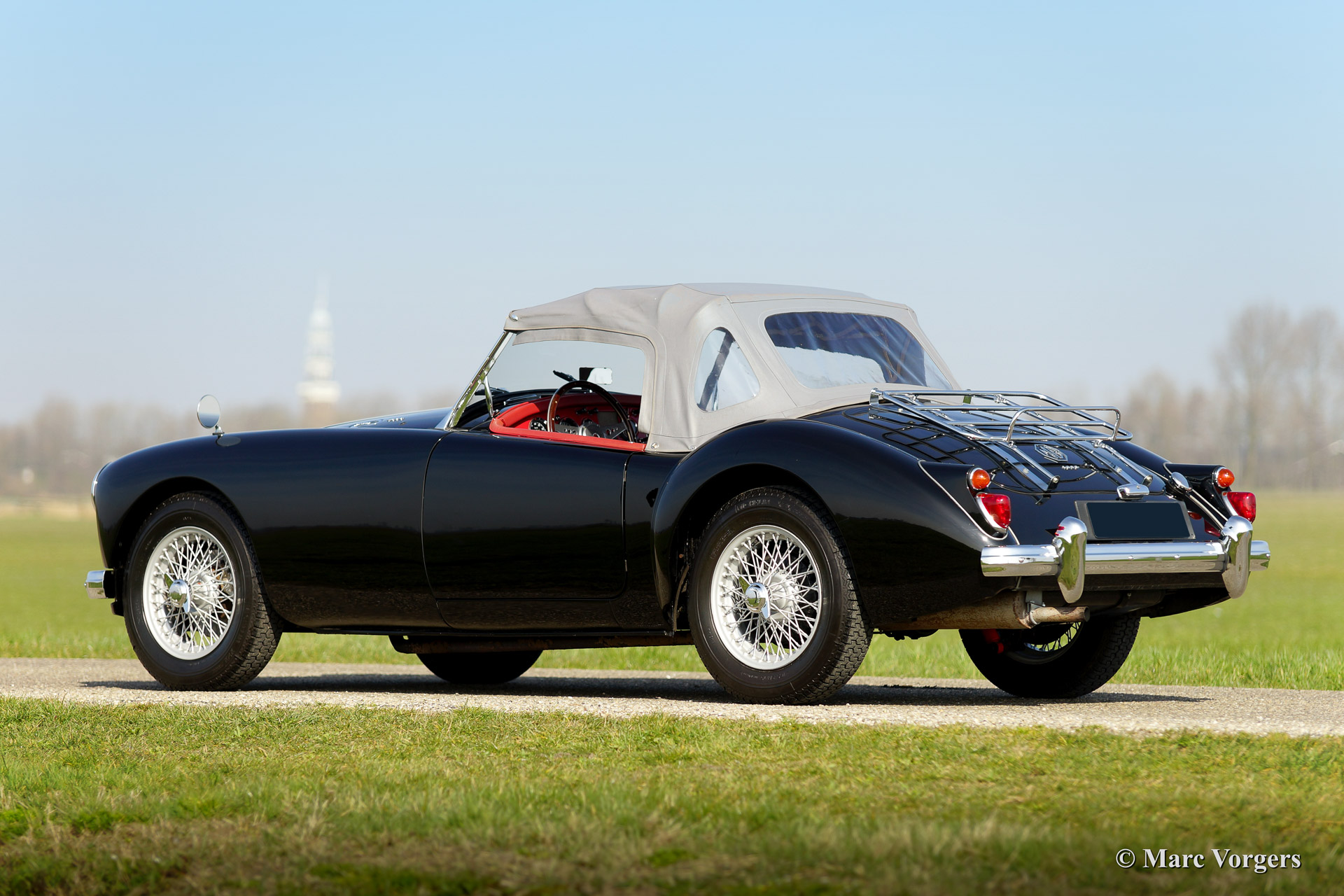 MG MGA 1600 roadster, year 1960. Colour black with a red leather interior and black carpet. Grey vinyl soft top. This fantastic MG MGA 1600 roadster was extensively restored, the automobile is in superb (excellent+) condition! The car comes with a Heritage certificate. This MGA features enameled wire wheels, a chrome luggage rack and Michelin tires.