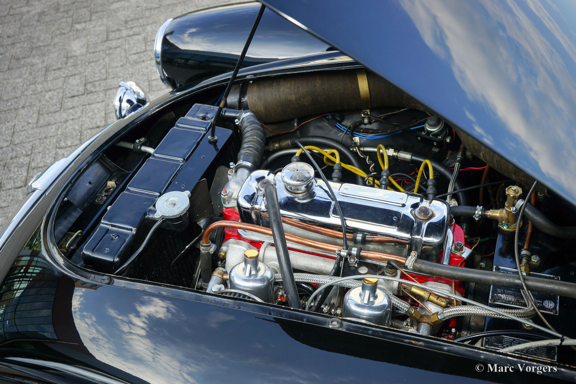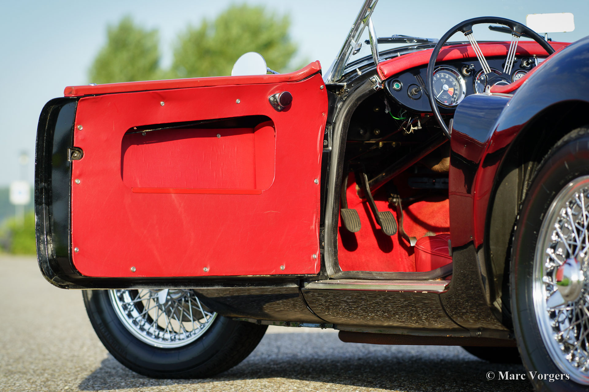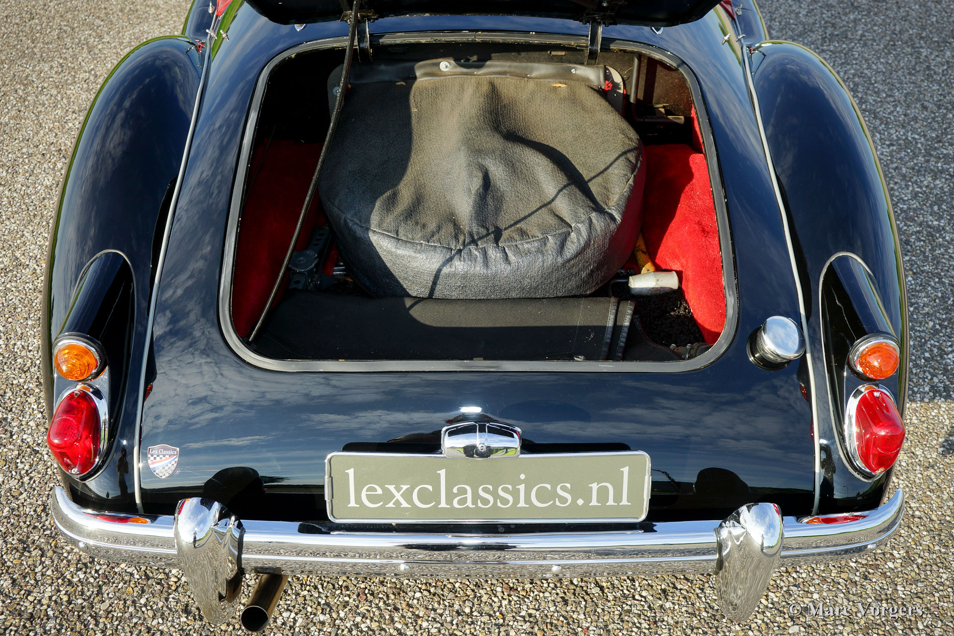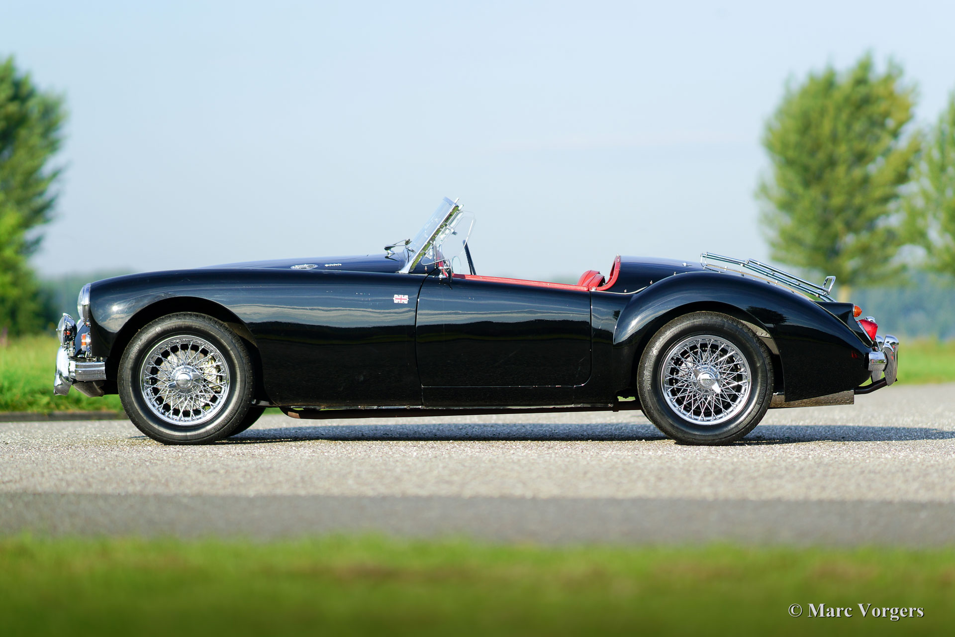 MG MGA 1600 roadster, year 1960. Chassis number GHNL7277X. Colour black with a red leather interior, red carpet and black protective mats with embroidered MG logo. Black mohair soft-top. This beautiful MGA roadster was extensively ‘body-off’ restored in the past. This fine MG is in very good condition and the car drives delightfully! This MGA 1600 roadster features chrome wire wheels, chrome ‘knock-off’ wheel-nuts, rear-view mirrors on both sides, side screens, additional lamps at the front (fog and spot) and a chrome luggage rack. Experience the fantastic classic open top driving experience this gorgeous MGA roadster has to offer!