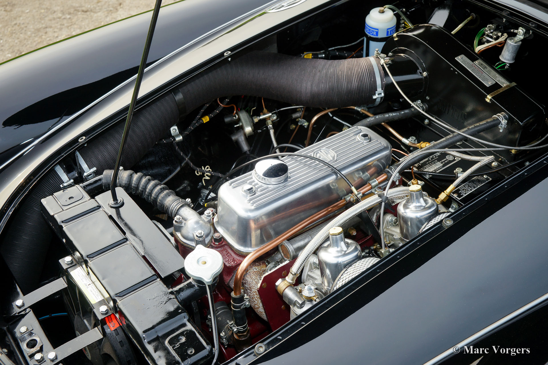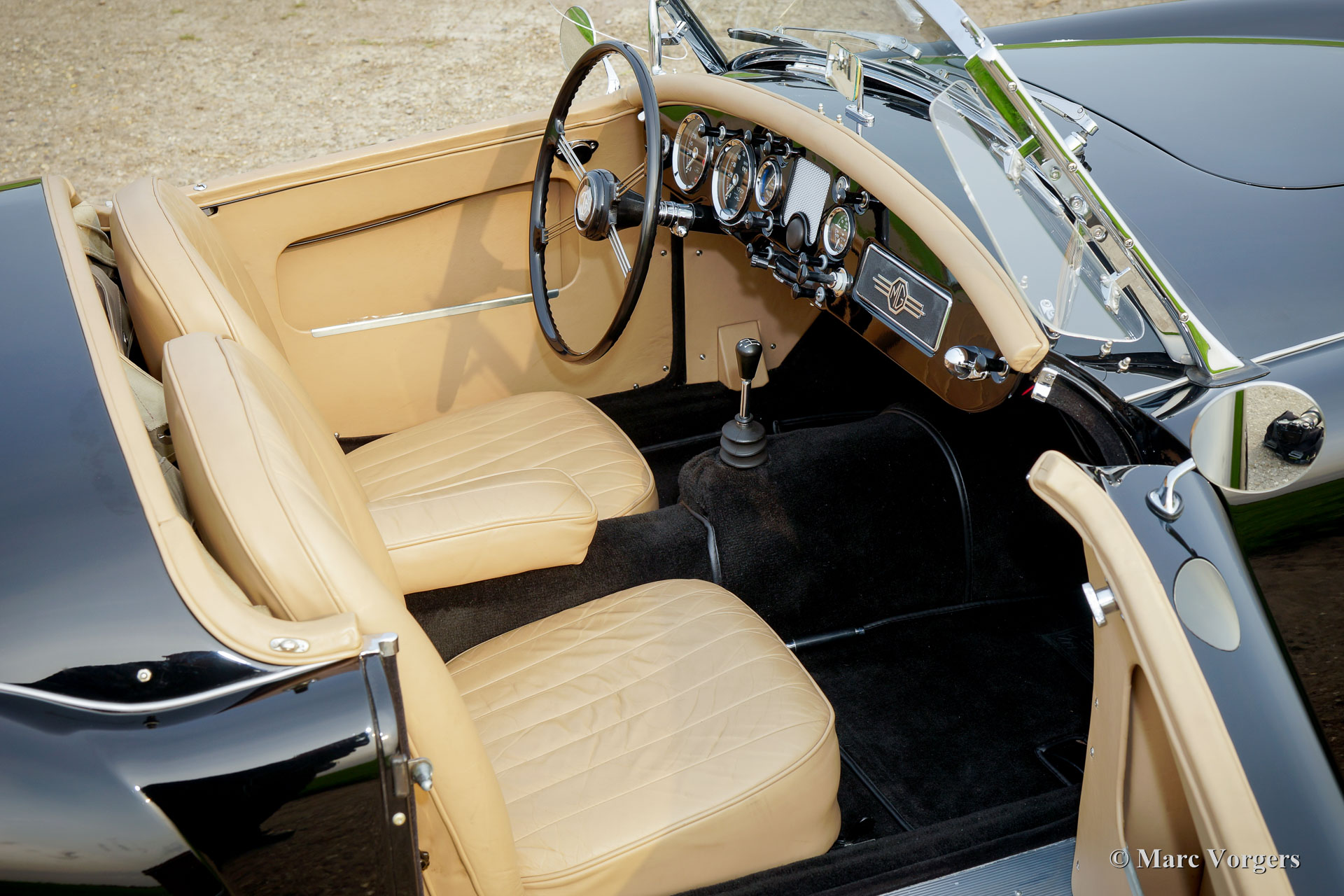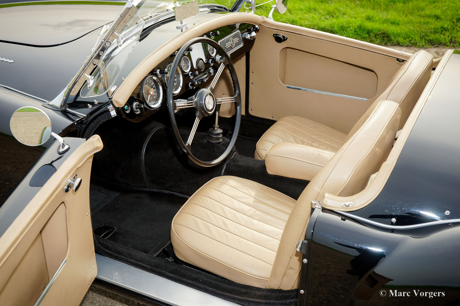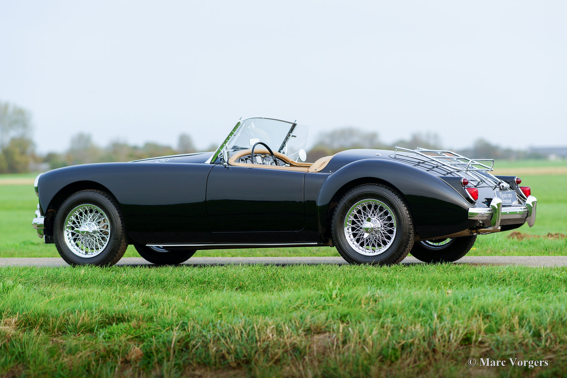 MG MGA 1600 roadster, year 1960. Colour black with a beige leather interior and black carpet. Beige canvas soft-top, tonneau-cover and aluminium side-curtains. A Heritage certificate is present which confirms that the body, engine and gearbox are factory original: Matching numbers. This gorgeous MGA 1600 roadster was extensively and perfectly restored by an internationally renowned restoration firm in the Netherlands. This automobile is in superb top condition and the car drives perfectly! An extensive photo reportage and in voices of the restoration are present giving detailed insights in the works which have been carried out. Overhauled are amongst others: the engine, gearbox, brakes and all the dashboard instruments (gauges). The chassis was sand blasted and coated. The body was restored and given a perfect new paint system from the bare metal up. The original brightwork was re-chromed. Renewed were amongst others: the wiring-loom, radiator, electric (Kenlow) cooling fan, aluminium rocker cover, chrome wire wheels, Michelin tyres, chrome baggage rack and exhaust (now Stainless-Steel). This MGA features the beautiful original steering wheel and the original tool-set. This is a magnificent specimen and a delightful driver!