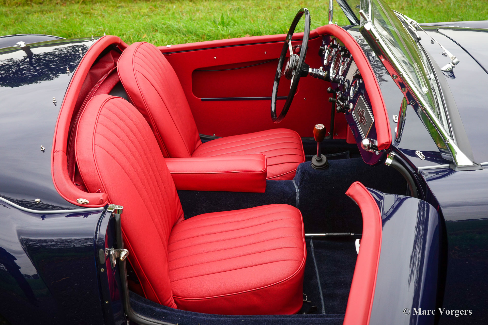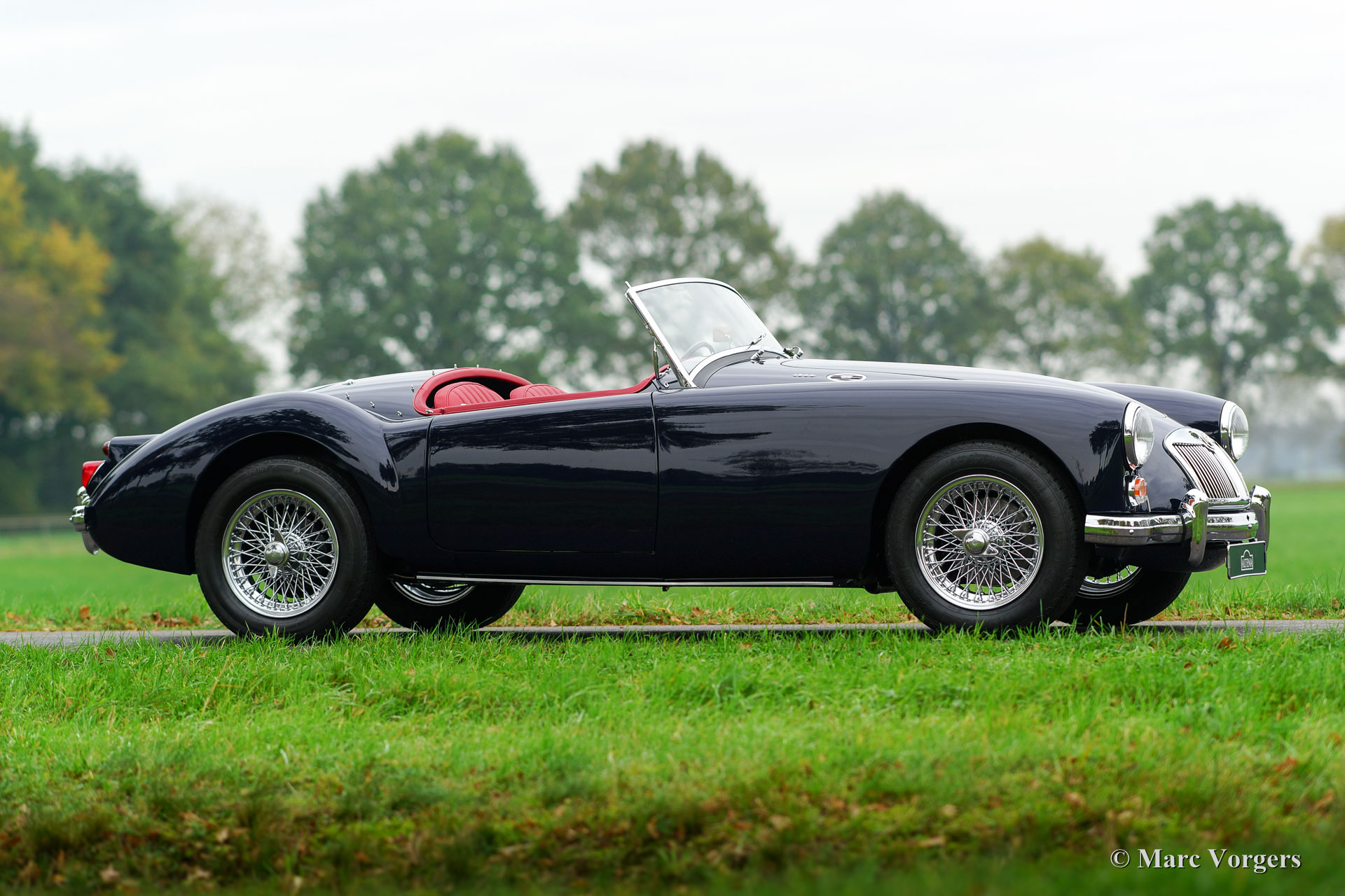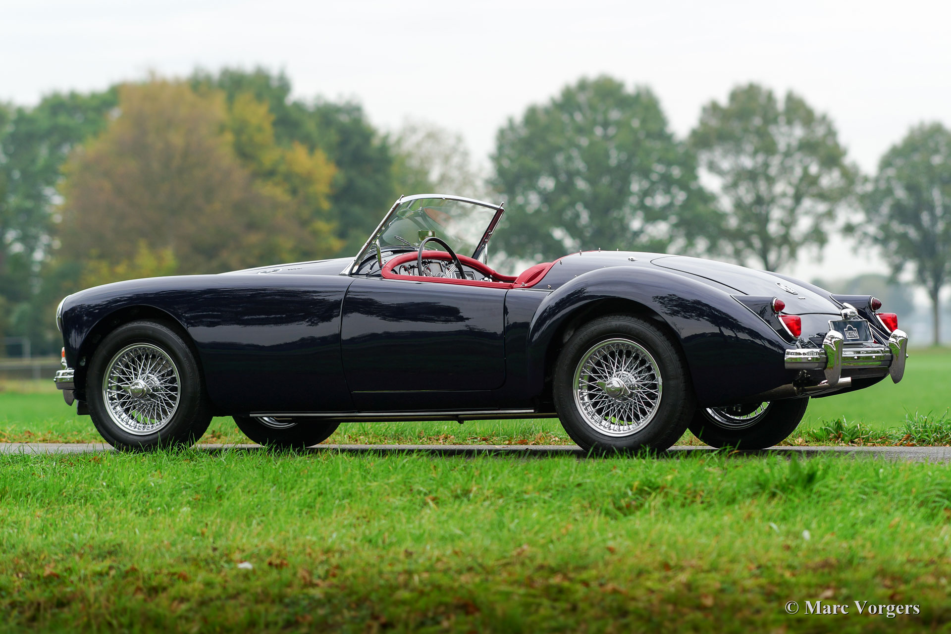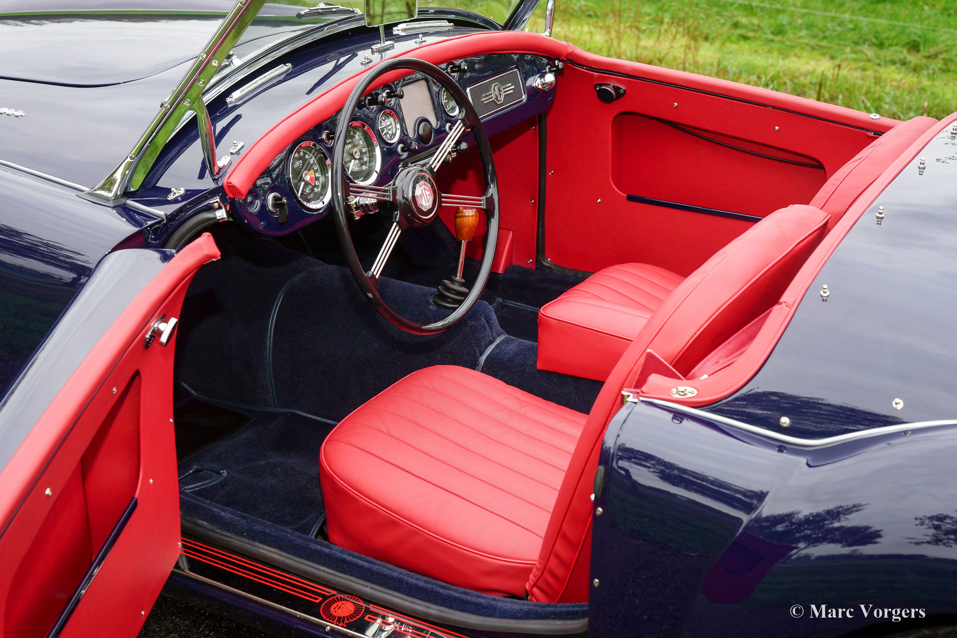 MG MGA 1600 roadster, year 1960. Colour dark blue with a red leather interior and dark blue carpet. Red soft-top, tonneau-cover and aluminium side-curtains. This gorgeous MGA 1600 roadster was extensively and perfectly ‘body-off’ restored by an MG specialist. This MGA is in pristine concours condition! Everything was restored and/ or renewed. The engine and gearbox were overhauled, new wiring loom fitted, brakes renewed (disc brakes at the front) and even all the dashboard gauges were overhauled and restored. The body shows beautiful panel fit, superb paint and magnificent chrome trim. This MGA roadster features the original steering wheel and a Stainless-Steel exhaust. This is a superbly driving MGA, a TOP specimen!