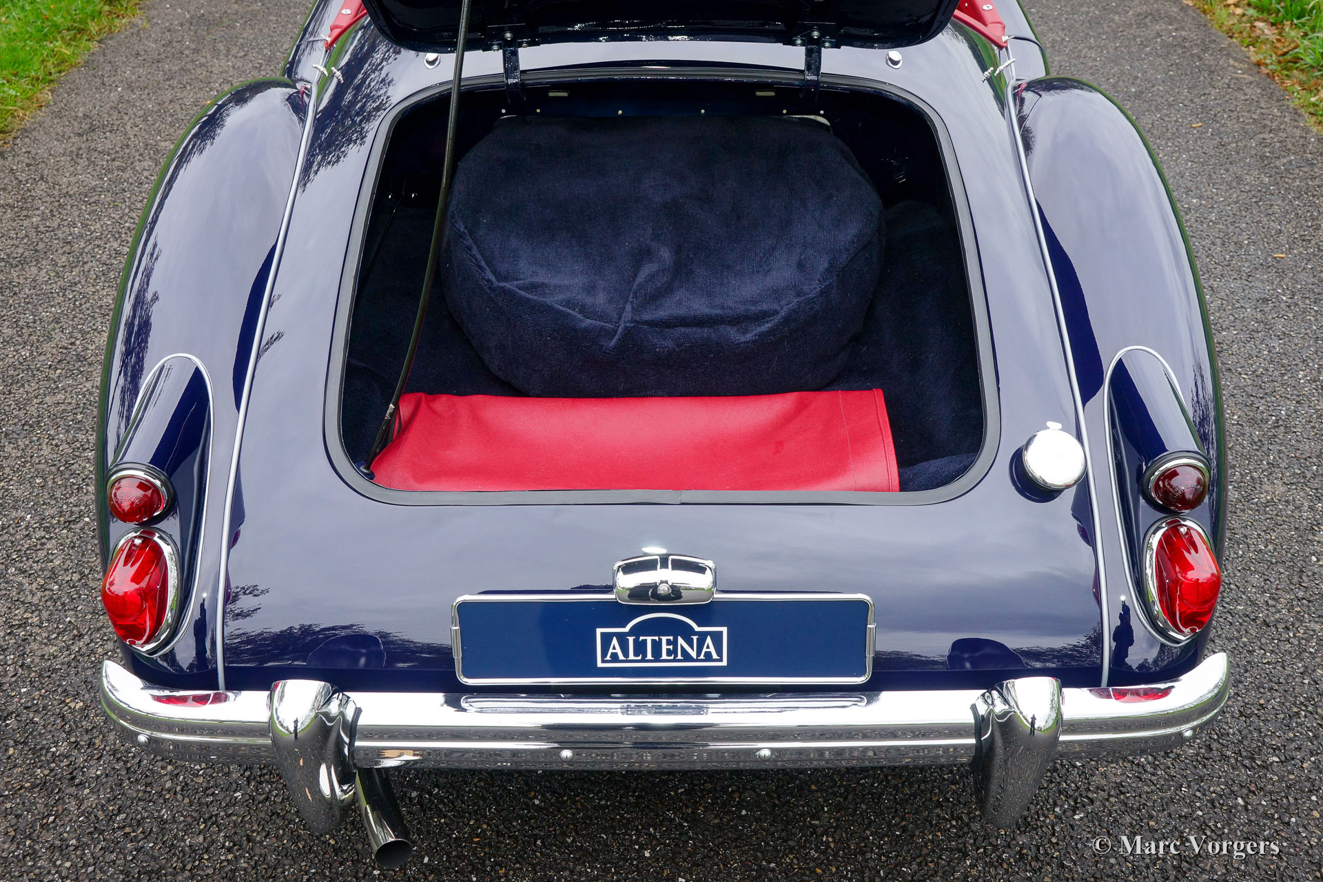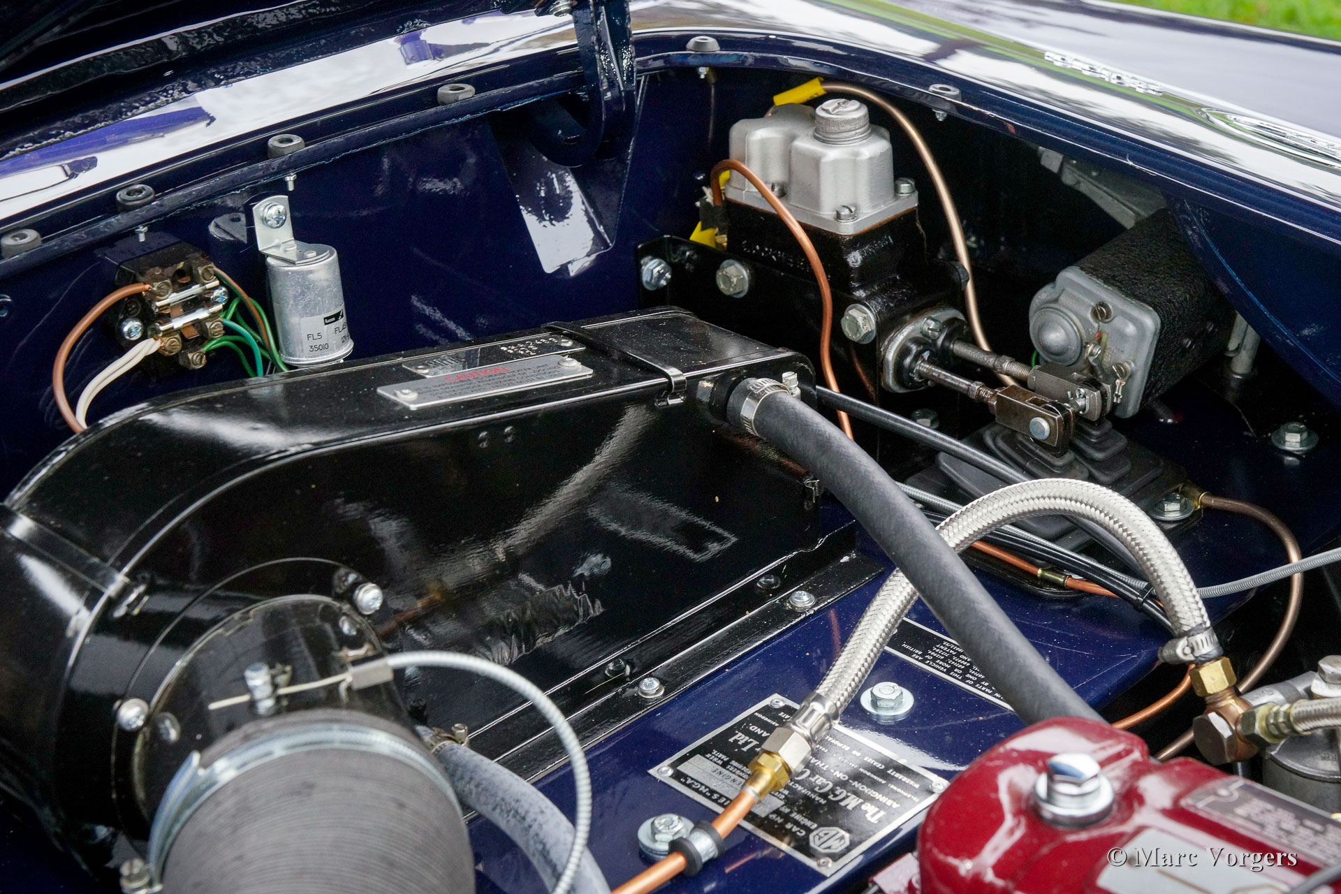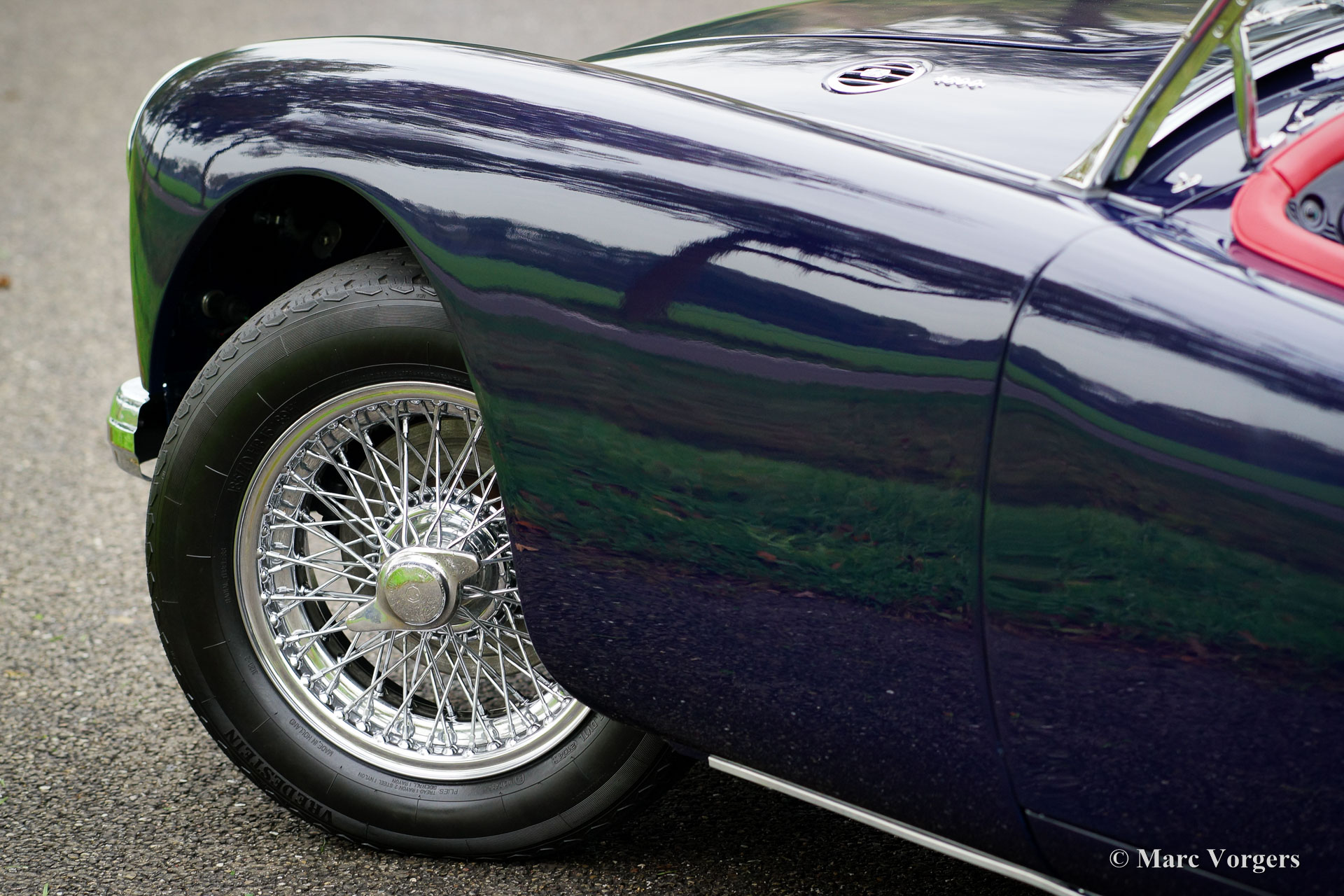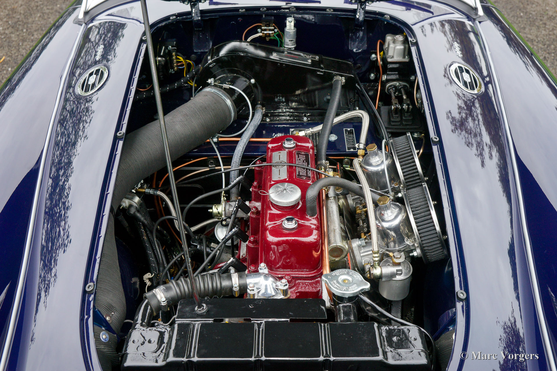 MG MGA 1600 roadster, year 1960. Colour dark blue with a red leather interior and dark blue carpet. Red soft-top, tonneau-cover and aluminium side-curtains. This gorgeous MGA 1600 roadster was extensively and perfectly ‘body-off’ restored by an MG specialist. This MGA is in pristine concours condition! Everything was restored and/ or renewed. The engine and gearbox were overhauled, new wiring loom fitted, brakes renewed (disc brakes at the front) and even all the dashboard gauges were overhauled and restored. The body shows beautiful panel fit, superb paint and magnificent chrome trim. This MGA roadster features the original steering wheel and a Stainless-Steel exhaust. This is a superbly driving MGA, a TOP specimen!