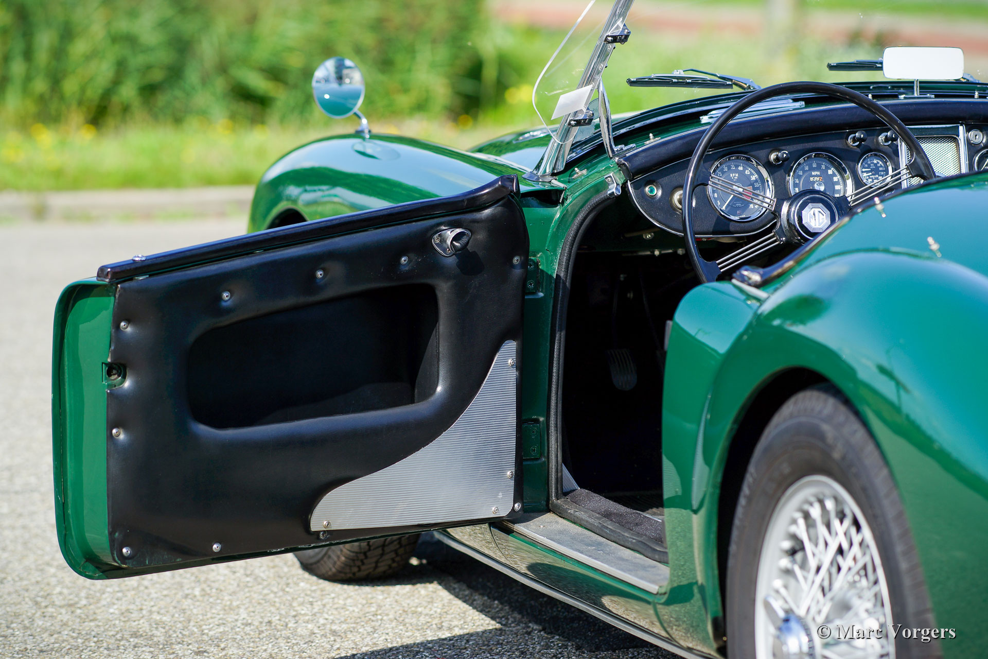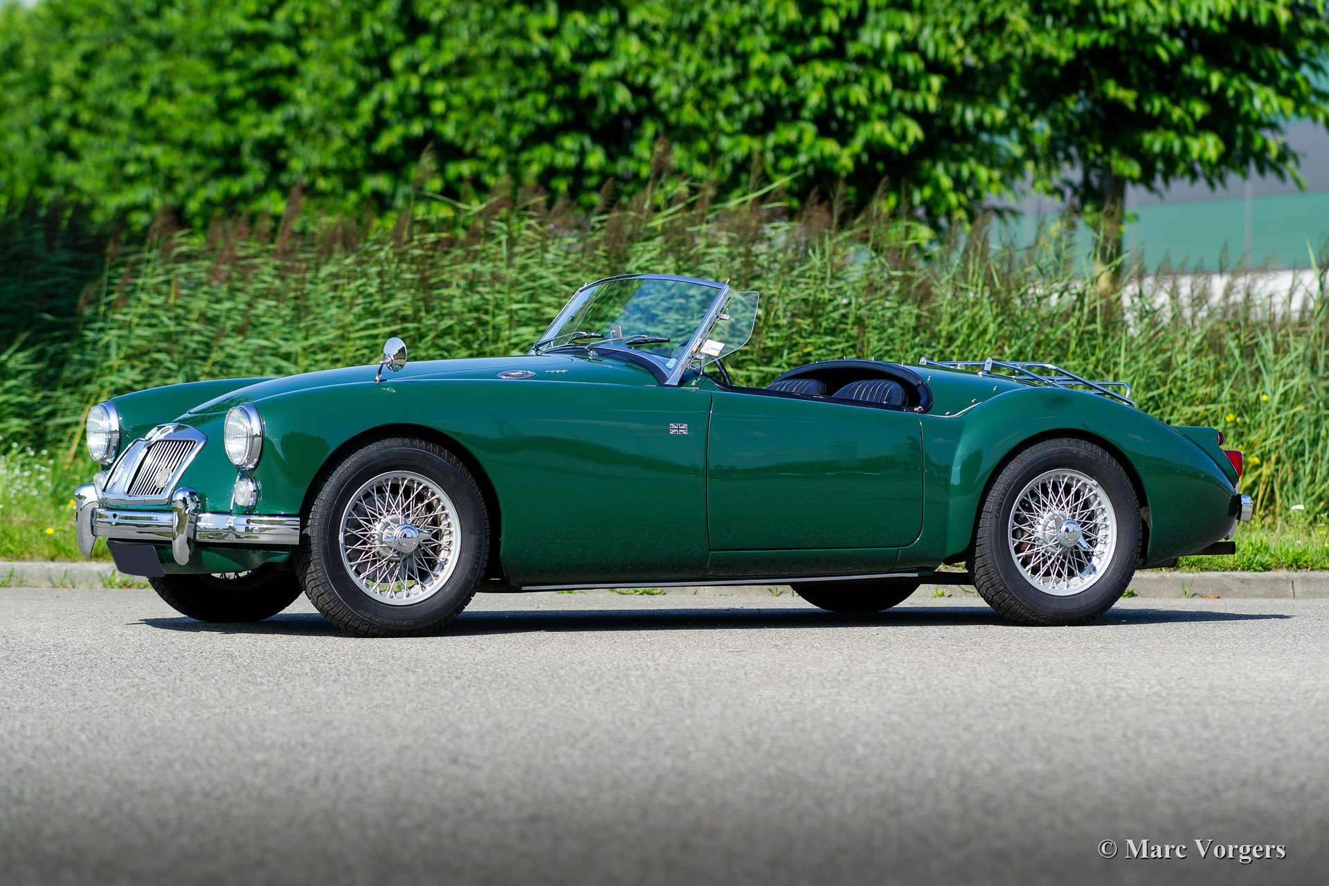 MG MGA 1600 roadster, year 1960. Colour British Racing Green combined with a black interior and black carpet. Black soft-top, black tonneau cover and aluminium side-screens. This wonderful MGA 1600 roadster was restored at some point in time. The car is in very good condition, showing some traces of use, and the car drives perfectly. This MGA features a very nice luxury dashboard clad with black vinyl. Very nice is the presence of the original steering wheel. The car is fitted with silver painted wire wheels, a chrome baggage rack, kick-panels on the door cards and wire mesh ‘stone protectors’ on the head lamps.