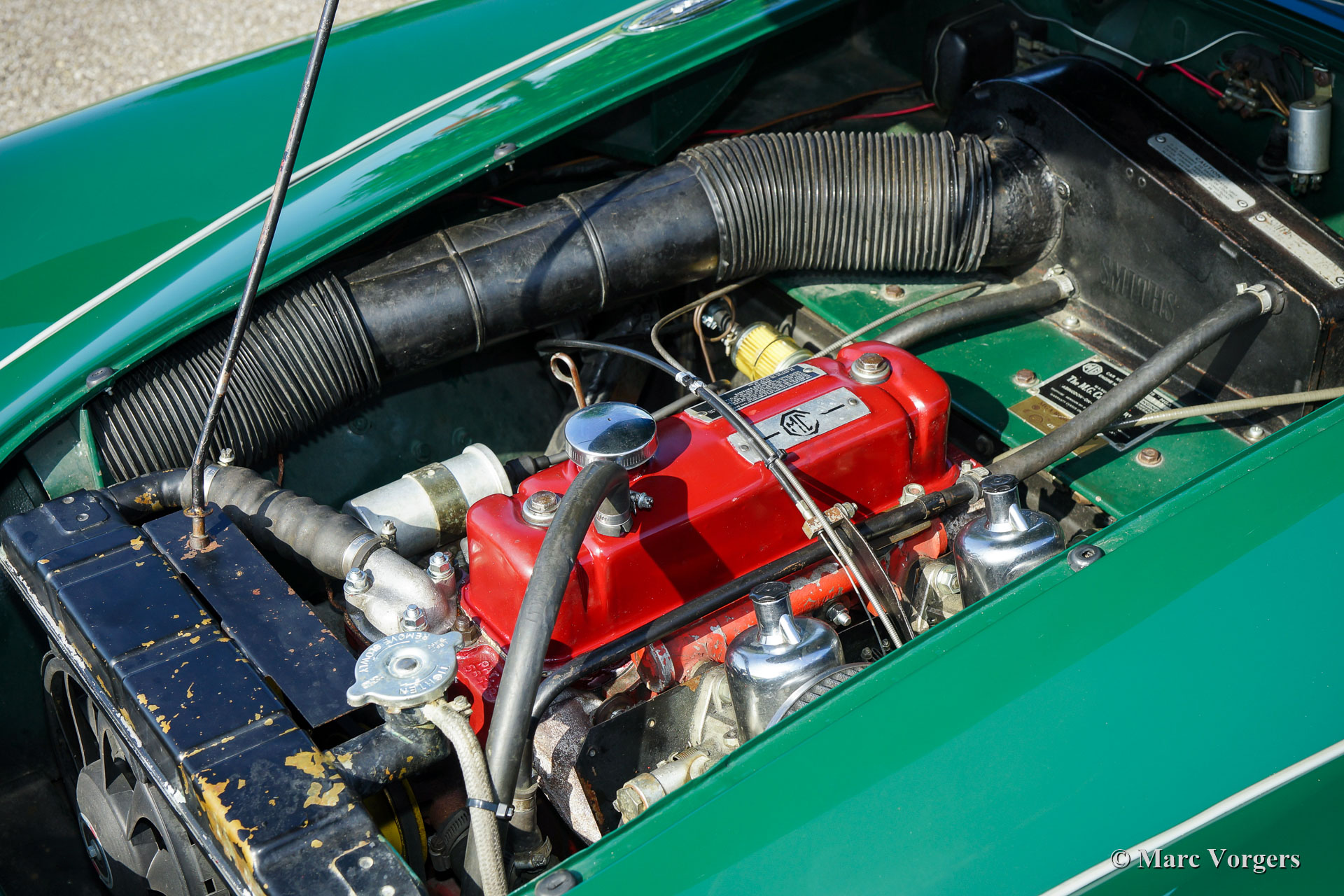 The year 1955 saw the introduction of the MGA. With this design the MG broke new grounds. After its predecessors MG TD and MG TF, which were largely based on the pre-war MG TB, it was a roadster with a very modern sporty design. Like its predecessors, the MGA was a great success and, like before, the greater part was sold in America. Until 1959, the MGA was equipped with a 1459 cc four-cylinder engine. From that year, the car was fitted with a 1588 cc four-cylinder. A 1622 cc four-cylinder engine replaced the 1588 cc. engine in 1961. The early MGA versions had very good drum brakes until 1959, but after that year, the MG A was equipped with disc brakes on the front wheels. The year 1962 saw the production of the MGA, the A 1600 Mk II. The MGB replaced this very popular British sports car, and was to develop the success of the MG A even further.