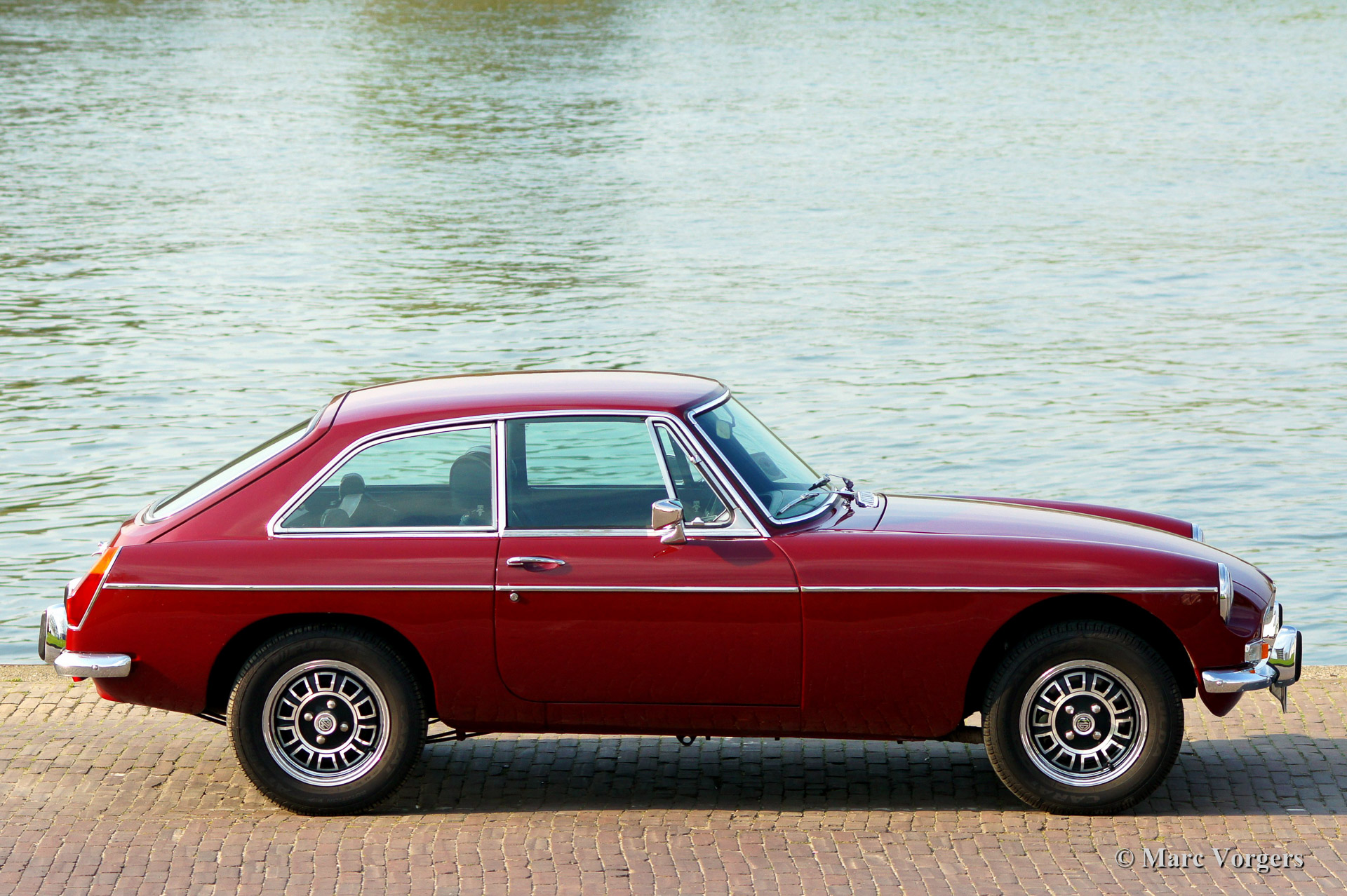 MG MGB GT V8, year 1974 (first registration 1975). Colour damask red with a black fabric/leatherette interior. This MGB GT V8 is fitted with a Stainless Steel sports exhaust, sports air filters, Mallory electronic ignition, a leather trimmed steering wheel and beautiful original alloy wheels.