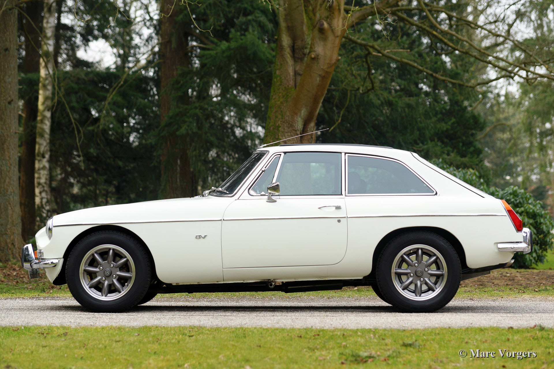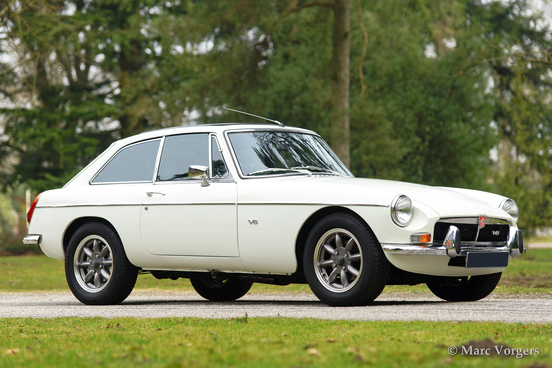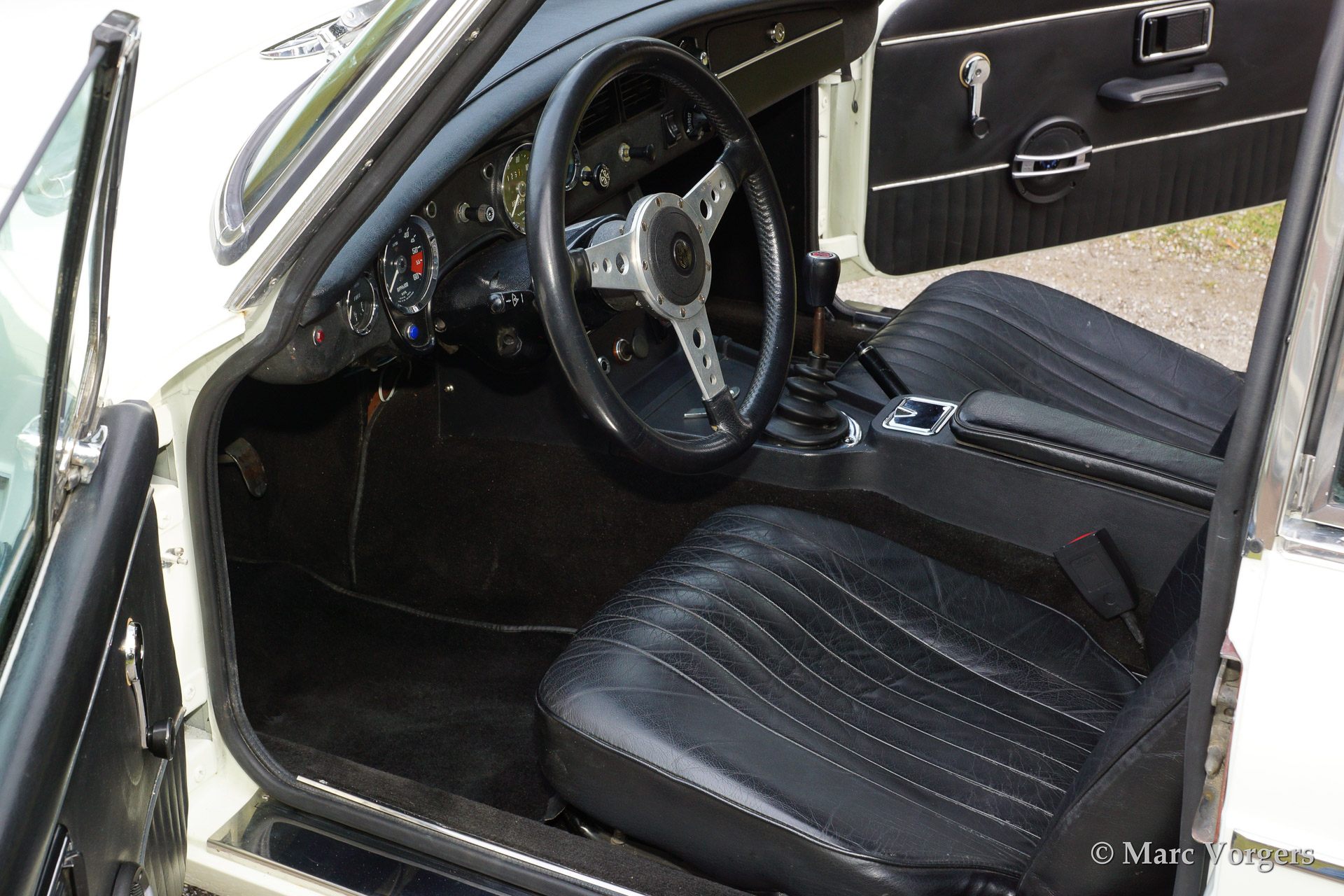 MG MGB GT V8, year 1975. Colour Old English White with a black leather interior. The car features a very convenient Webasto sliding/folding roof, beautiful 'Minilite' alloy wheels with grey metallic centres/polished rims and a MotoLita sports steering wheel with leather rim. The engine sports a Offenhauser 360 manifold, 'four-barrel' Edelbrock carburettor, sports air-filtre and a 'free flow' exhaust system. Capacity 170 bhp. (dyno test).
