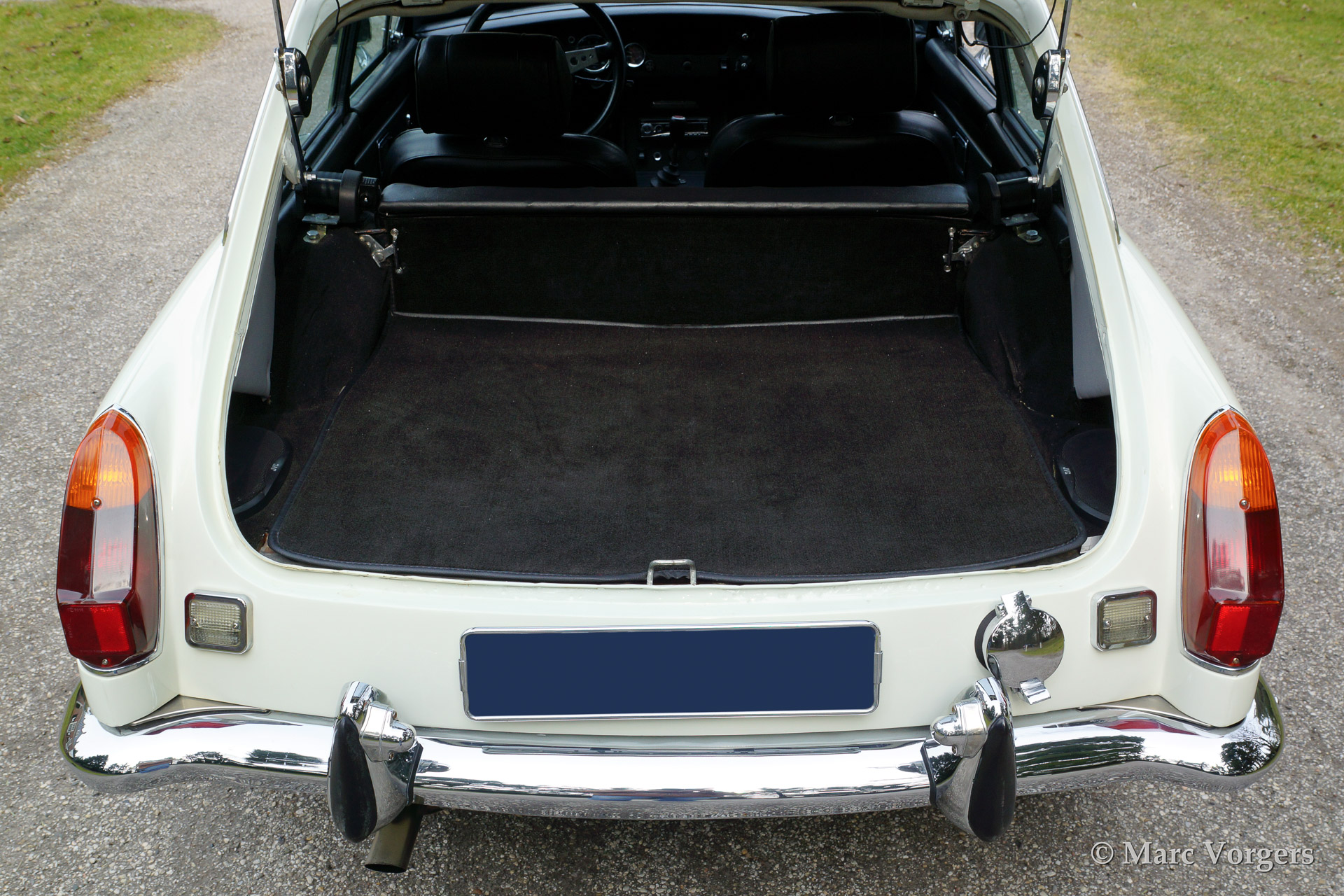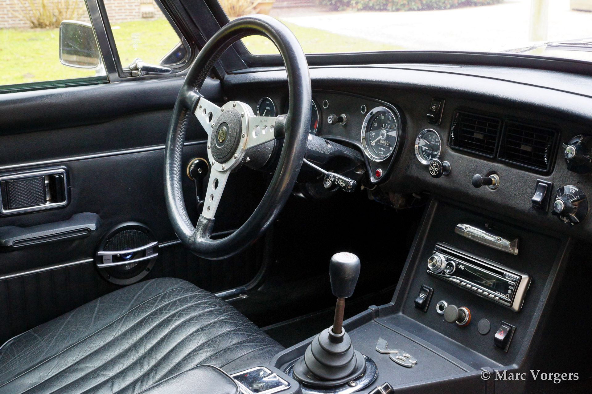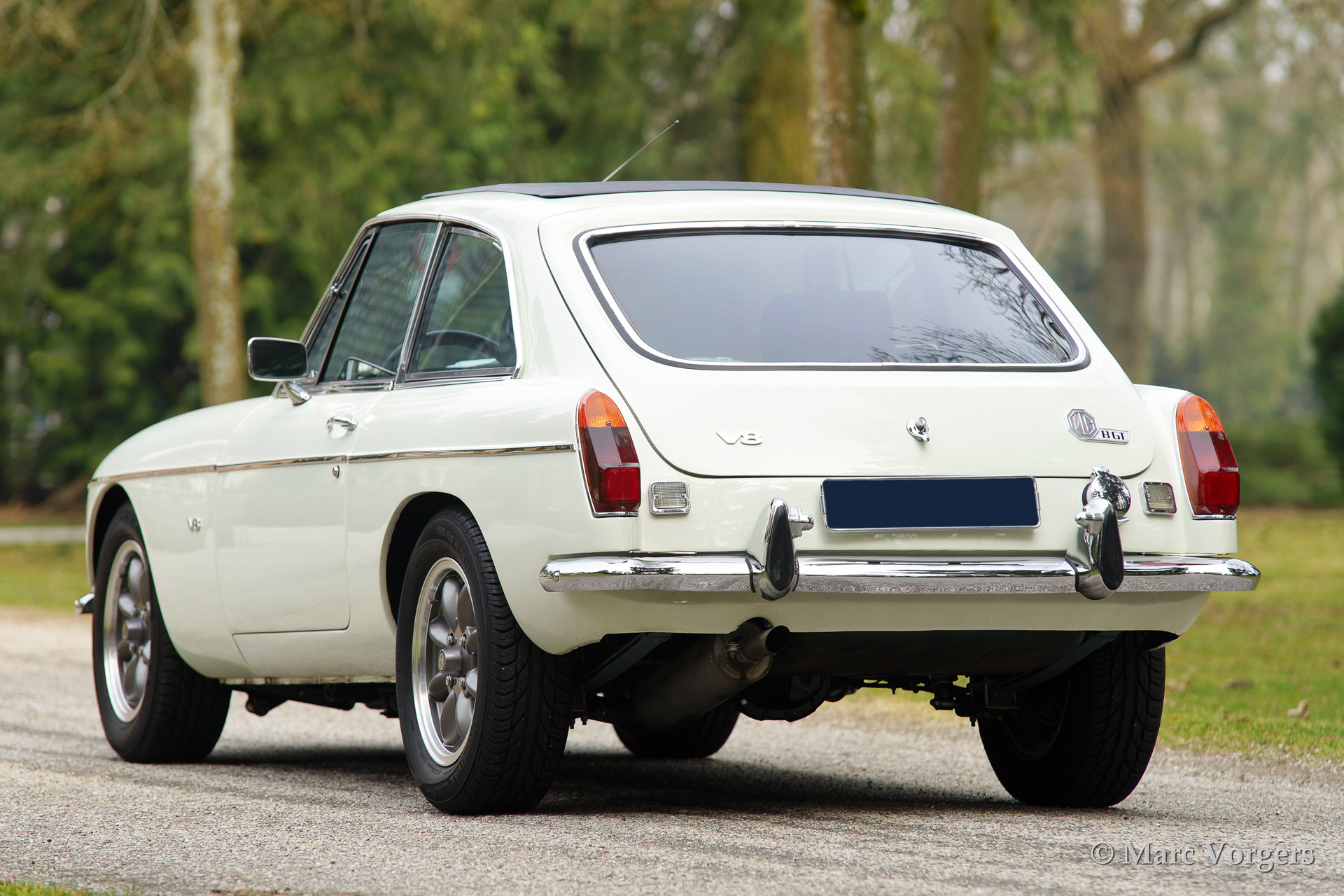 MG MGB GT V8, year 1975. Colour Old English White with a black leather interior. The car features a very convenient Webasto sliding/folding roof, beautiful 'Minilite' alloy wheels with grey metallic centres/polished rims and a MotoLita sports steering wheel with leather rim. The engine sports a Offenhauser 360 manifold, 'four-barrel' Edelbrock carburettor, sports air-filtre and a 'free flow' exhaust system. Capacity 170 bhp. (dyno test).