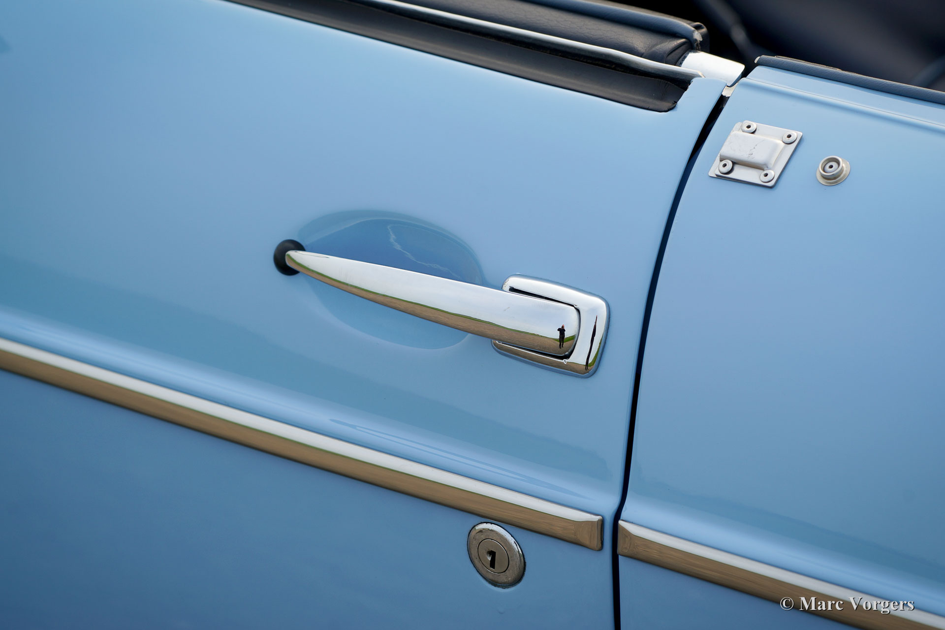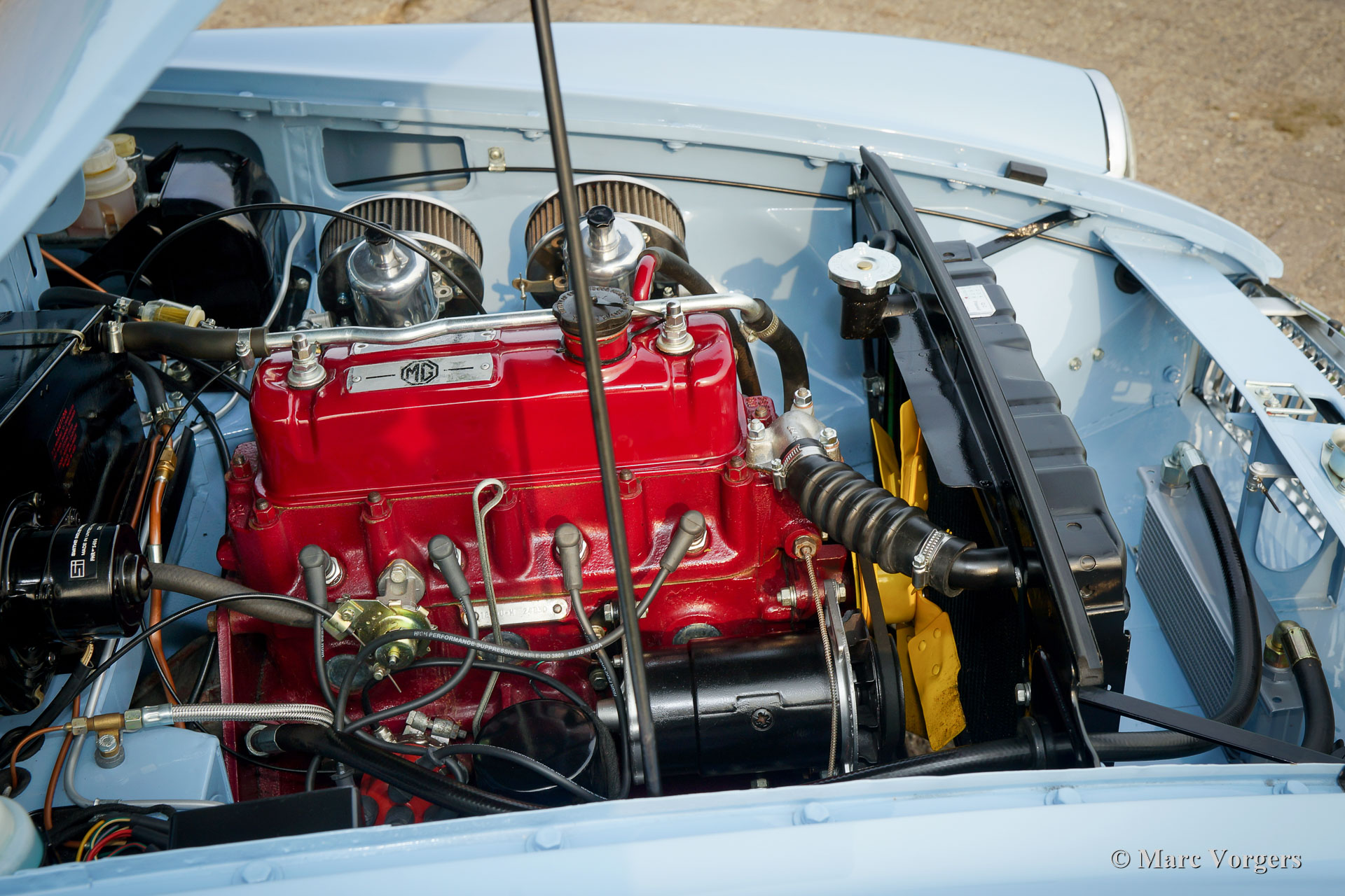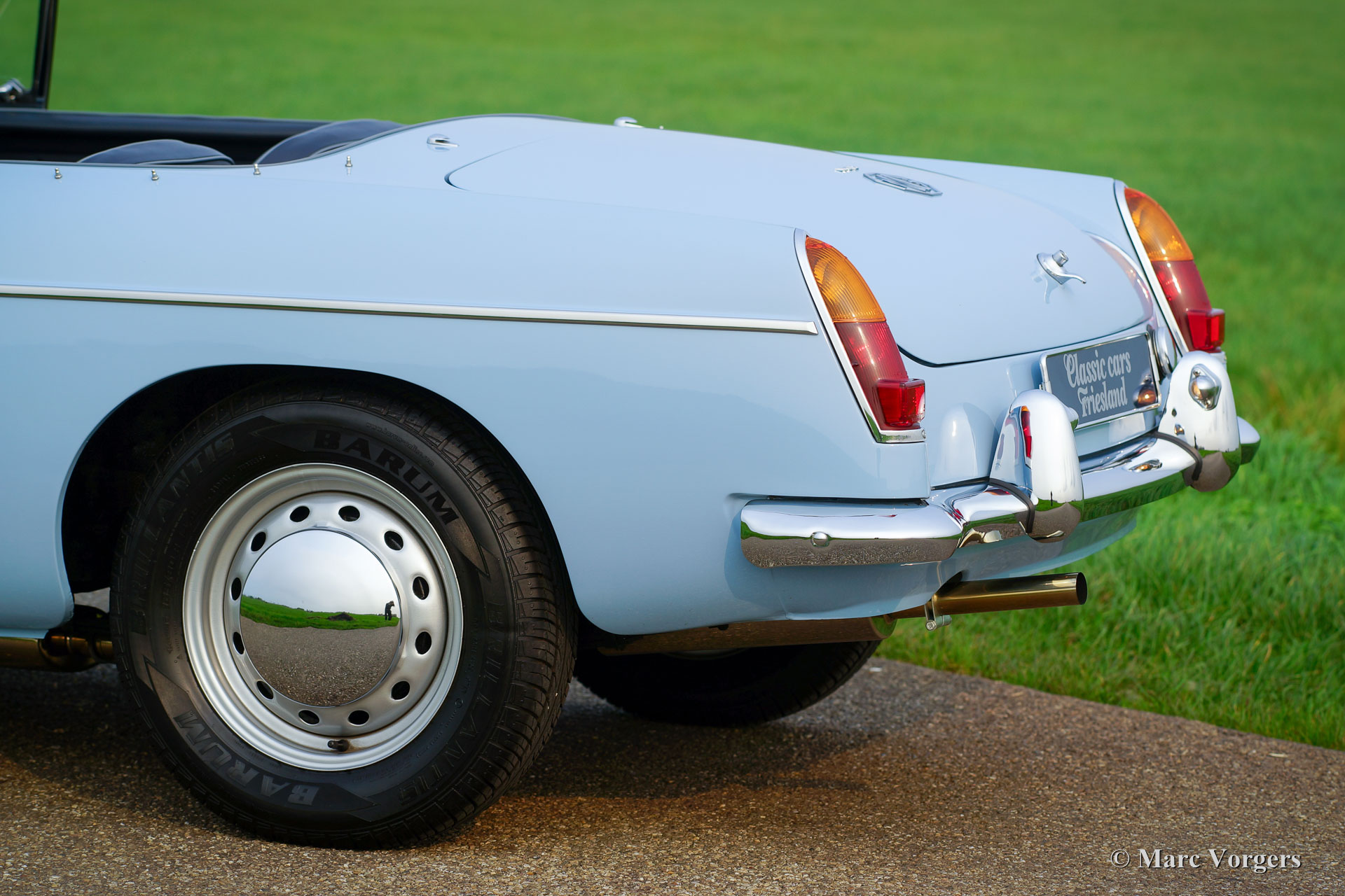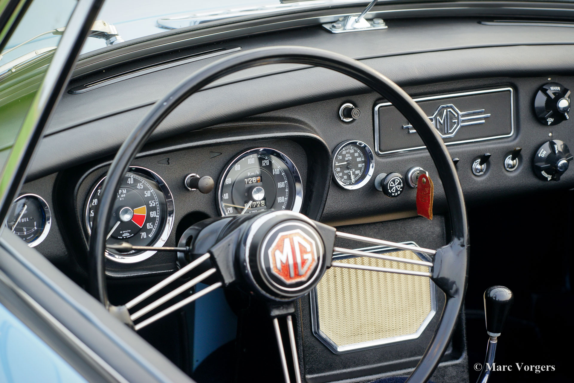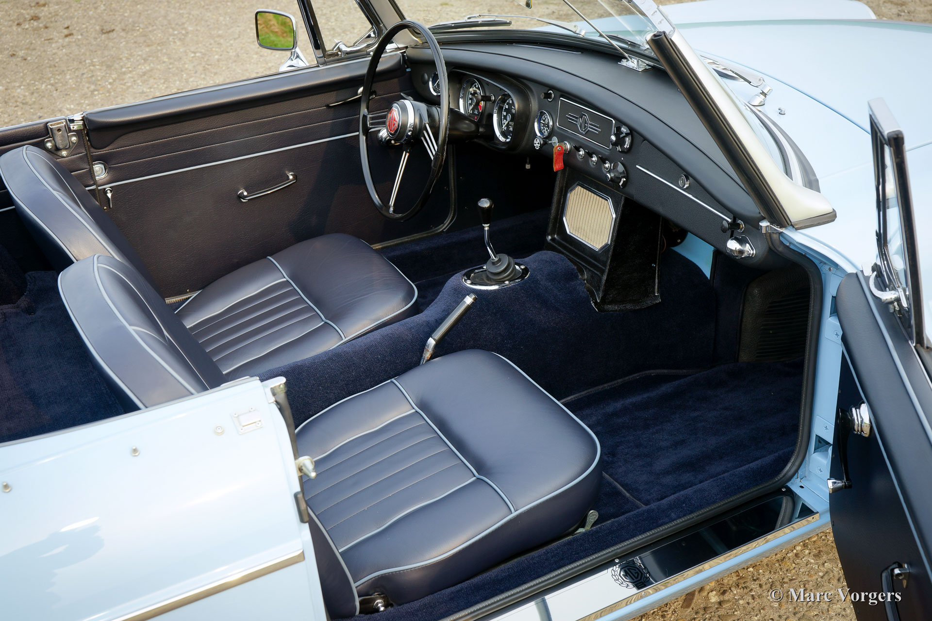 MG MGB roadster ‘pull-handle’ model, year 1963. Colour pale blue with a dark blue leather interior trimmed with pale blue piping. Luxurious dark blue carpet, black soft-top and hood-cover. This gorgeous MGB is an early ‘pull-handle’ model featuring the special door-handles and all the other special details like the early disc wheels with chrome hub-caps and the wonderful original steering boasting the big MG-logo. This fine MGB roadster was fully and perfectly restored and overhauled by a MG specialist in the Netherlands. The automobile is in better-than-new TO condition: Concours! An extensive photo reportage of the restoration is present. Amongst other components, the engine, gearbox, suspension and dashboard instruments (gauges) were overhauled. Amongst other parts the wiring-loom, brakes, radiator, bright work, windows, tyres and exhaust (now Stainless-Steel) were renewed. The steel disc wheels were stove enamelled, and the metal dashboard was beautifully painted with the factory correct black ripple-effect-paint. The body shows perfect panel-fit and top- class paint. Where ever you look; Everything is like new! The car comes with a Heritage Certificate which confirms that that body, engine and gearbox are factory original; Matching numbers. Also present is an original tool-set, owner’s manual and workshop manual. A rare TOP specimen and a delightful driver!