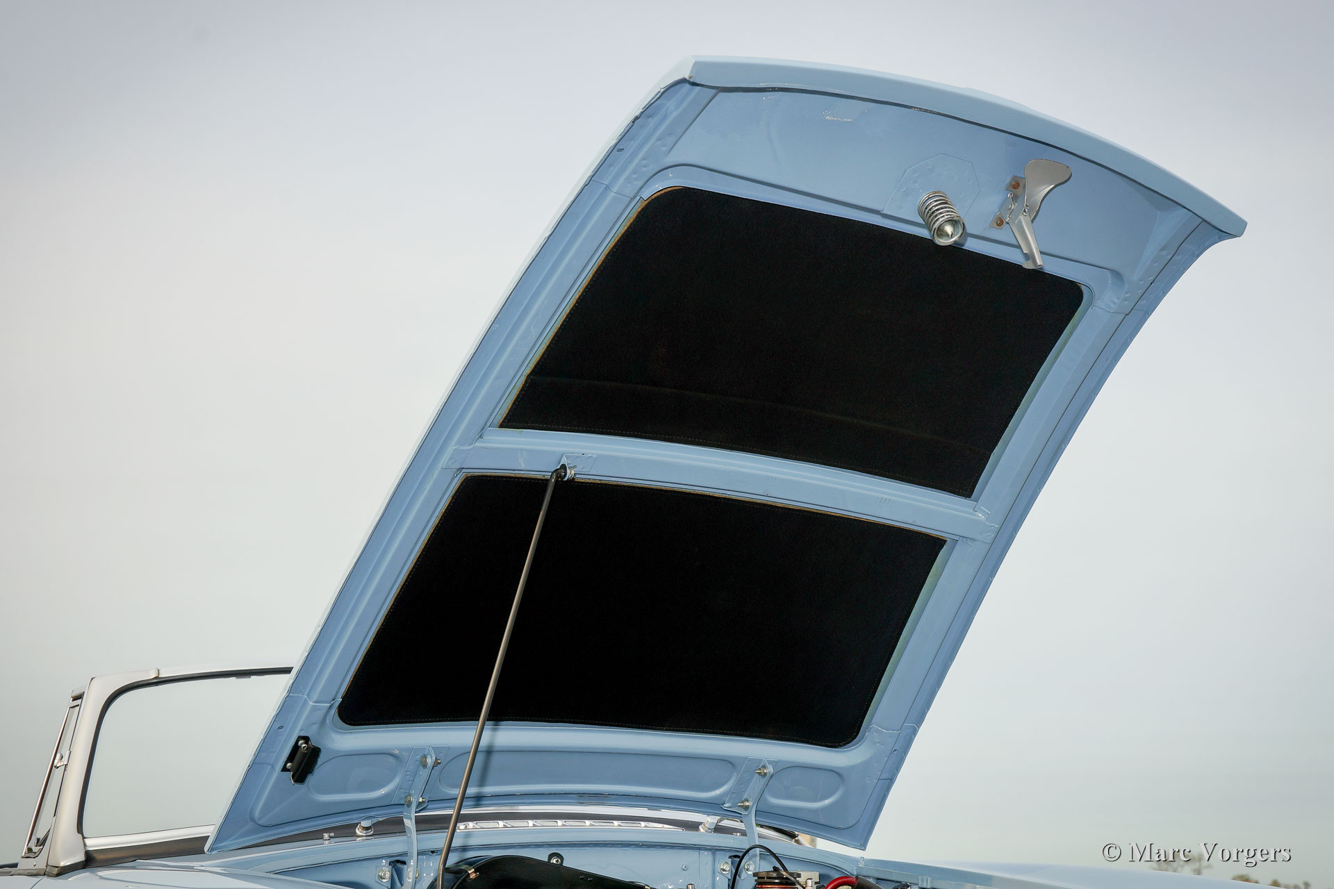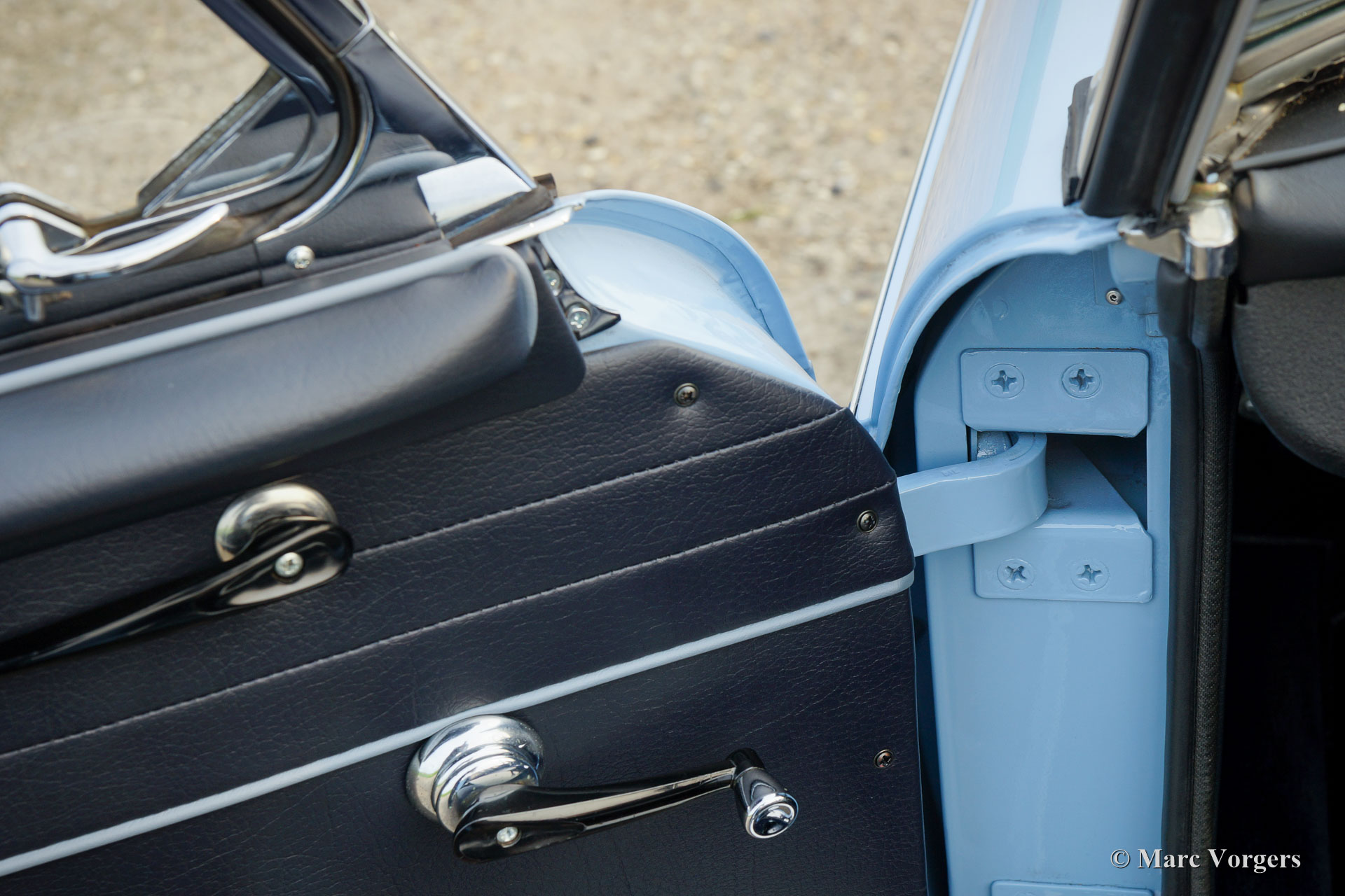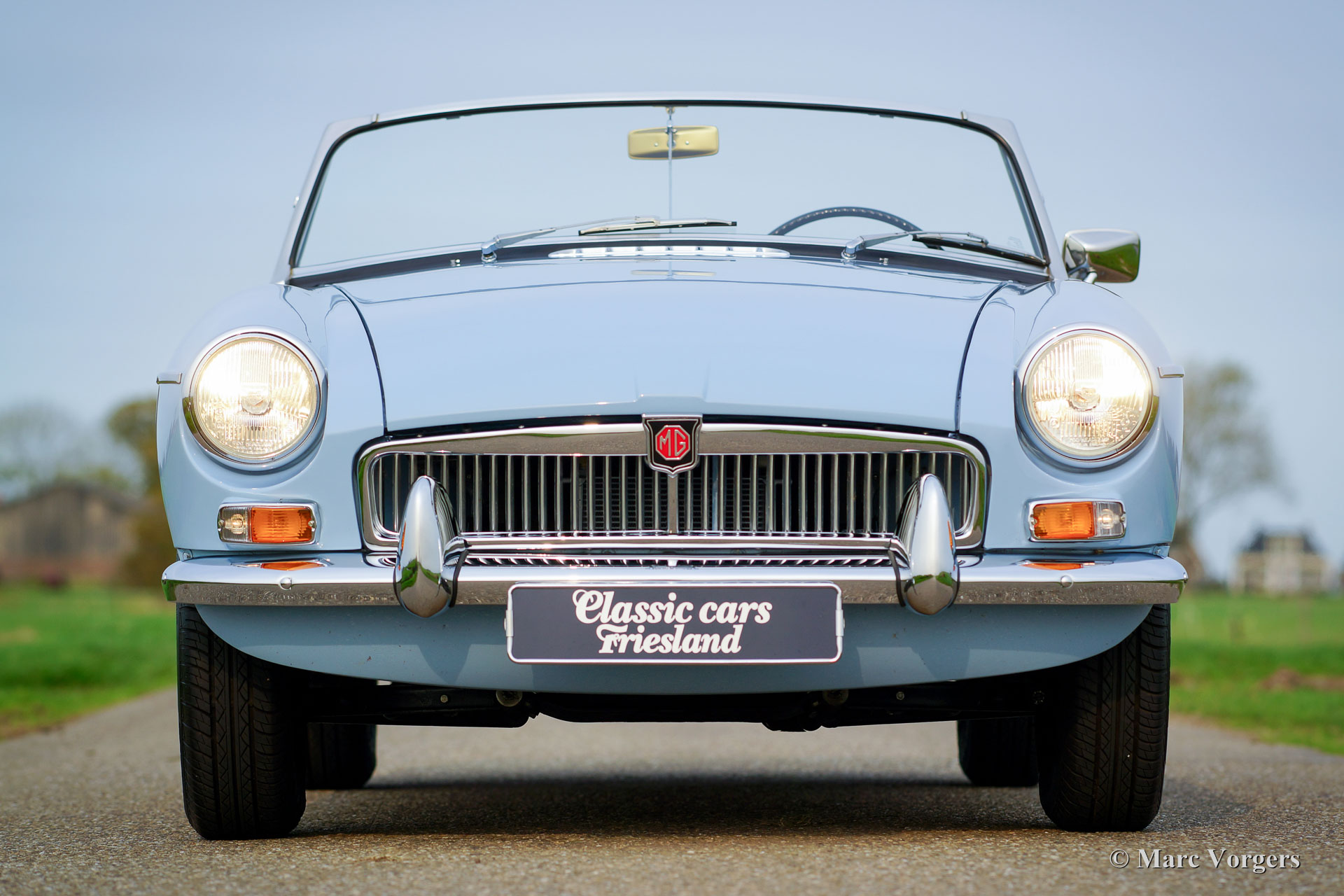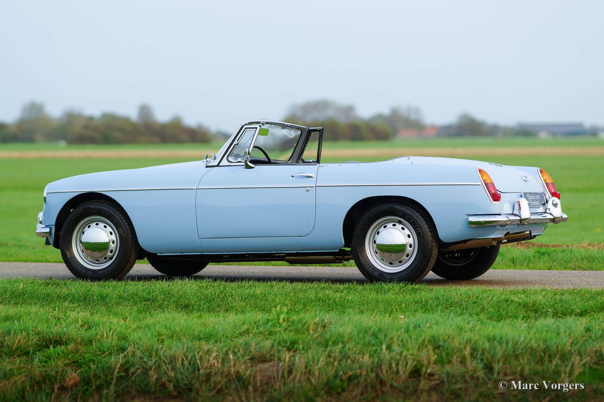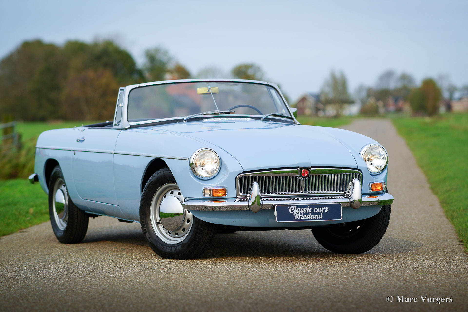 MG MGB roadster ‘pull-handle’ model, year 1963. Colour pale blue with a dark blue leather interior trimmed with pale blue piping. Luxurious dark blue carpet, black soft-top and hood-cover. This gorgeous MGB is an early ‘pull-handle’ model featuring the special door-handles and all the other special details like the early disc wheels with chrome hub-caps and the wonderful original steering boasting the big MG-logo. This fine MGB roadster was fully and perfectly restored and overhauled by a MG specialist in the Netherlands. The automobile is in better-than-new TO condition: Concours! An extensive photo reportage of the restoration is present. Amongst other components, the engine, gearbox, suspension and dashboard instruments (gauges) were overhauled. Amongst other parts the wiring-loom, brakes, radiator, bright work, windows, tyres and exhaust (now Stainless-Steel) were renewed. The steel disc wheels were stove enamelled, and the metal dashboard was beautifully painted with the factory correct black ripple-effect-paint. The body shows perfect panel-fit and top- class paint. Where ever you look; Everything is like new! The car comes with a Heritage Certificate which confirms that that body, engine and gearbox are factory original; Matching numbers. Also present is an original tool-set, owner’s manual and workshop manual. A rare TOP specimen and a delightful driver!