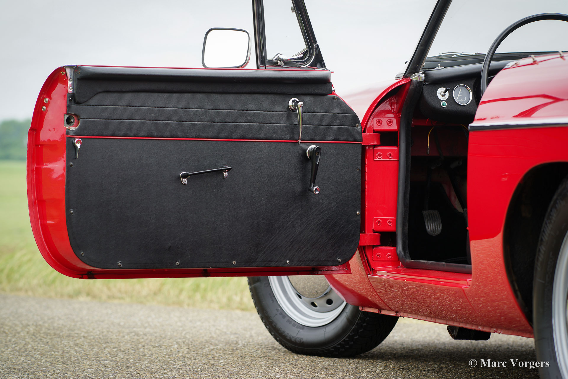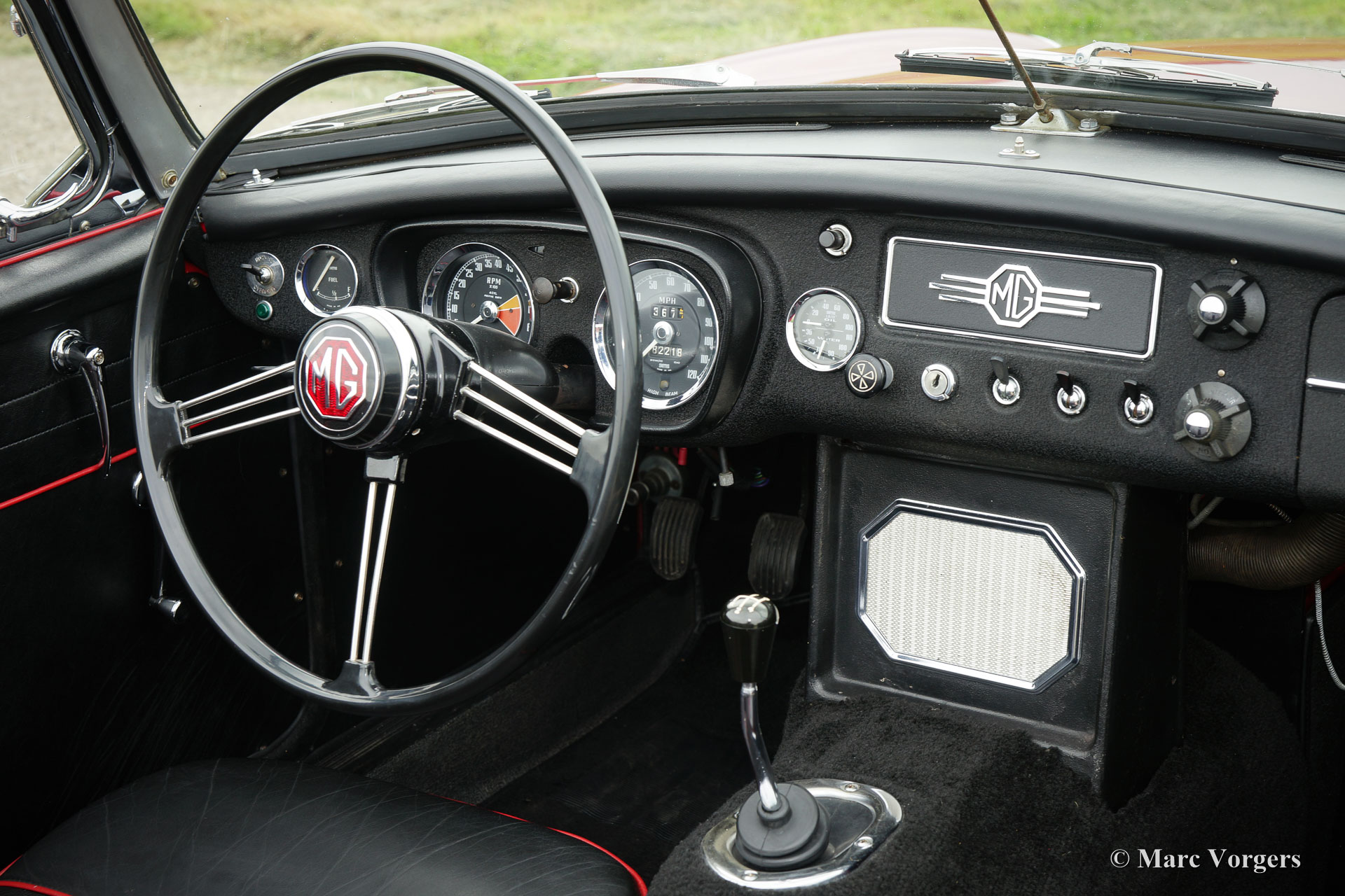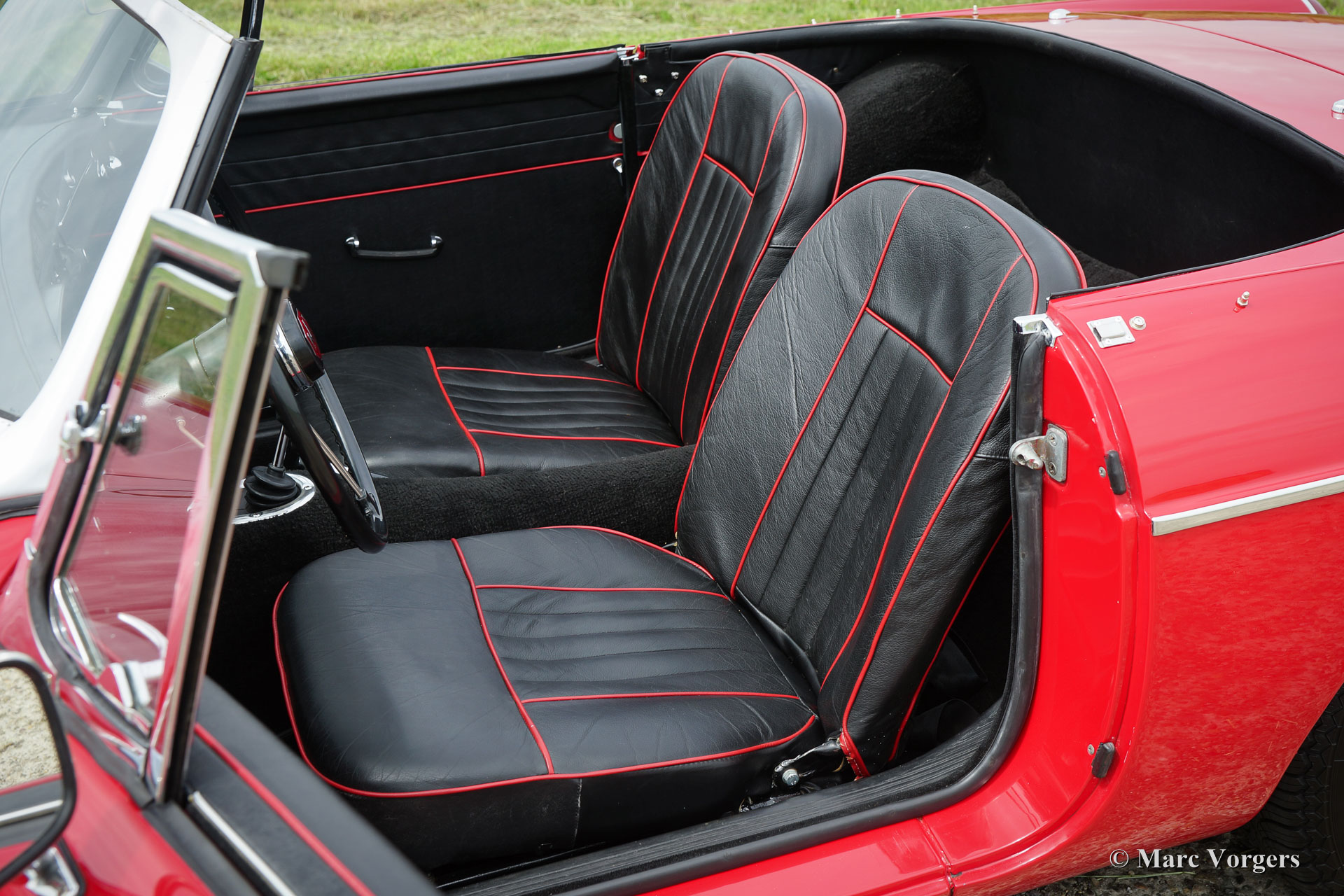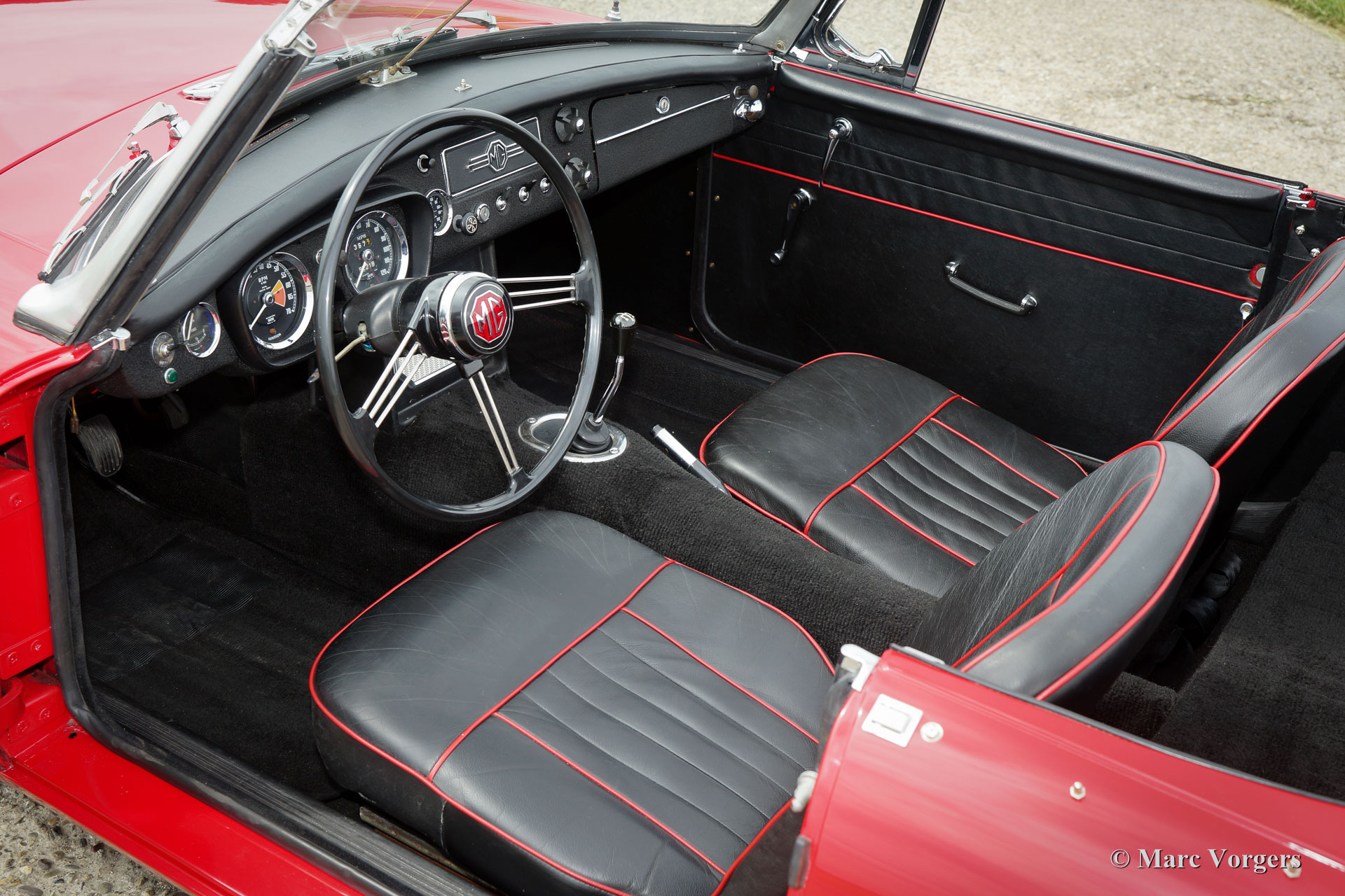 MG MGB roadster, year 1964. This is an early Mk I model with the special ‘pull-handles’ on the doors. Body colour red with a black leather interior trimmed with red piping. Black carpet, black soft top and hood cover. This wonderful MGB roadster was extensively ‘nut & bolt’ restored in the past, an extensive photo reportage of the restoration is present. This fine MGB roadster is in superb top-condition; concourse! The automobile shows all the original details like the steel disc-wheels with chrome hub-caps, the gorgeous original steering-wheel, the original shifter knob, the original air-filters and the original tools. In case you wish the car can be converted to wire wheels. This MGB roadster shows a crisp panel fit. The car is fitted with a four-speed gearbox with overdrive. This is a superbly driving, super original ‘pull-handle’ MGB in TOP-condition!