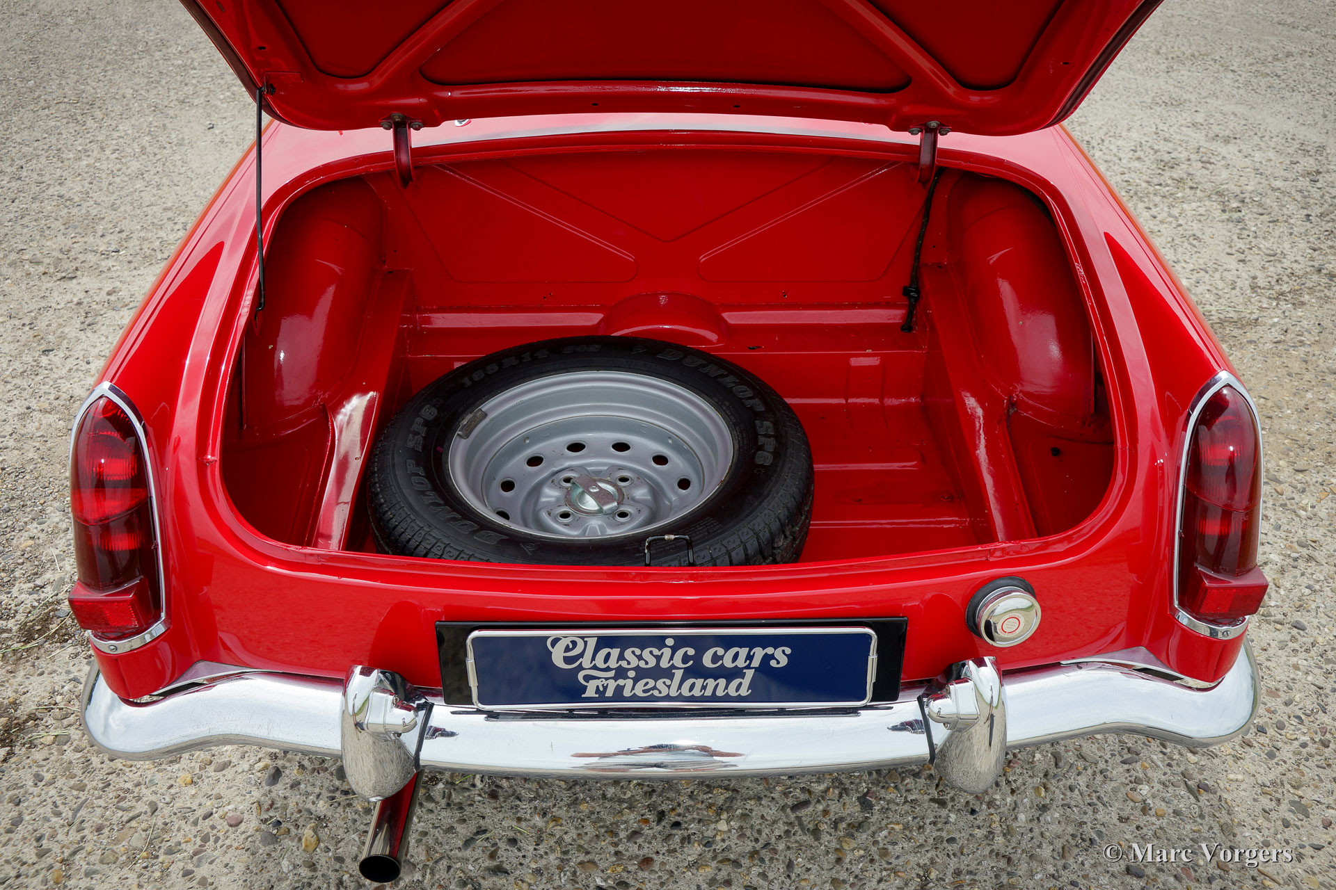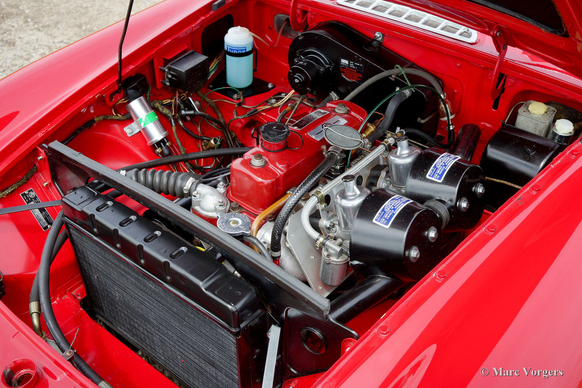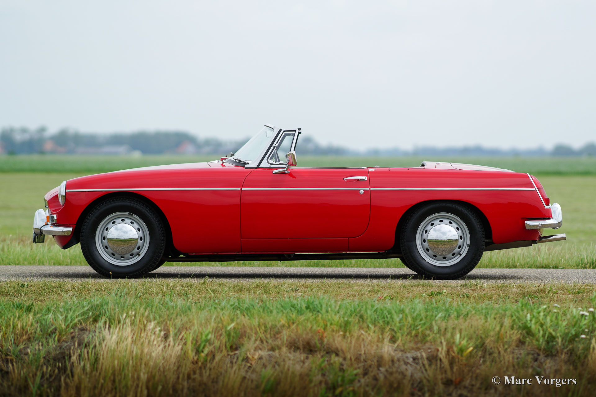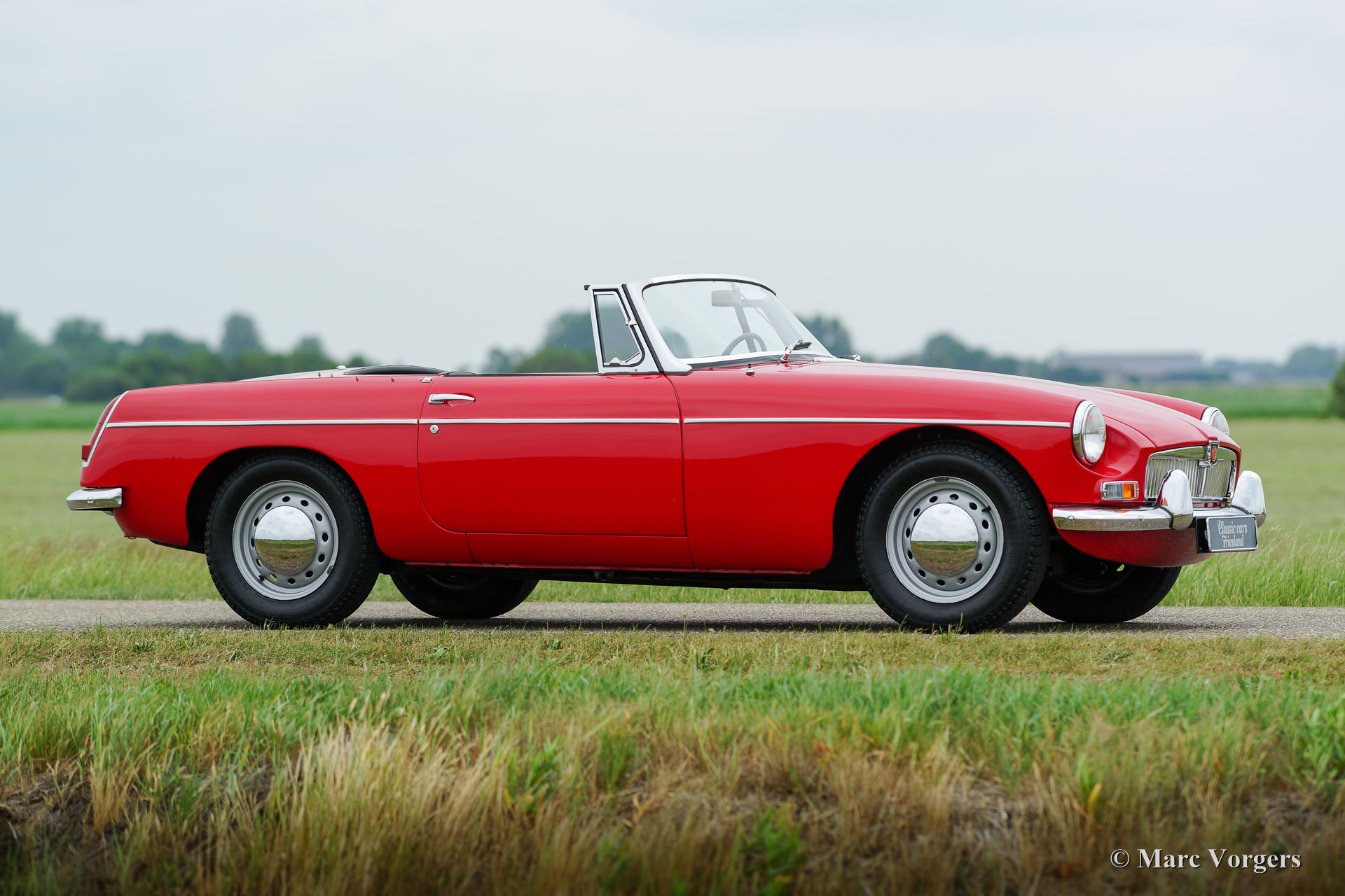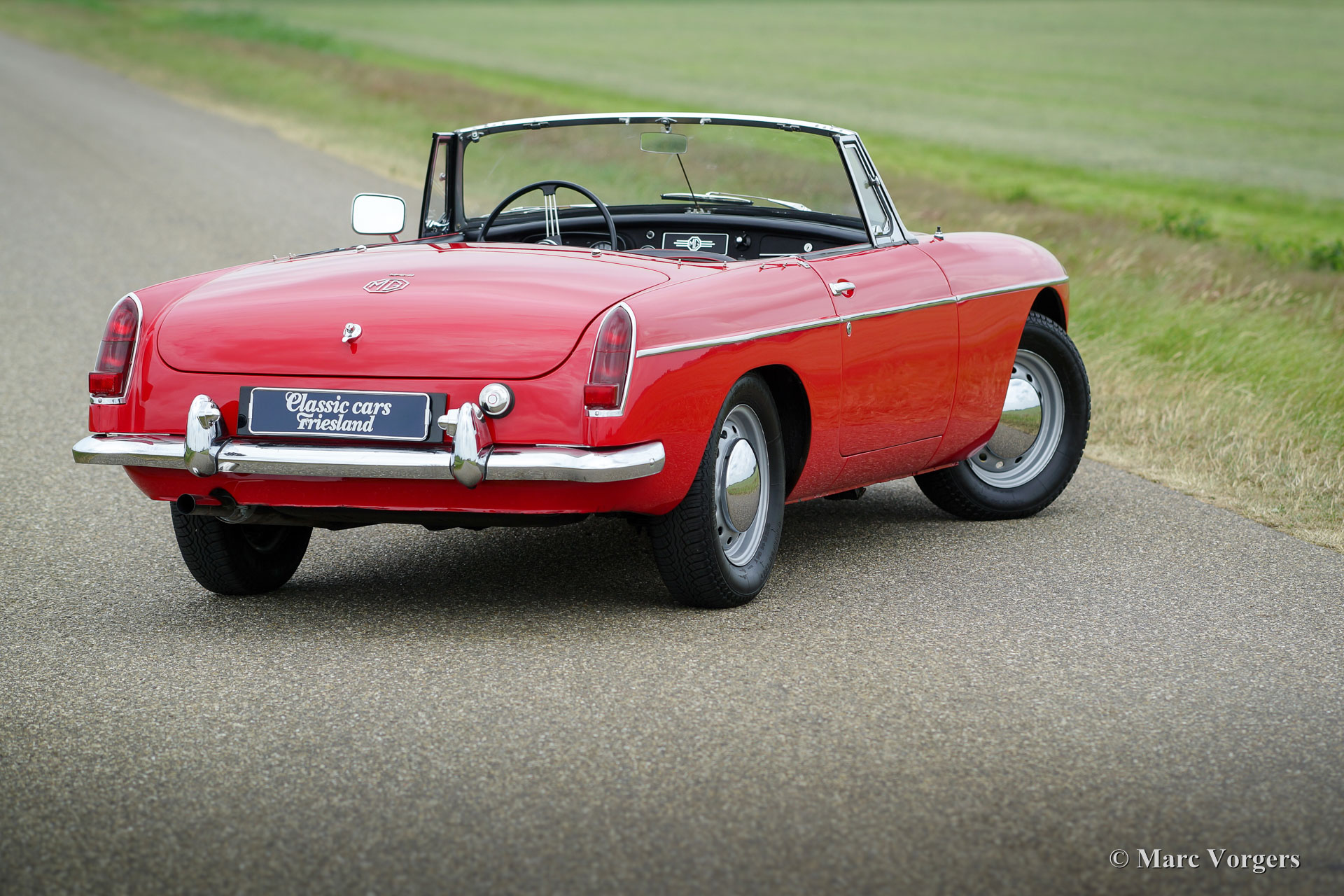 MG MGB roadster, year 1964. This is an early Mk I model with the special ‘pull-handles’ on the doors. Body colour red with a black leather interior trimmed with red piping. Black carpet, black soft top and hood cover. This wonderful MGB roadster was extensively ‘nut & bolt’ restored in the past, an extensive photo reportage of the restoration is present. This fine MGB roadster is in superb top-condition; concourse! The automobile shows all the original details like the steel disc-wheels with chrome hub-caps, the gorgeous original steering-wheel, the original shifter knob, the original air-filters and the original tools. In case you wish the car can be converted to wire wheels. This MGB roadster shows a crisp panel fit. The car is fitted with a four-speed gearbox with overdrive. This is a superbly driving, super original ‘pull-handle’ MGB in TOP-condition!