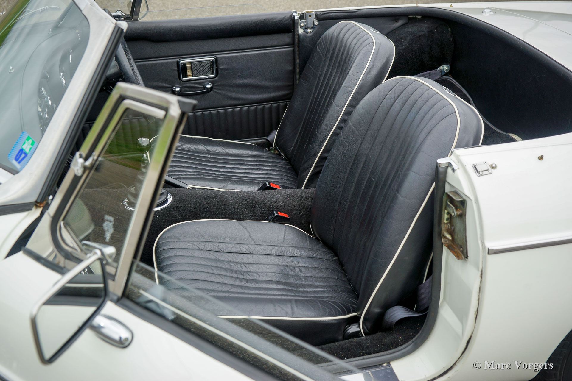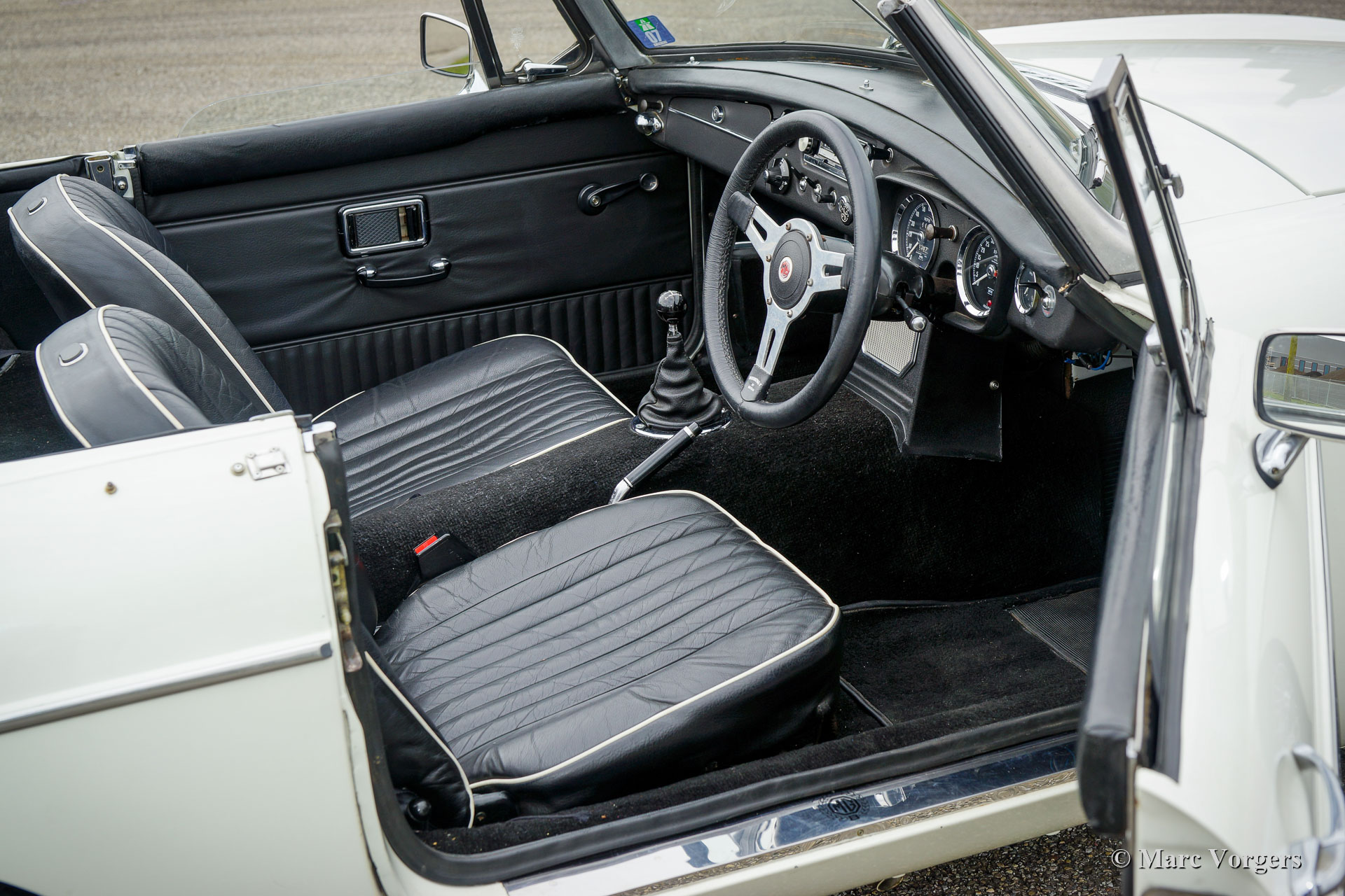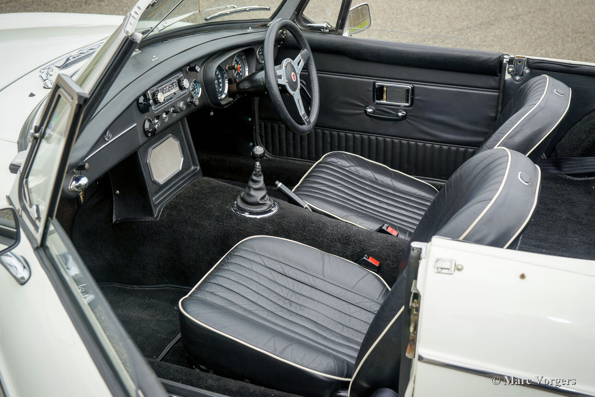 MG MGB roadster, year 1970. Colour white combined with a black leather interior, trimmed with white piping and black carpet. Black ‘pack away’ soft-top. This right-hand drive (RHD) MGB roadster was extensively restored in the United Kingdom in the past. The restoration was based on a brand-new British Motor Heritage body shell. Looking at this MGB for the first time you are under the impression to be looking at a perfectly preserved original car, that is a good thing meaning that the car shows all the original details, slight traces of previous use, and a wonderful patina. The car is in exceptionally good all-over condition and the car drives and handles perfectly! The MGB features the desirable early metal dashboard, OVERDRIVE, additional oil-cooler, an aluminium rocker cover, chrome wire wheels, a sports steering wheel with leather rim and a period correct Radiomobile radio without FM. For an additional charge of 2500 we can convert this right-hand drive MGB to left-hand drive. This beautiful MGB roadster is ready to be enjoyed!