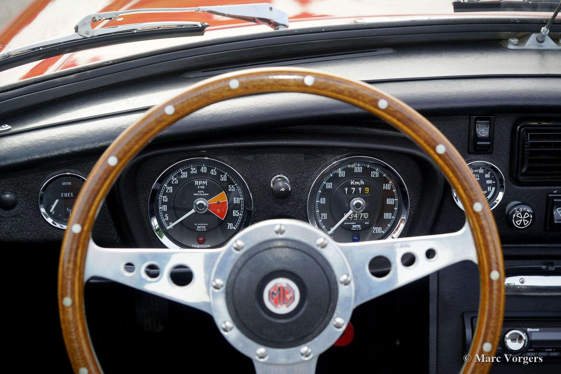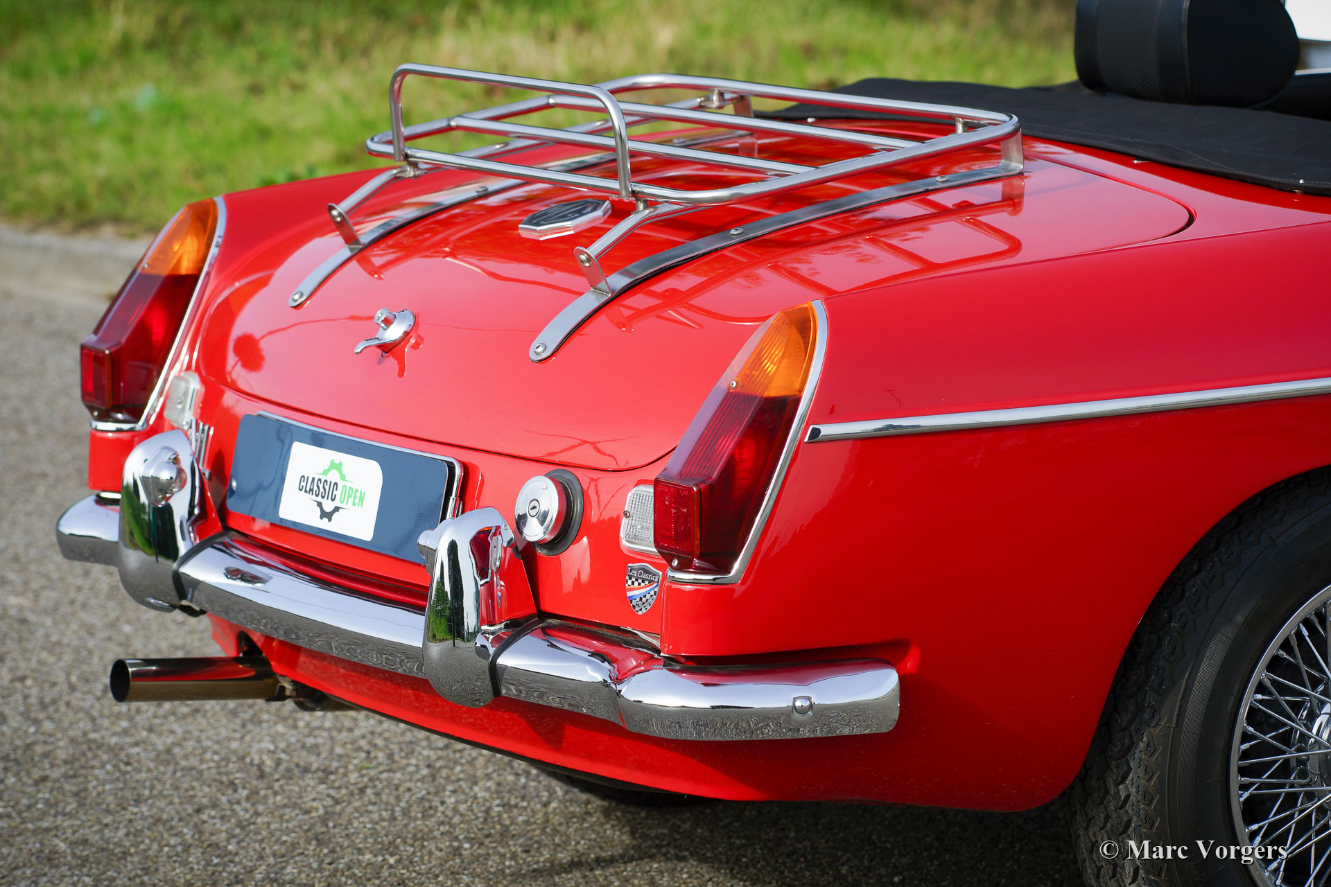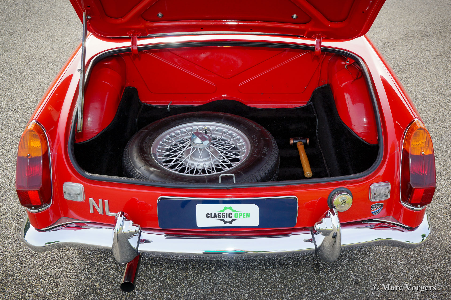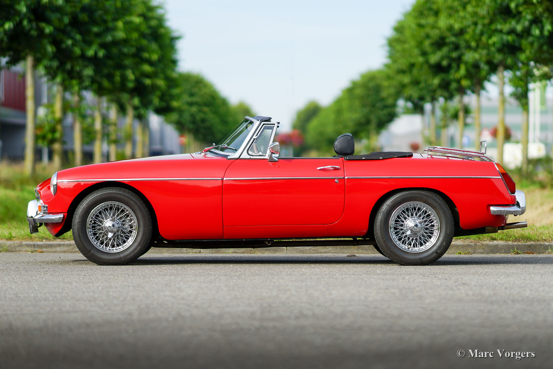 MG MGB roadster, year 1972. Colour red combined with a black leathercloth interior and black carpet. Black vinyl soft-top and a black mohair hood cover. This beautiful MG MGB roadster was sold new in the Netherlands. This is an original European MGB fitted with the desirable steel dashboard and an odometer reading in km/h. This stunning MGB roadster was restored in the past, and the car is in an excellent condition inside and out. The MGB drives perfectly, and the 1800 cc four-cylinder engine has a beautiful exhaust note. The original 4-speed gearbox was exchanged for a 5-speed unit giving lower engine revolutions at motorway cruising speeds, less engine noise, and a lower petrol consumption. Furthermore, the car features chrome wire wheels, a MotoLita steering wheel with a wood rim and a chrome baggage rack. The car comes complete with a British Motor Heritage certificate and a driver’s handbook. This MGB is a splendid example, the car is ready for any adventure, holiday, or road trip, in the hands of a new owner!