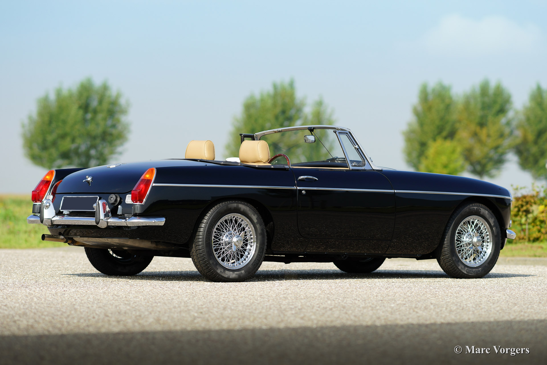 MG MGB roadster, year 1973. Colour black with a (tan) beige leather interior. Black soft top, hood cover and tonneau cover. This MGB was sold new to the Netherlands. The automobile features overdrive, chrome wire wheels, additional driving lamps at the front, AC dynamo, Stainless Steel exhaust and a beautiful sports steering wheel.