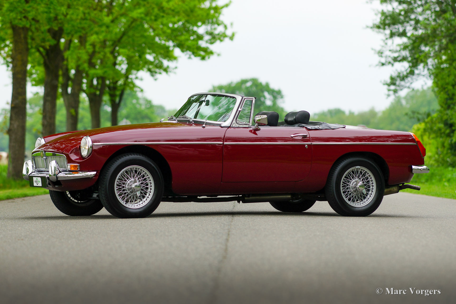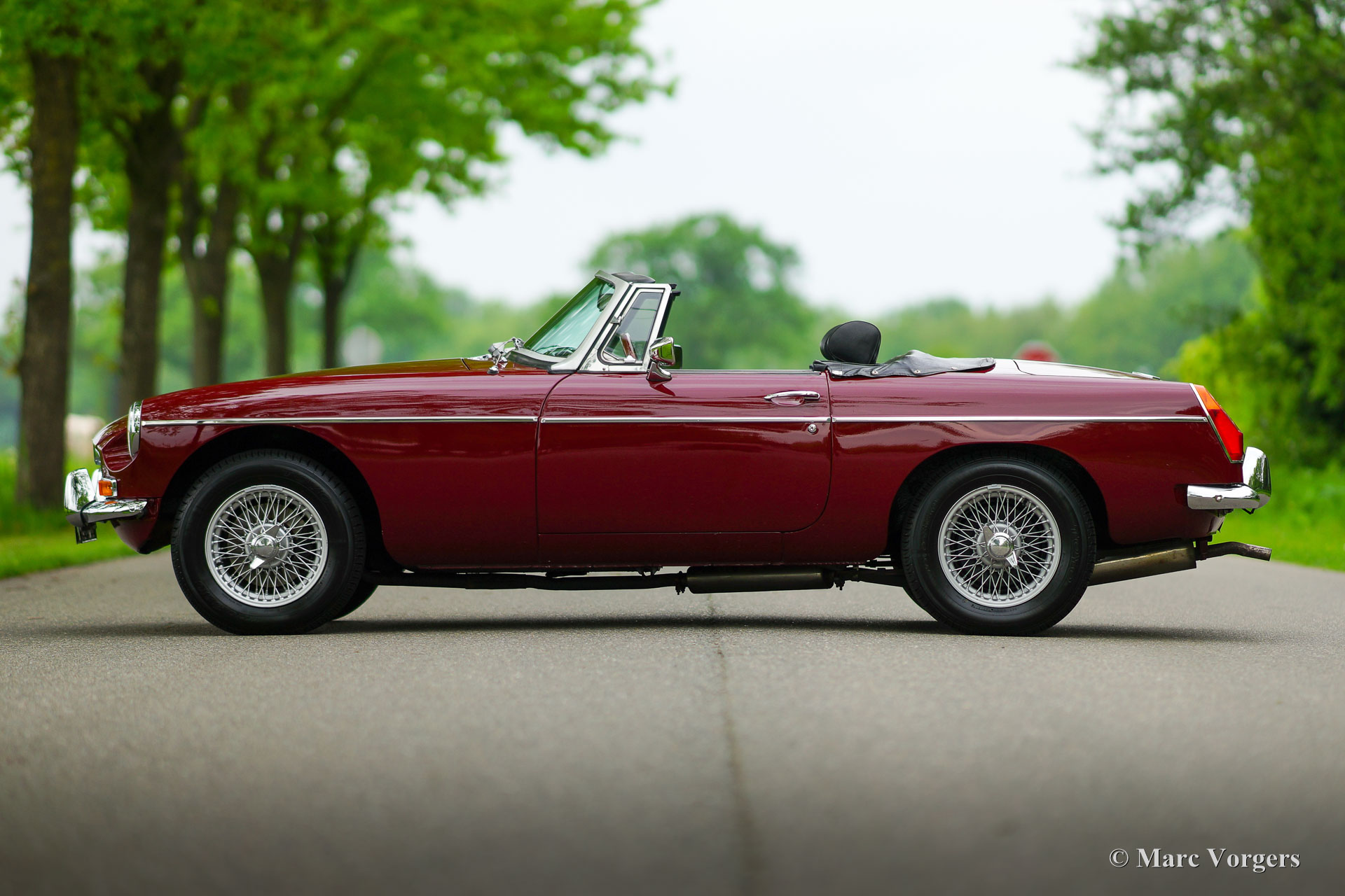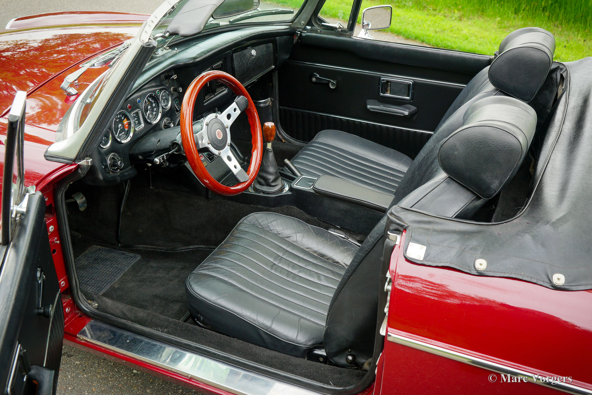 MG MGB roadster, year 1976. Colour Burgundy red combined with a black interior. Black leather seats and black carpet. Black vinyl soft-top, tonneau-cover, and hood-cover. This beautiful MGB roadster was extensively restored in the past. Earlier, in 1988 the 1800 cc. engine was overhauled and reconditioned by Oselli in the UK to ‘fast road’ specifications. This MGB was originally delivered with rubber bumpers. During the restoration these were exchanged by earlier chrome examples. This fine MGB is in an excellent condition, the bodywork shows a crisp panel fit, the paintwork is beautiful, and the interior is fresh and clean. Under the bonnet everything is beautifully detailed, and the boot is fully upholstered. This late MGB model features all the improvements which make the MGB a very desirable, comfortable, and practical open sports car. This fine example is fitted with a period correct Harvard LMKUU radio with AM and FM reception, a sports steering wheel with wood rim, a wood shifter knob, silver painted wire wheels, two chrome door mounted rear-view mirrors, an oil-cooler, aluminium rocker cover and 123 electronic. This MGB roadster drives and feels like a new MGB! This car is ready for any adventure in the hands of a new owner!