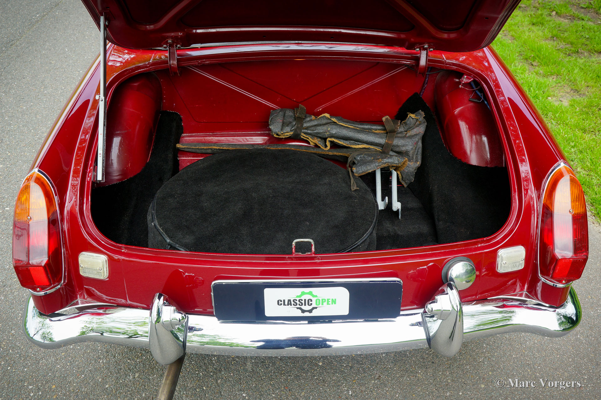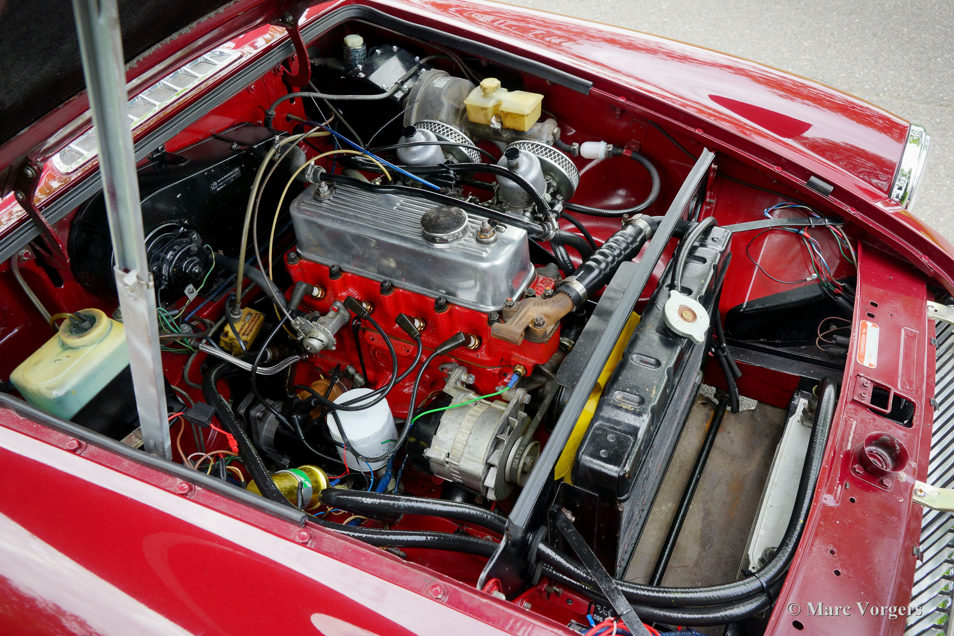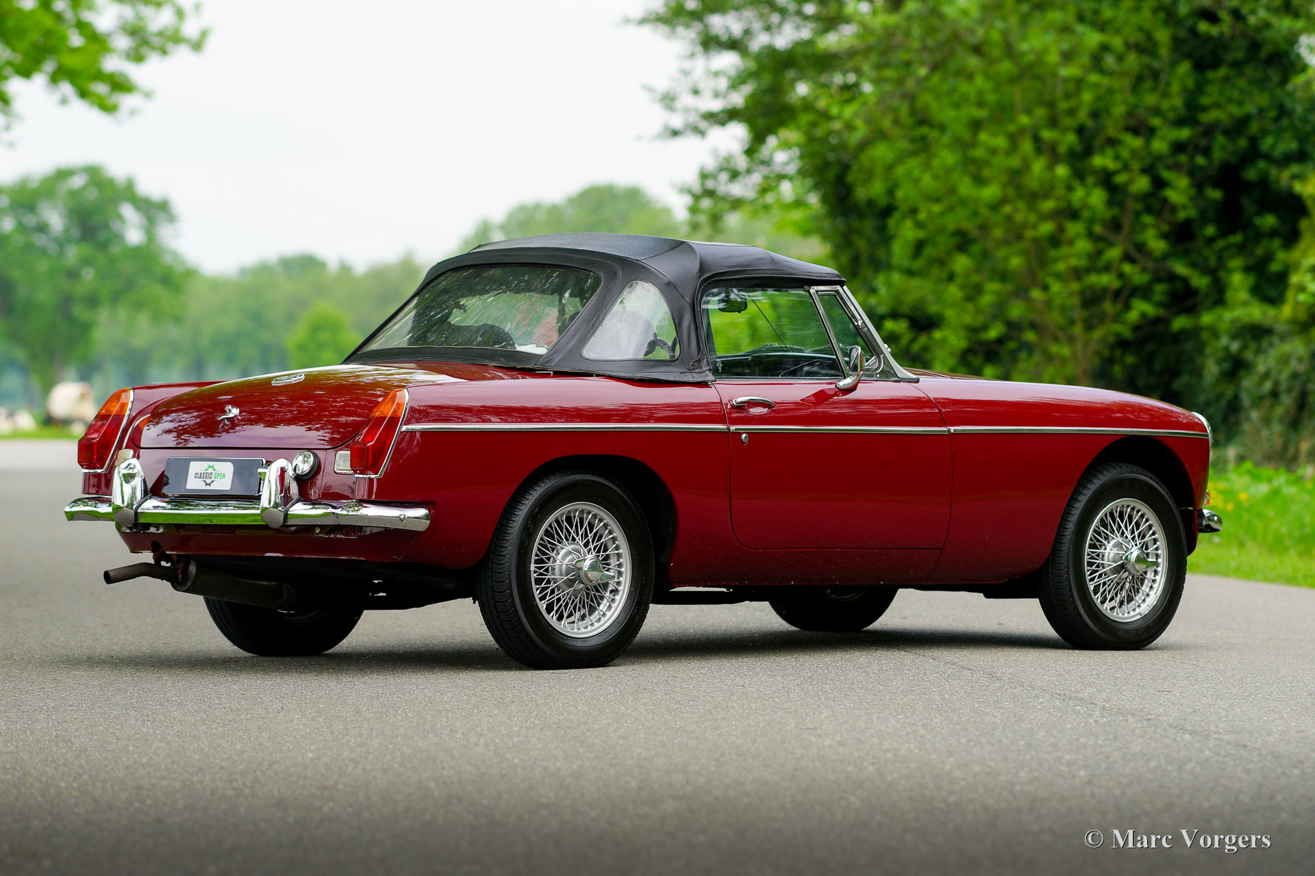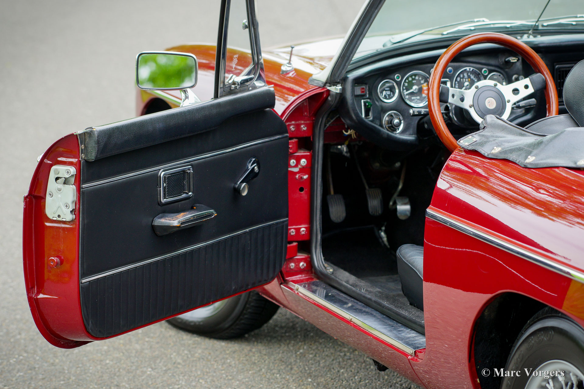 MG MGB roadster, year 1976. Colour Burgundy red combined with a black interior. Black leather seats and black carpet. Black vinyl soft-top, tonneau-cover, and hood-cover. This beautiful MGB roadster was extensively restored in the past. Earlier, in 1988 the 1800 cc. engine was overhauled and reconditioned by Oselli in the UK to ‘fast road’ specifications. This MGB was originally delivered with rubber bumpers. During the restoration these were exchanged by earlier chrome examples. This fine MGB is in an excellent condition, the bodywork shows a crisp panel fit, the paintwork is beautiful, and the interior is fresh and clean. Under the bonnet everything is beautifully detailed, and the boot is fully upholstered. This late MGB model features all the improvements which make the MGB a very desirable, comfortable, and practical open sports car. This fine example is fitted with a period correct Harvard LMKUU radio with AM and FM reception, a sports steering wheel with wood rim, a wood shifter knob, silver painted wire wheels, two chrome door mounted rear-view mirrors, an oil-cooler, aluminium rocker cover and 123 electronic. This MGB roadster drives and feels like a new MGB! This car is ready for any adventure in the hands of a new owner!