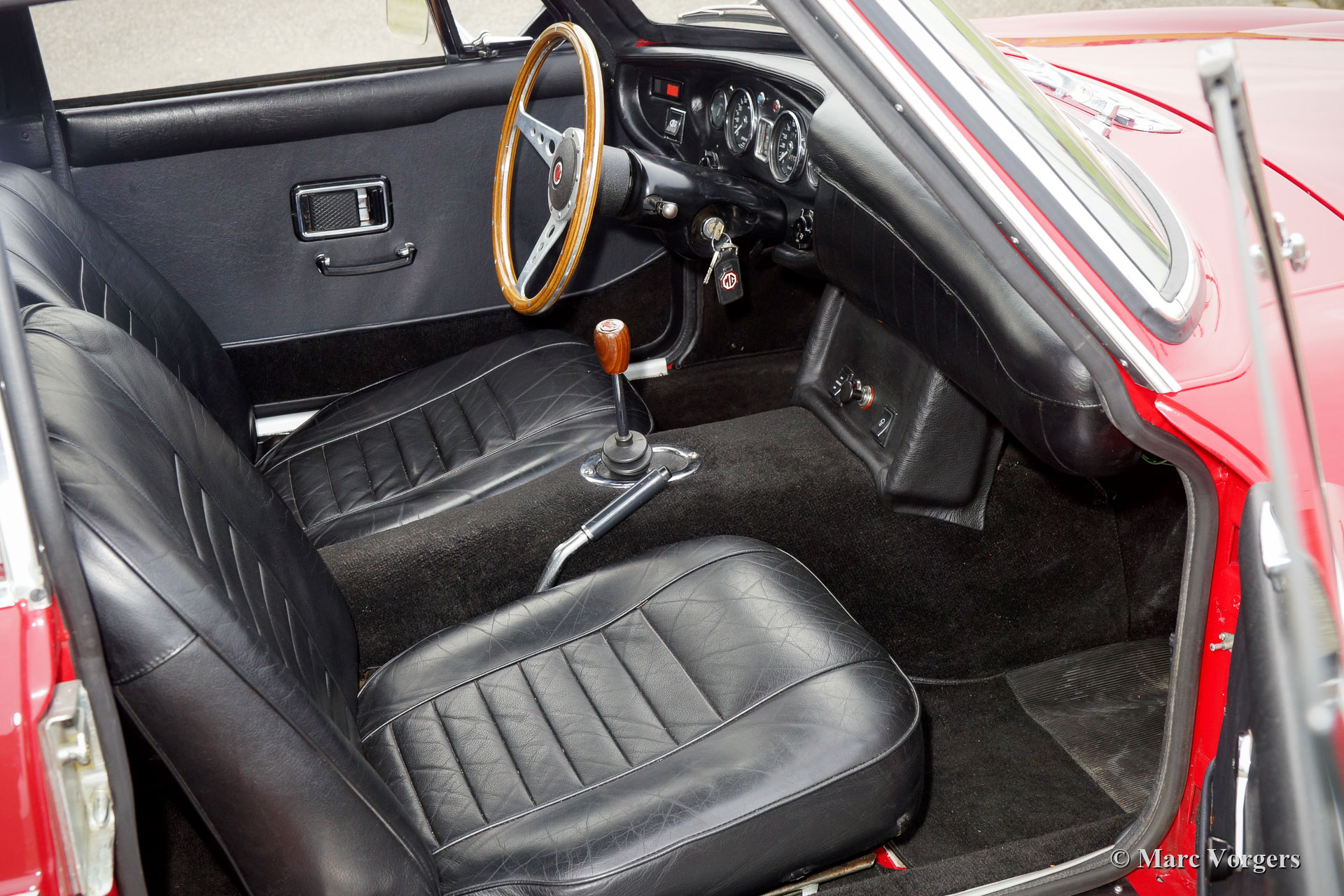 MG MGC GT, year 1969. Colour red combined with a black leather interior and black carpet. This gorgeous MG MGC GT was wonderfully restored in the past. The body shows superb paint and a crisp panel-fit. The interior is beautiful, and the dashboard was upholstered with new leather (cloth) during the restoration. This MGC GT is in excellent condition with only slight signs of use. The engine was overhauled a few years ago, this 3000 cc six-cylinder in-line unit sounds beautifully, and it runs and pulls phenomenally! This fine MG MGC GT features overdrive, a MotoLita sports steering wheel with wood rim, beautiful dark grey metallic Minilite style alloy wheels, two door-mounted rear-view mirrors and a petrol cap with lock. A fantastic MGC GT!