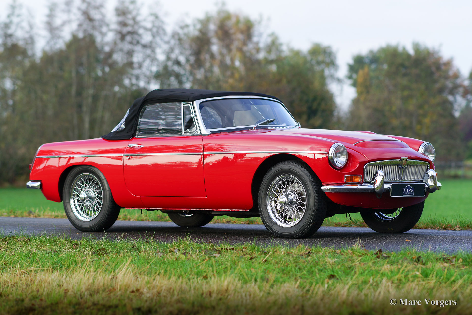 MG MGC roadster, year 1968. Colour red with a black leather interior trimmed with red piping. Black carpet and a black soft-top. This is a rather rare MG MGC roadster fitted with the 145 bhp six cylinder in-line engine. This specific MGC is even rarer and very special because it is one of only 374 cars which were factory fitted with an automatic gearbox! A surprising combination which works very well; this MGC drives perfectly! This beautiful MGC was extensively restored in the past, a photo reportage of the restoration is present. This MG MGC is in excellent to superb condition!