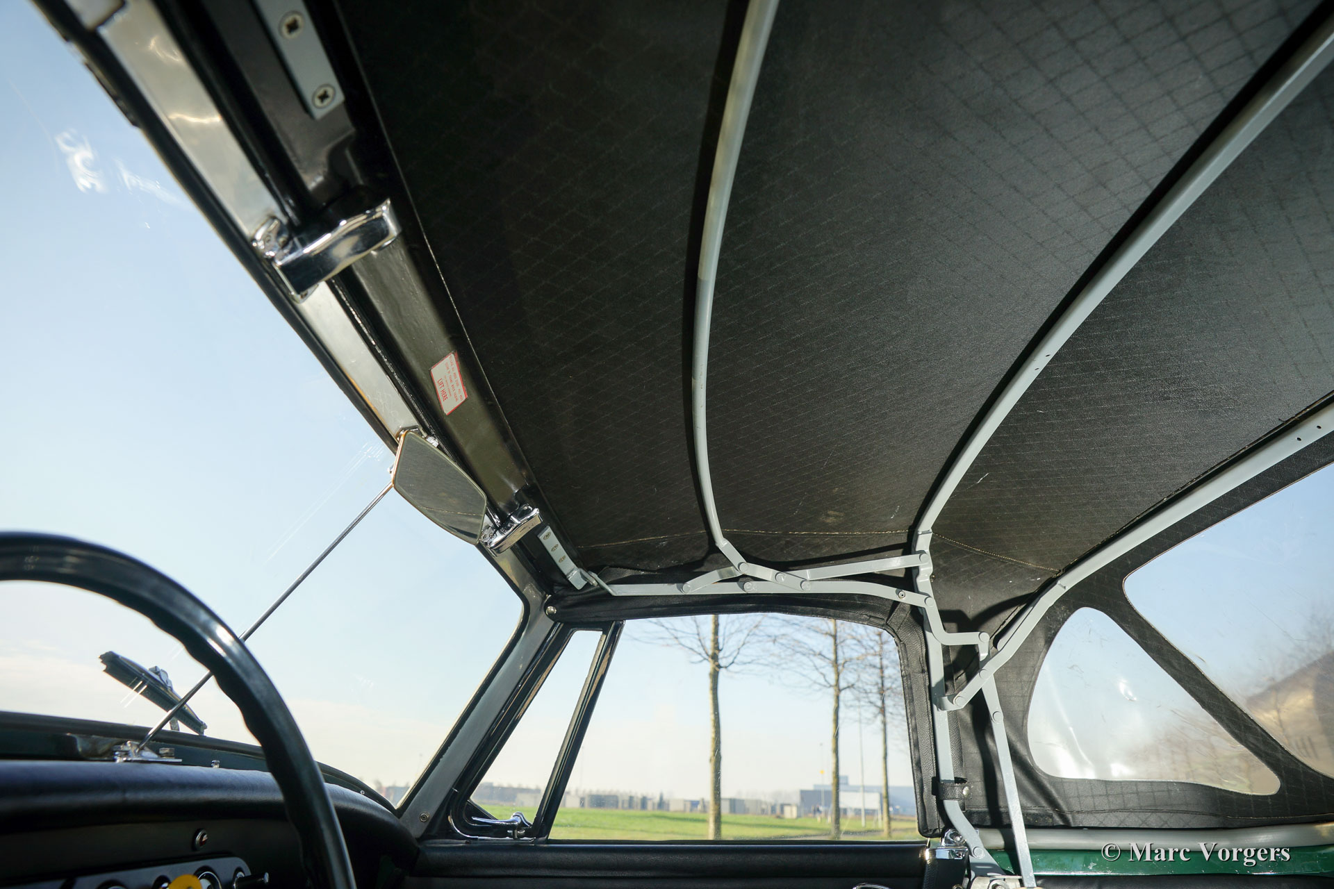 MG Midget 1275 Mk III, year 1968. Colour dark British Racing Green with black leather upholstery trimmed with white piping. Black vinyl soft-top and a black vinyl tonneau cover. This MG Midget was sold new in The Netherlands, it is a European model with the black painted steel dashboard and the odometer reading in kilometres. This little car is in excellent condition and the car drives perfectly. This Midget features the rare original hub caps which were optional accessories in the 1960ies.