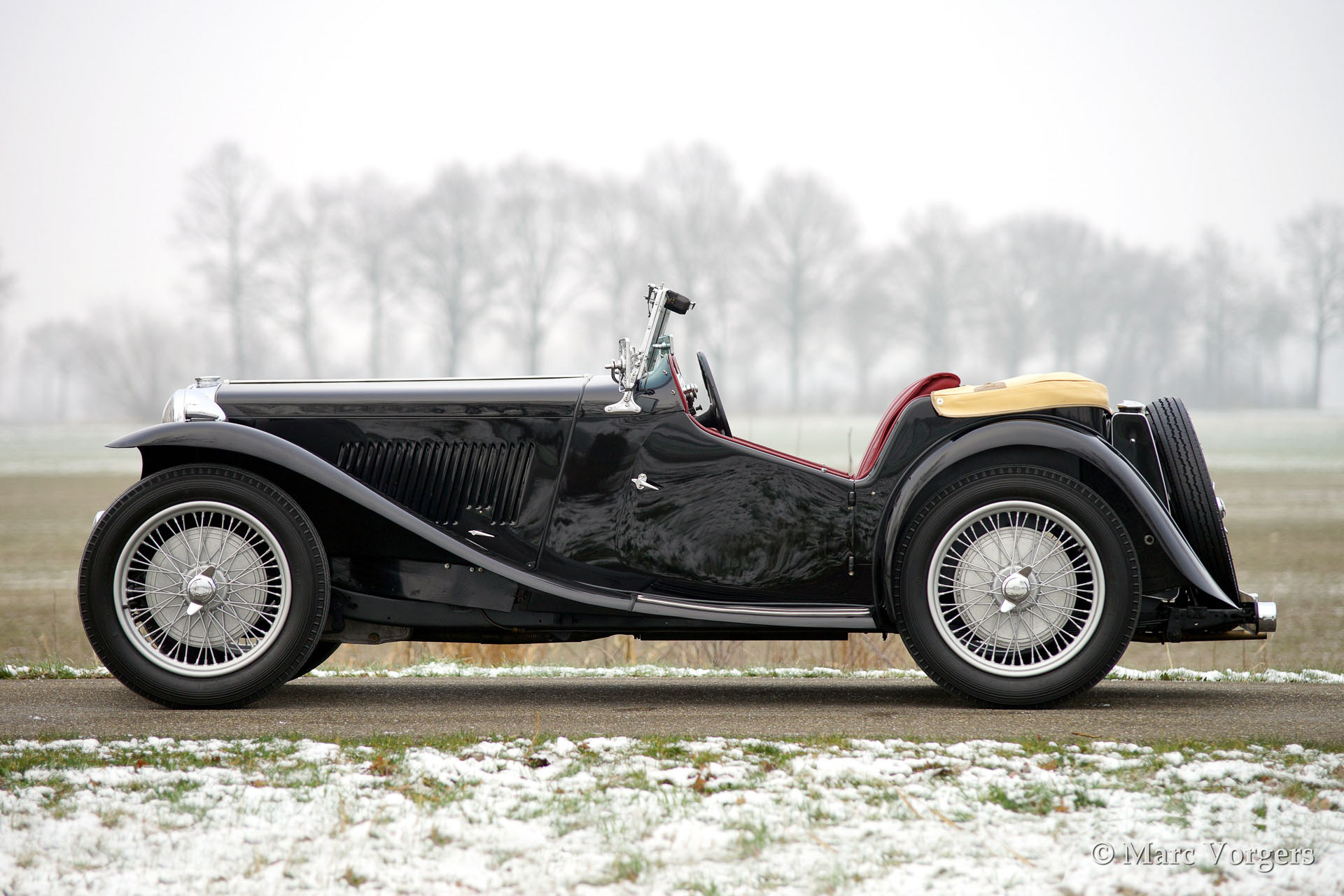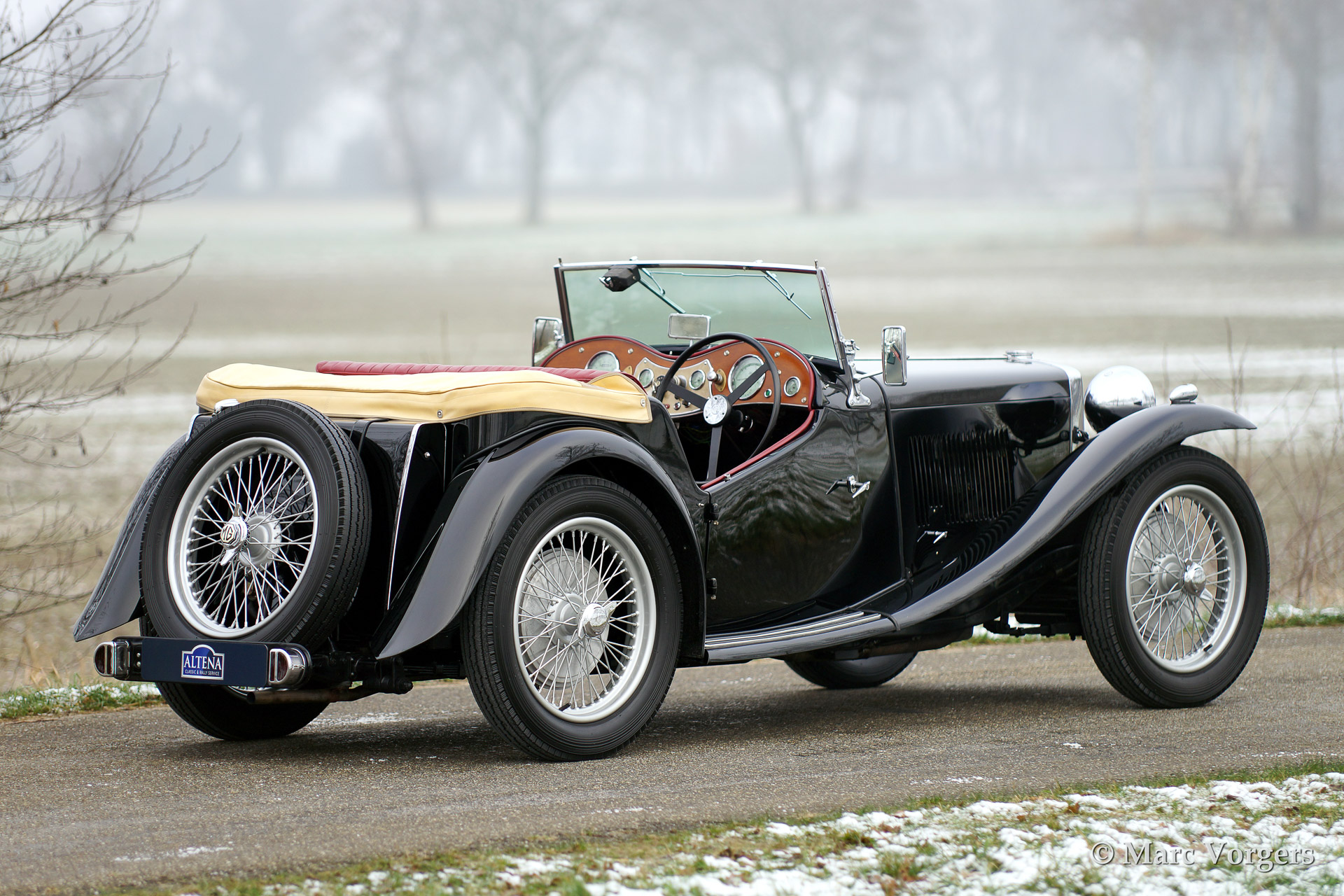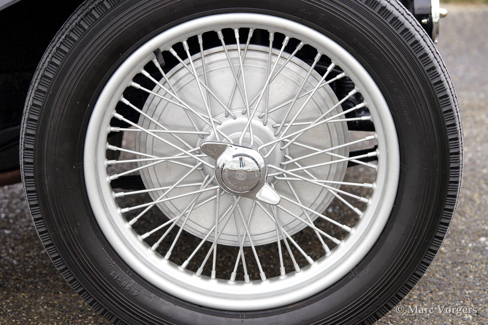 The MG TC was the first new post-war MG. The TC was introduced in 1945, and based on the pre-war TB, it was very similar. A major improvement to the TC was the larger interior, which was increased by 10 cm. The design was similar to the pre-war TB, with swept separate wings, large 19-inch wire wheels and a folding windshield. The MG TB/TC series were much admired by the American soldiers who were on the point of returning to America; this type of small sports car with its smooth handling, was not yet known in America. As a result, many TBs and TCs were shipped to America, and also the MG TC was in great demand at the other side of the pond. All TCs had right-hand steering, leaf springs all around and a 54 bhp four-cylinder engine. In 1950, the MG TC was succeeded by the MG TD.
