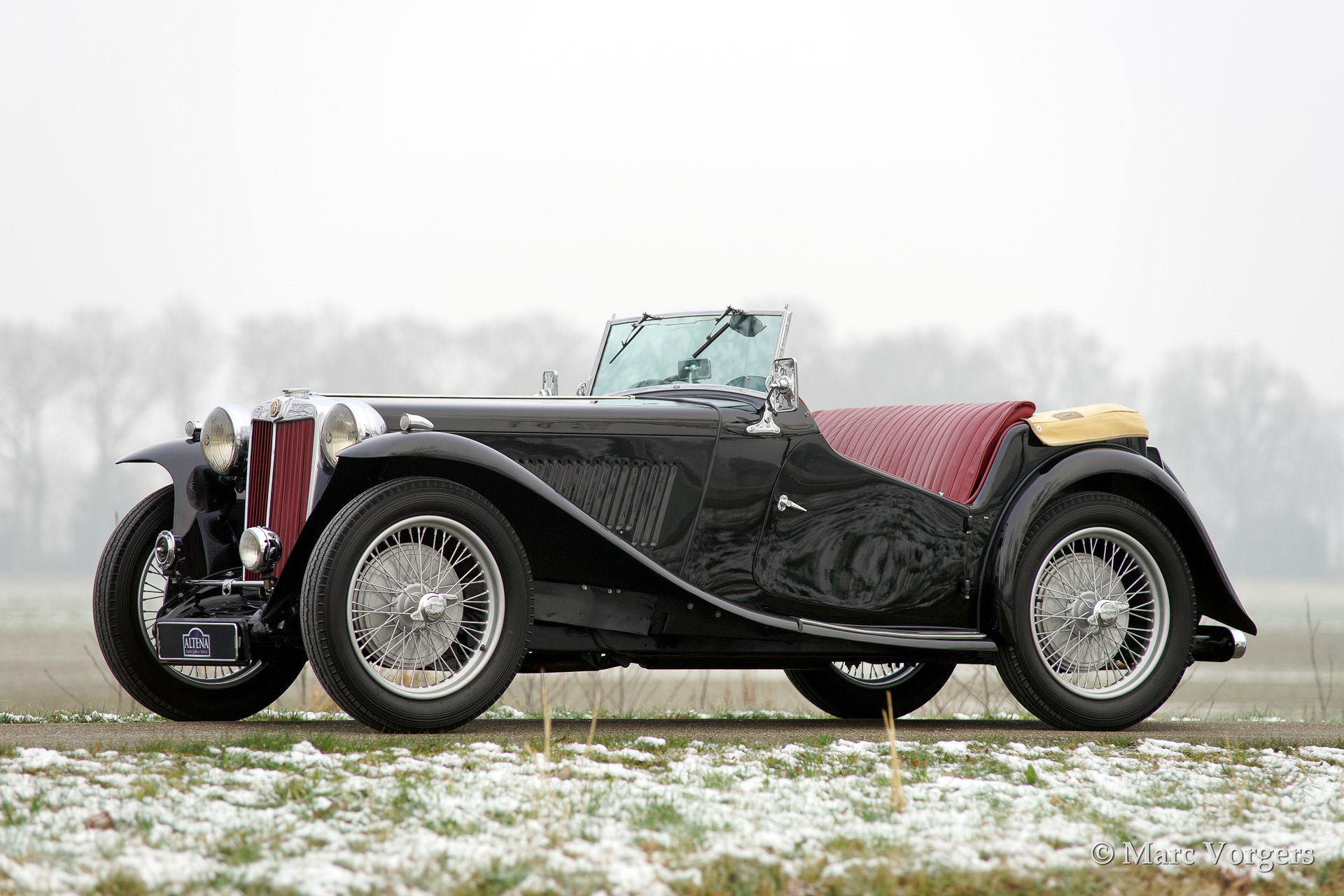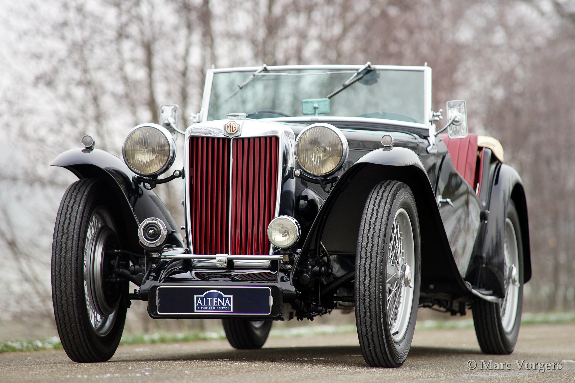 MG TC, year 1947. Colour black with a dark red leather interior. Beige hood and hood cover and tonneau cover. This beautiful MG TC was extensively restored to factory specifications. The automobile features wire wheels with Dunlop tires, original Lucas lamps and mirrors and an aluminium rocker cover.