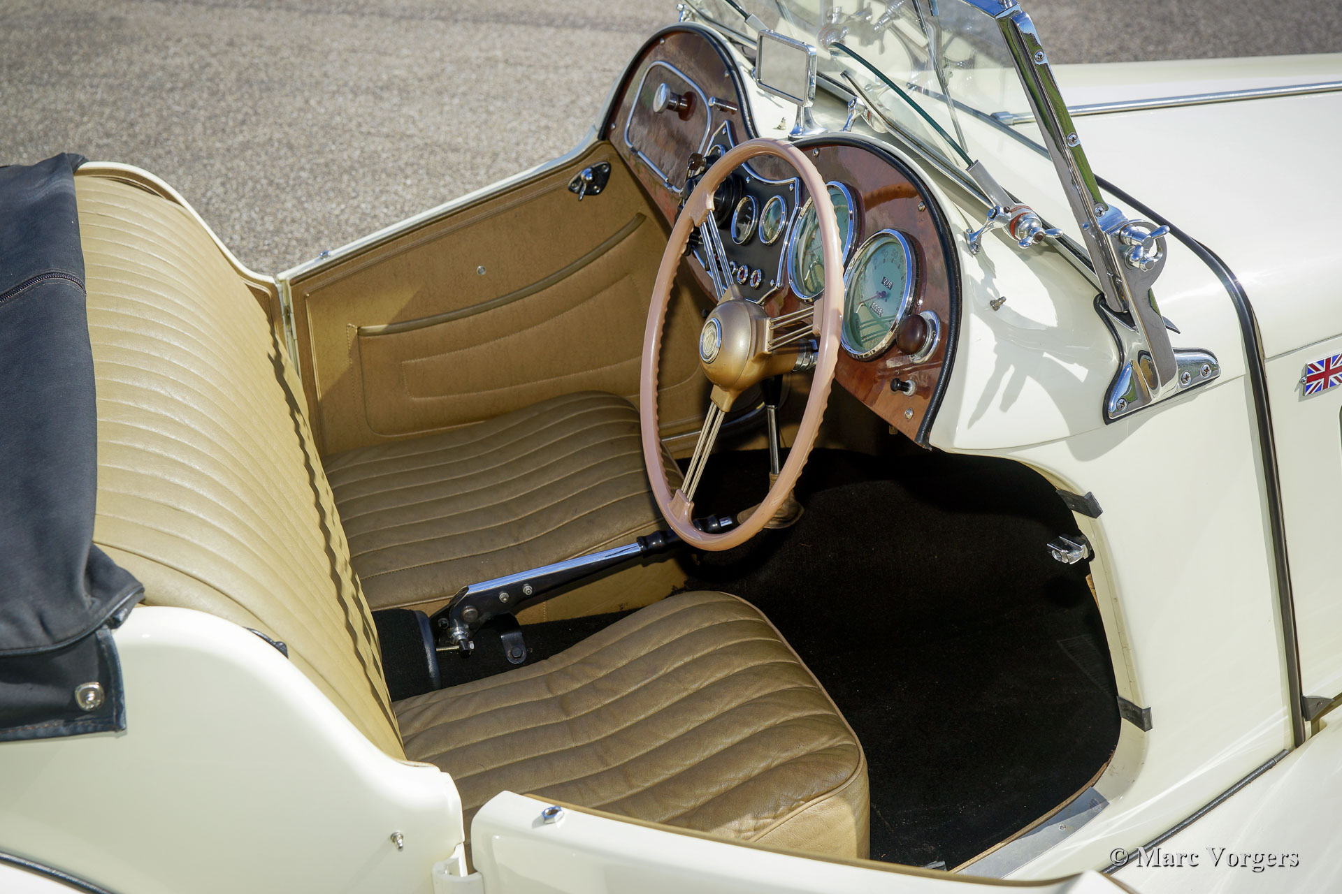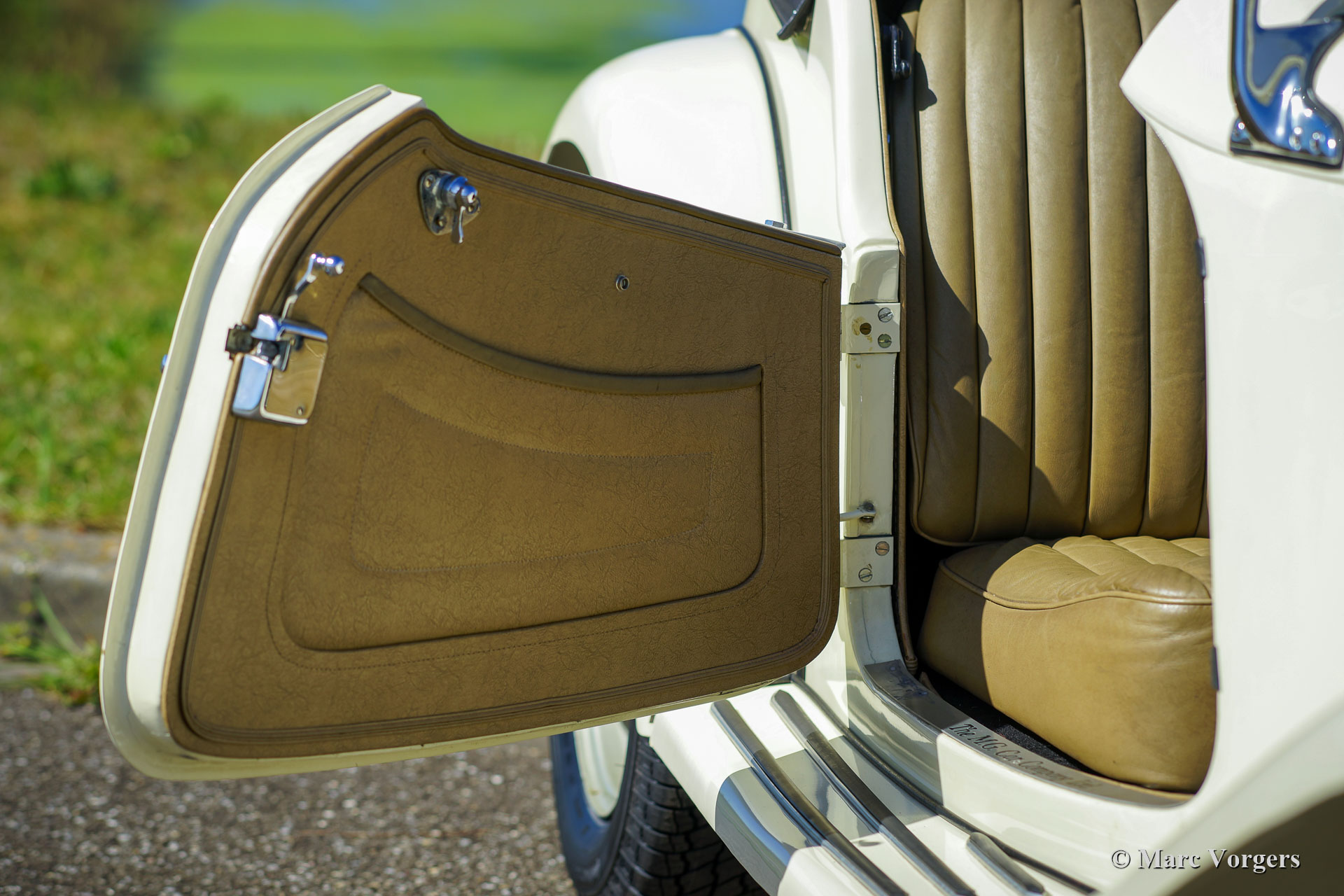 MG TD, year 1950. Colour Old English White combined with a beige (tan) leather interior and black carpet. Black hood, tonneau-cover and side screen frames. This early MG TD can be recognized immediately by the closed disc wheels which were only seen on the earliest examples. This wonderful MG TD was imported to the Netherlands in the year 1954. The last owner has cherished this beauty since 1995! This MG TD is in very good to excellent condition and the car drives perfectly. Recently the car was extensively serviced after a long time of inactivity. New tyres were fitted, the brakes were overhauled / renewed and rubber bushes in the suspension were renewed. Furthermore, a new petrol pump was fitted, and the carburettors were overhauled.