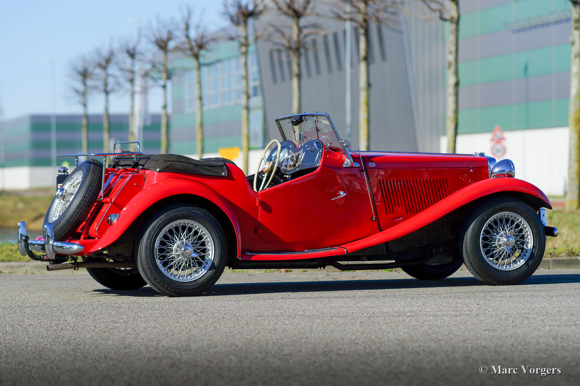 MG TD, year 1953. Colour red combined with a black leather interior and black carpet. Side-screens with black frames, and a black soft-top. This gorgeous MG TD was sold new in the Netherlands and the last owner has cherished the car for 40 years! The car was serviced and maintained beautifully. this MG TD in incredibly good to excellent condition and it drives perfectly. The car was uprated with a modern 5-speed gearbox and the 1250 cc four-cylinder engine was modified to run-on lead-free petrol. The MG features desirable options like classic bucket seats, a badge bar with Lucas SFT 575 wide-beam fog- lamps fitted, wire wheels, a chrome baggage rack, an odometer reading in km/h, a wonderful aluminium rocker cover and an aluminium engine side cover. This is an excellent example that can be enjoyed to the fullest by its new enthusiast owner!
