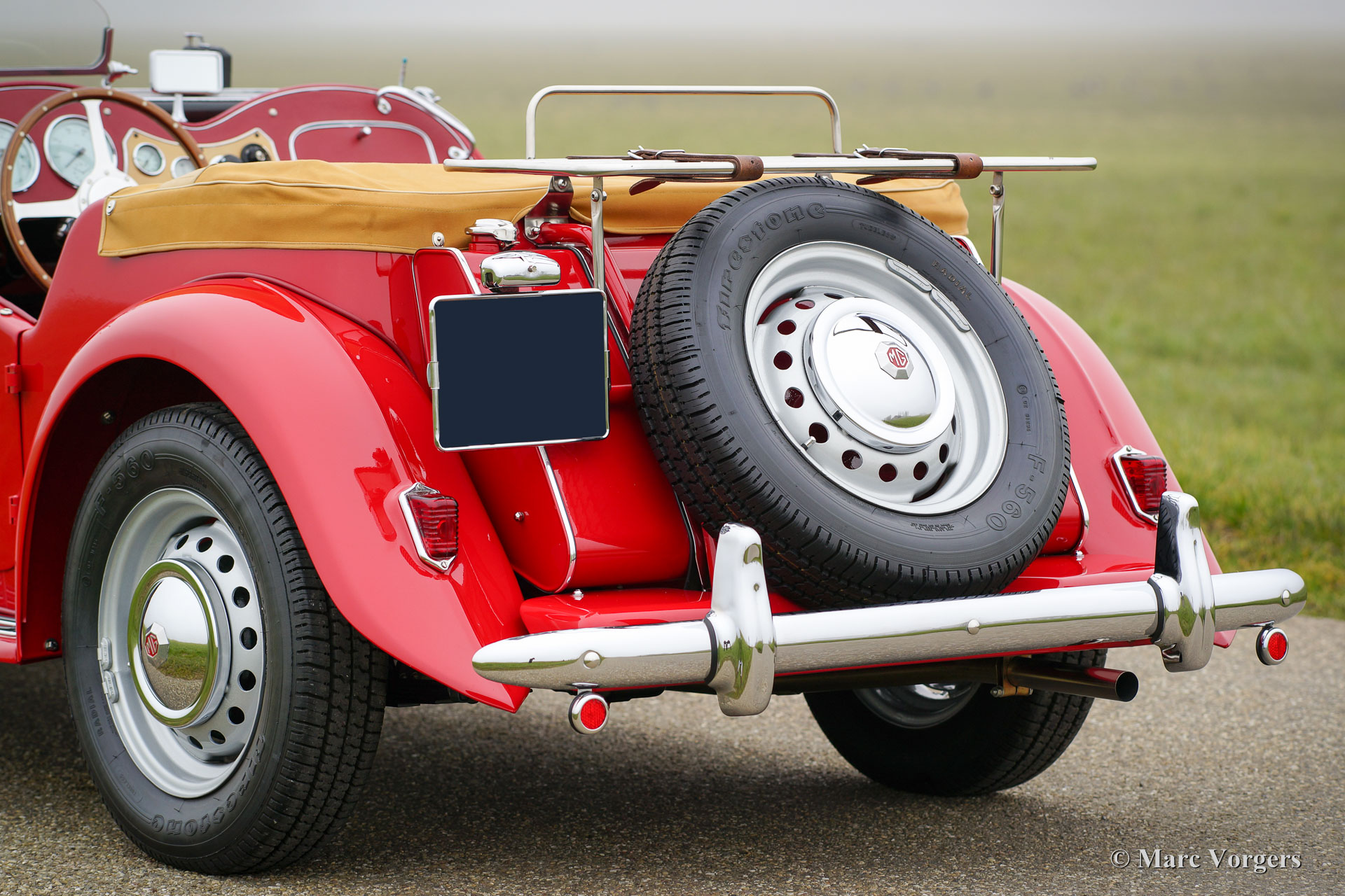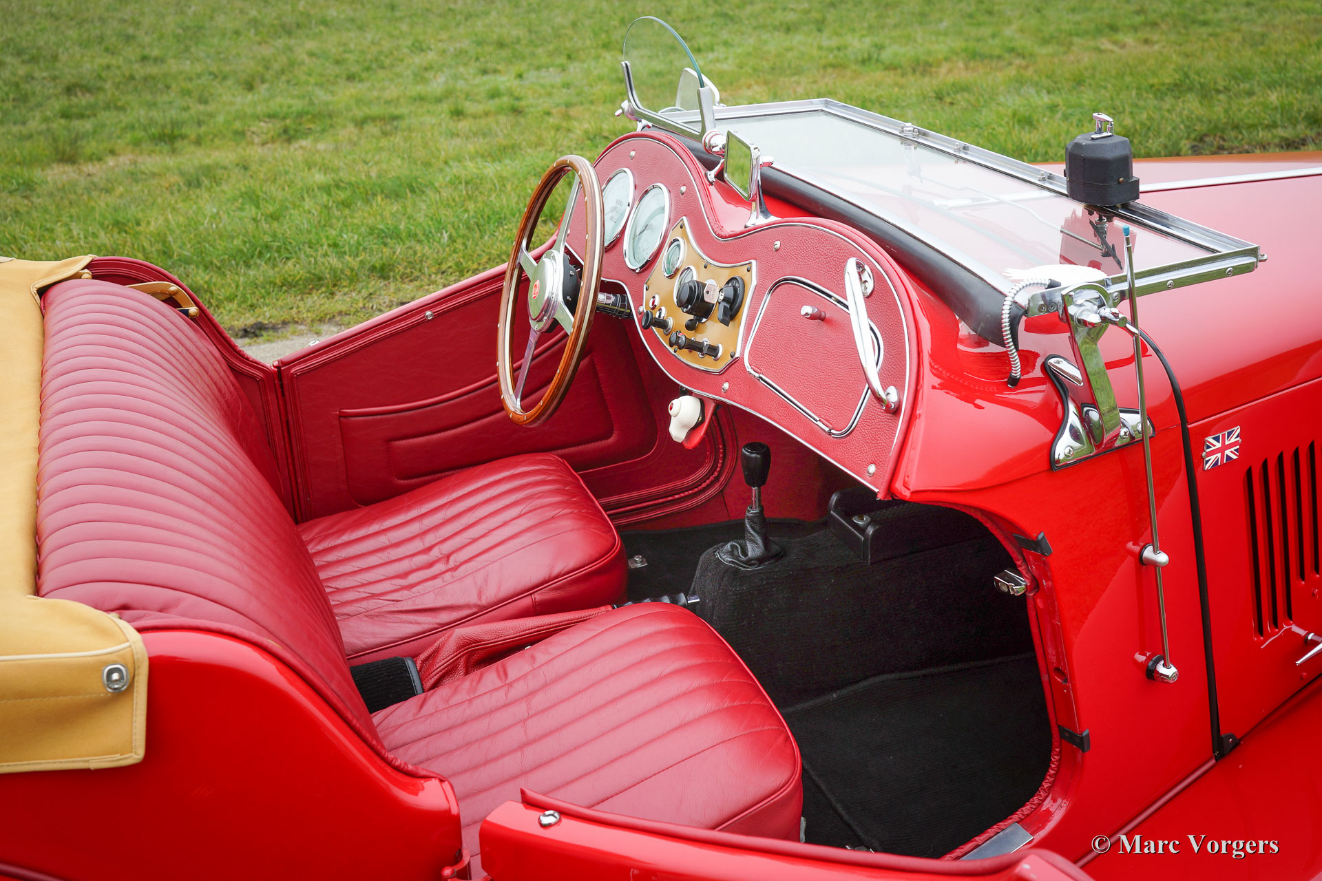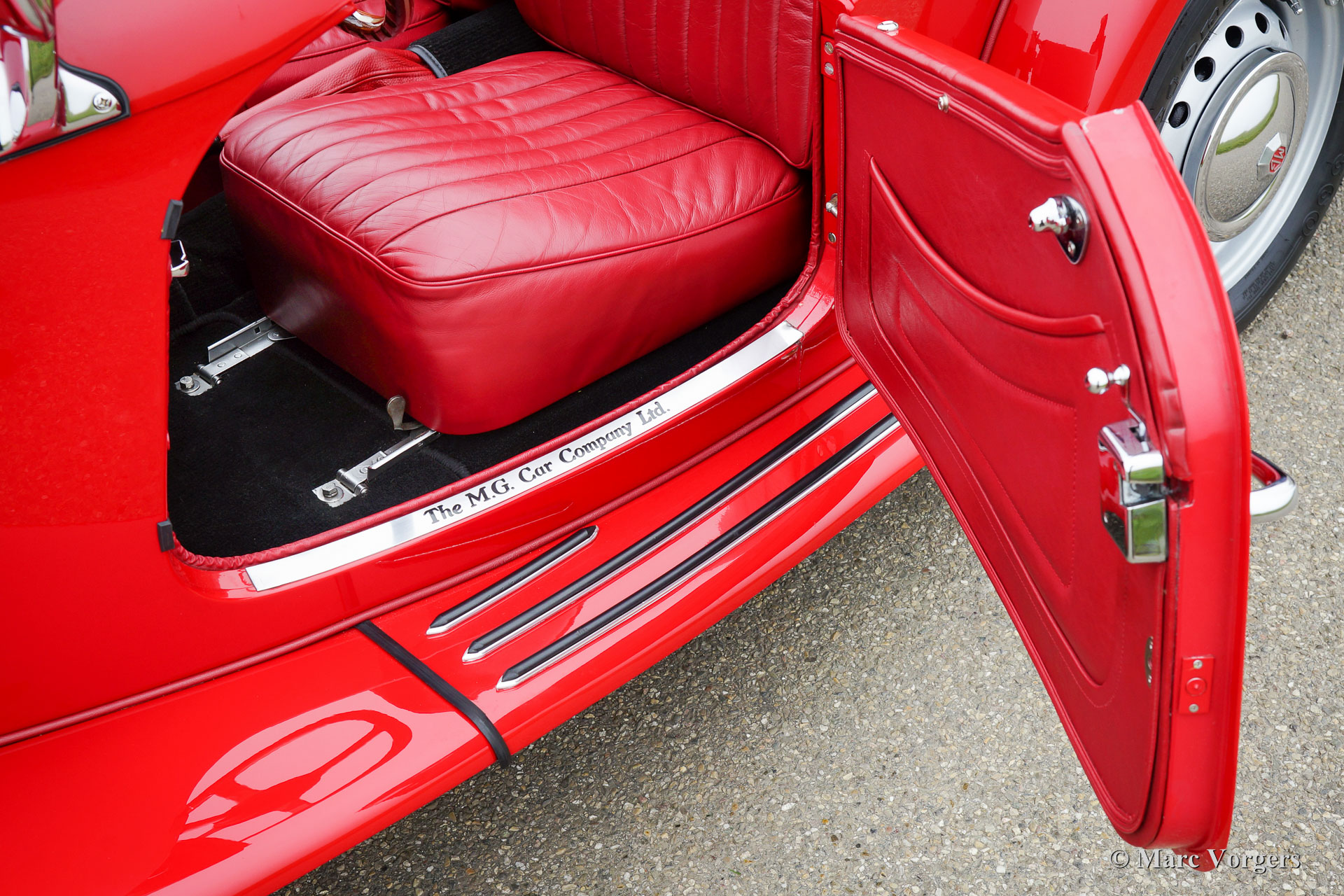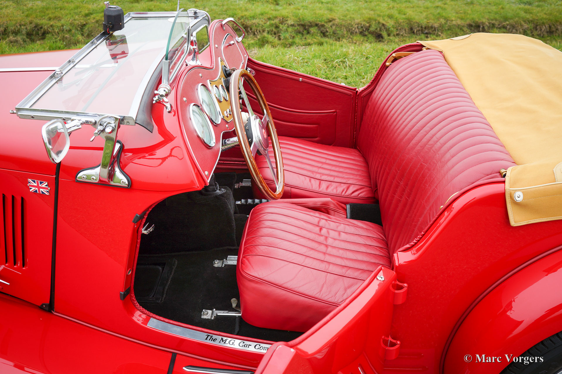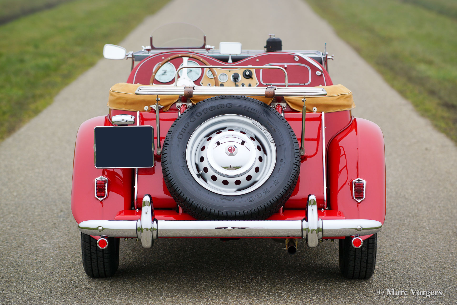 MG TD Midget, year 1952. Colour red with a red full leather interior. Beige canvas soft-top, side-screens and a beige canvas hood cover. This beautiful and ‘matching numbers’ MG TD was fully and body-off restored in the year 2009-2015. Invoices and photos of the restoration are present. The engine and gearbox were overhauled, new chrome, new wiring loom, new brakes, new ash frame, five speed gearbox modification, Stainless Steel exhaust, badge-bar with two original Lucas fog lamps and new tyres. This MG Midget is in PERFECT concourse condition and the car drives superbly!