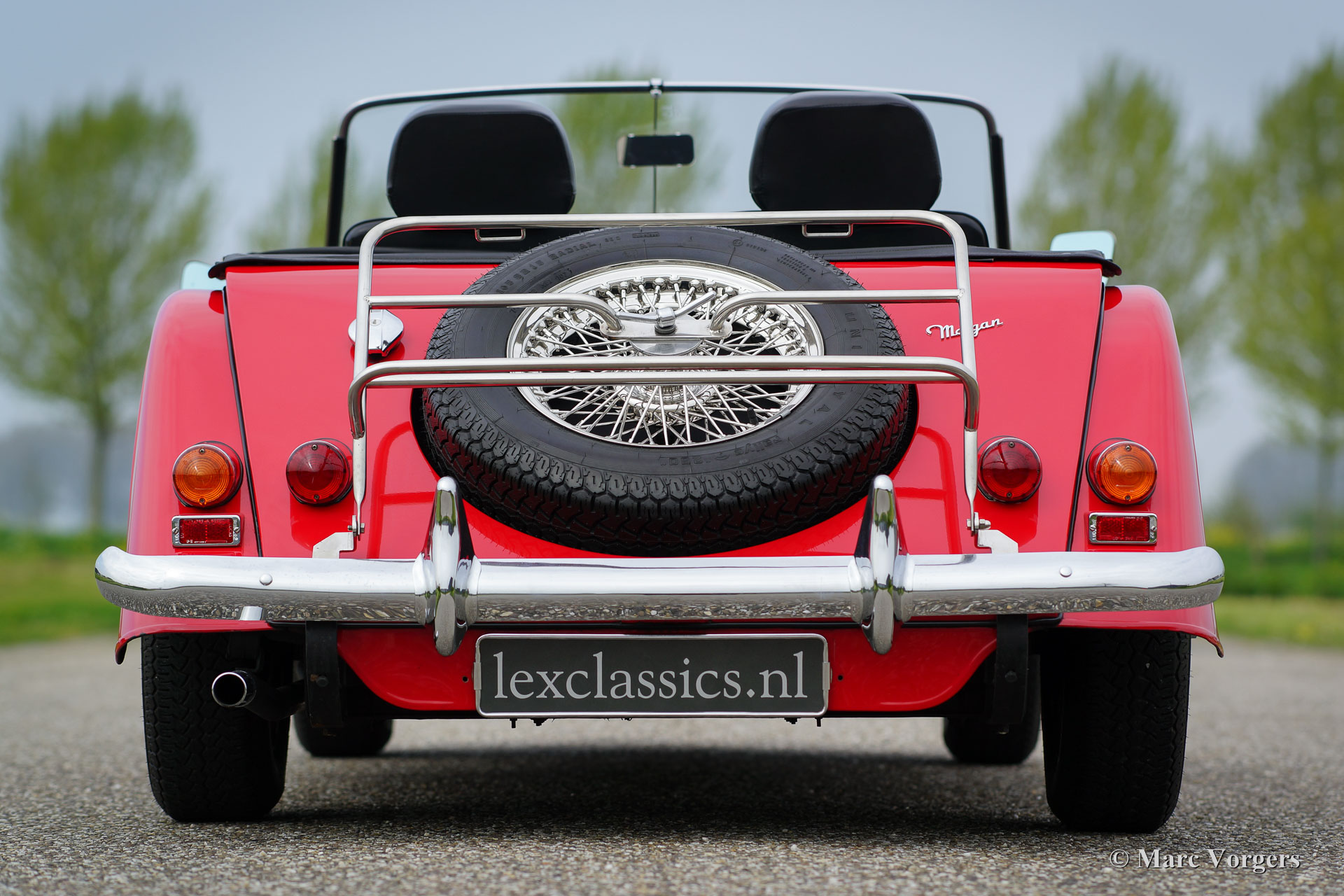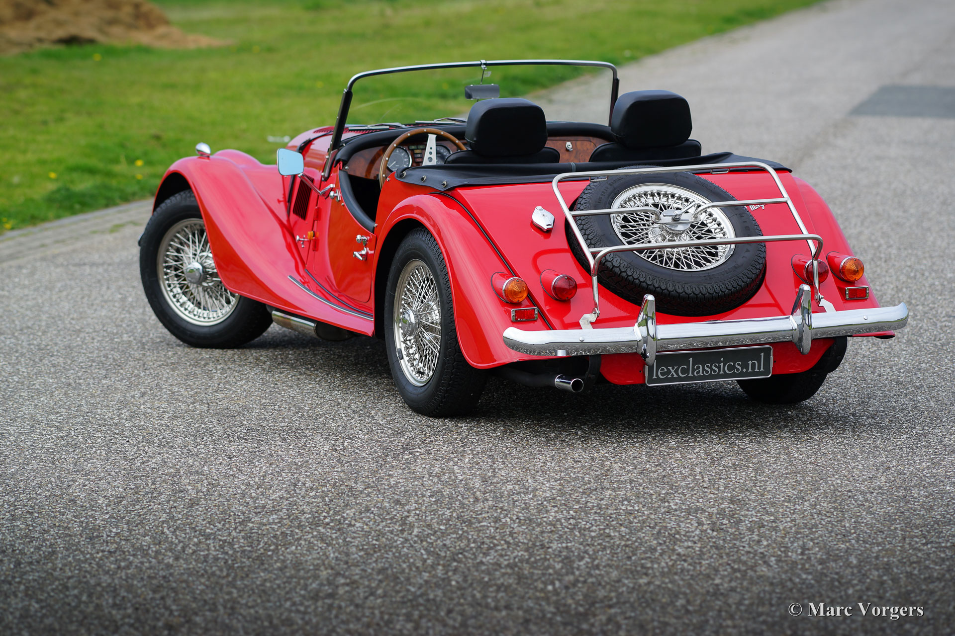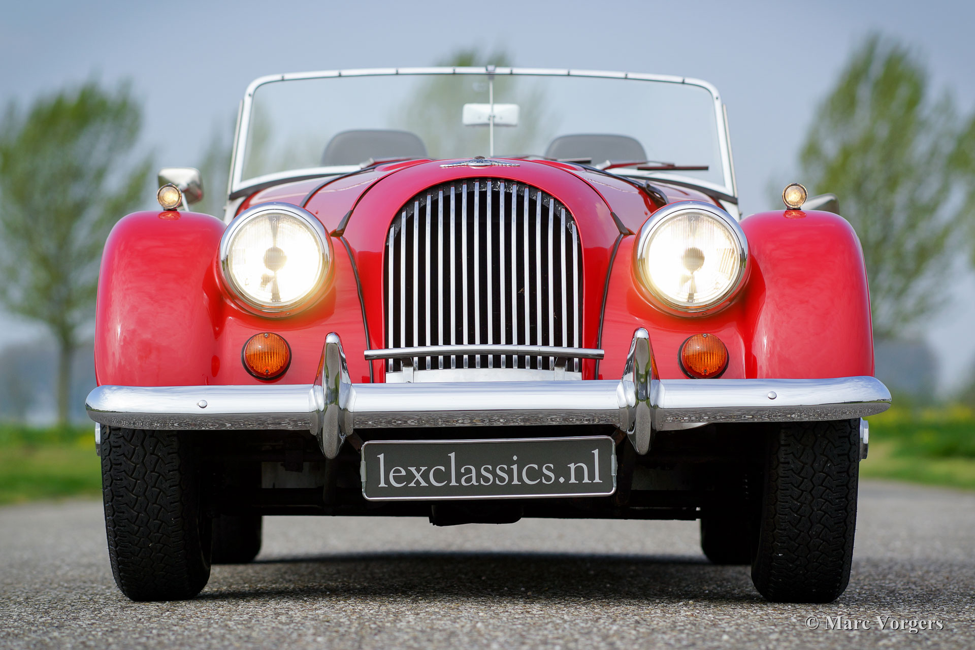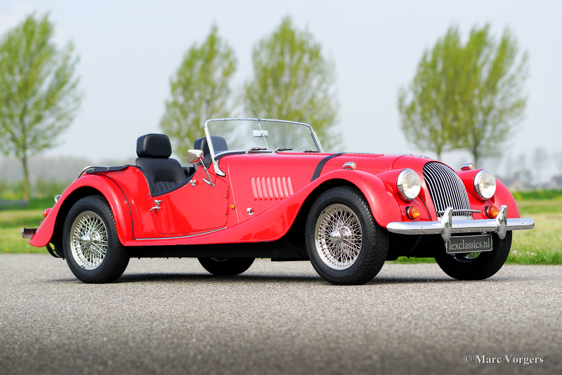 Morgan 4/4 1600, year 1988. Colour red with a black leather interior. This wonderful Morgan was sold new in the Netherlands. This Morgan is in a superb original condition and the car drove only 34.764 km from new. The automobile features chrome wire wheels, two door mounted rear-view mirrors, a walnut dashboard, black soft-top, tonneau cover and a leather strap across the bonnet. This is a top-specimen!