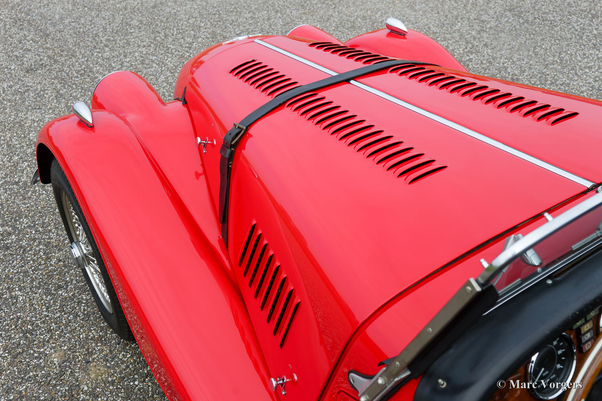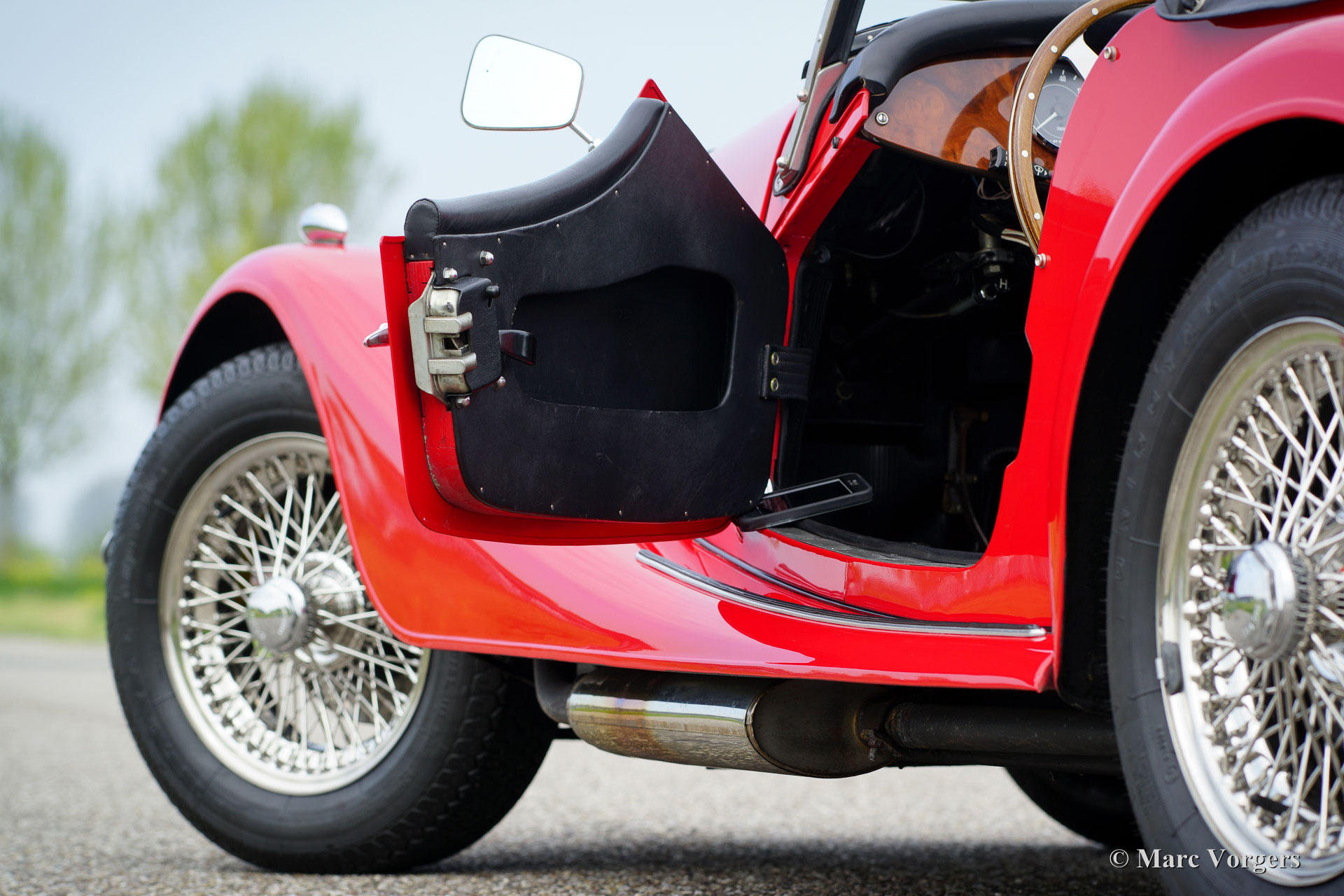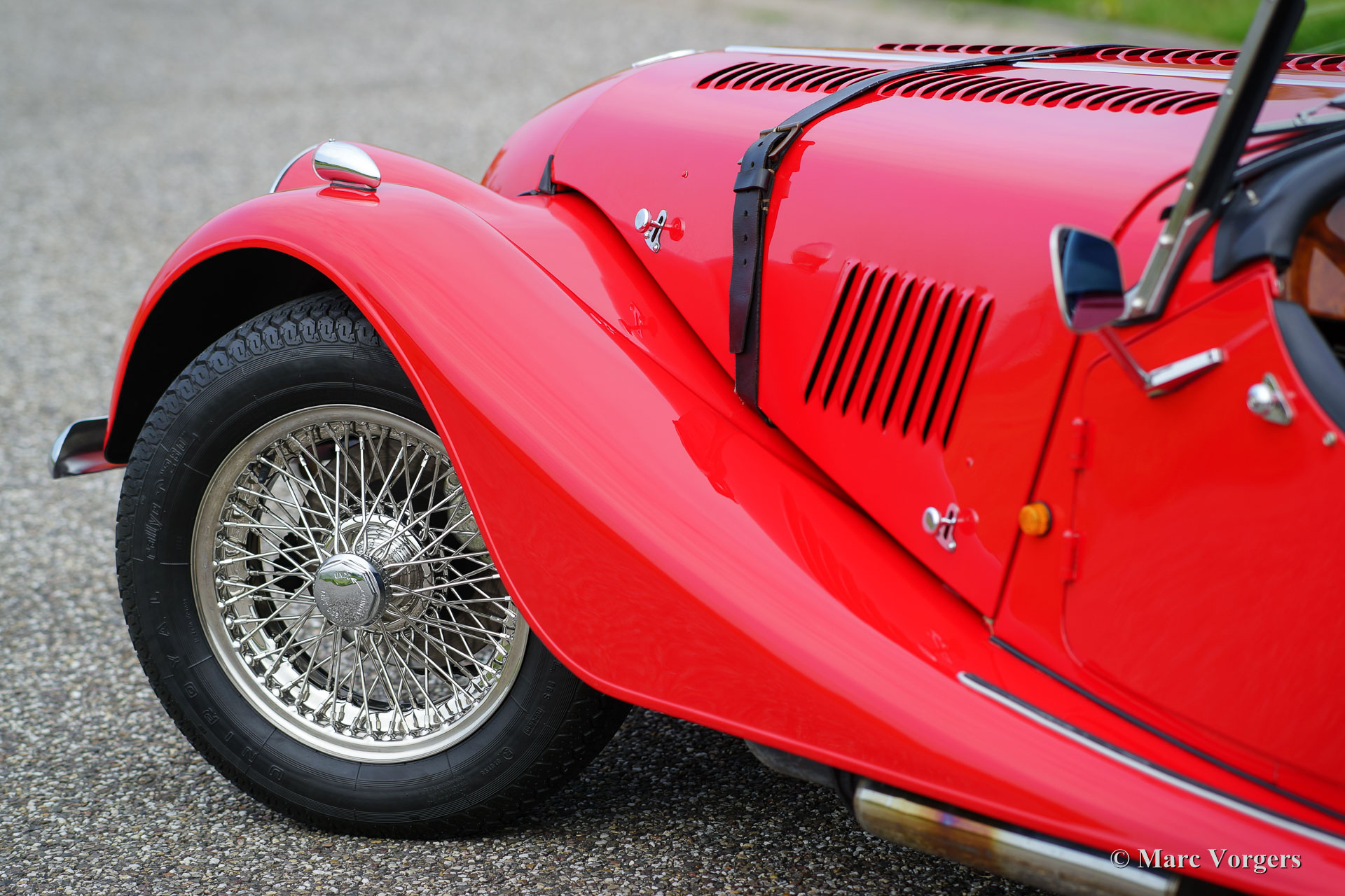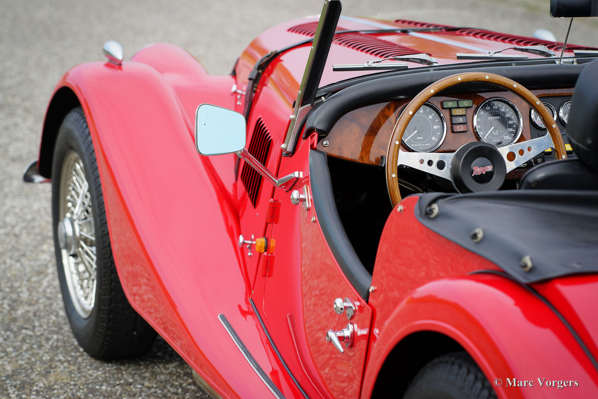 Morgan 4/4 1600, year 1988. Colour red with a black leather interior. This wonderful Morgan was sold new in the Netherlands. This Morgan is in a superb original condition and the car drove only 34.764 km from new. The automobile features chrome wire wheels, two door mounted rear-view mirrors, a walnut dashboard, black soft-top, tonneau cover and a leather strap across the bonnet. This is a top-specimen!